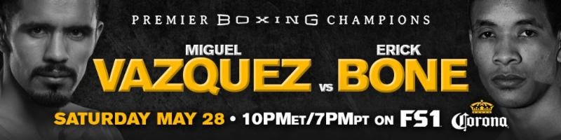 Televised coverage begins at 10 p.m. ET/7 p.m. PT and is headlined by former world championMiguel Vazquez battling tough contender Erick Bone in a 10-round super lightweight showdown.