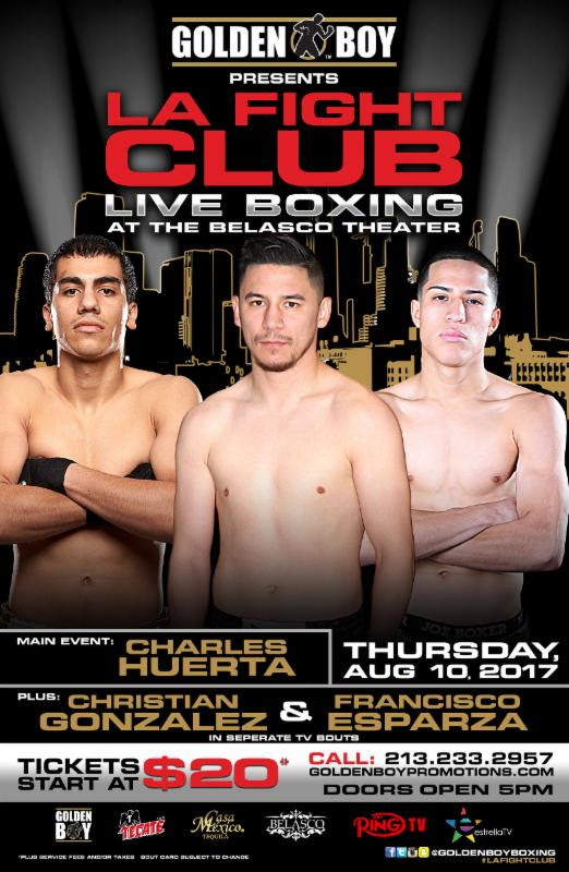 LOS ANGELES – Fans were stunned when Charles Huerta (19-5, 12 KOs) scored a massive upset in a third round knockout over Ivan Delgado on the April 14th edition of LA FIGHT CLUB. Now, the proud Paramount, CA native will look to draw even more masses as he steps up to take on a soon to-be-announced opponent on August 10 in an eight-round super featherweight fight from the Belasco Theater televised live on Estrella TV’s Boxeo Estelar. In the co-main event, Christian “Chimpa” Gonzalez (16-1, 14) representing Buena Park, CA will take on rugged Monterey, Mexico fighter Daniel Perales (10-10-1, 5 KOs) in an eight-round lightweight bout. Fighting in his eighth professional bout at the Belasco Theater, “Chimpa” is returning to the ring following a loss to Romero Duno onMarch 10 at LA FIGHT CLUB.