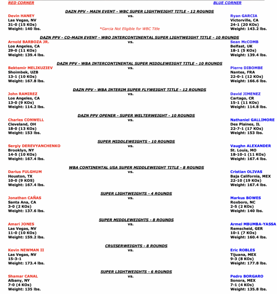 Haney vs. Garcia is a 12-round fight for the WBC Super Lightweight World Championship that is presented by Golden Boy Promotions in association with Haney Promotions, KingRy Promotions, and Matchroom Boxing. The event will take place on Saturday, April 20 on DAZN PPV live from Barclays Center in Brooklyn, New York.