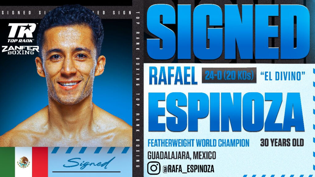 LAS VEGAS (June 12, 2024) – Unbeaten WBO featherweight world champion Rafael “El Divino” Espinoza has inked a multi-fight co-promotional agreement with Top Rank, who will work alongside Zanfer Promotions.