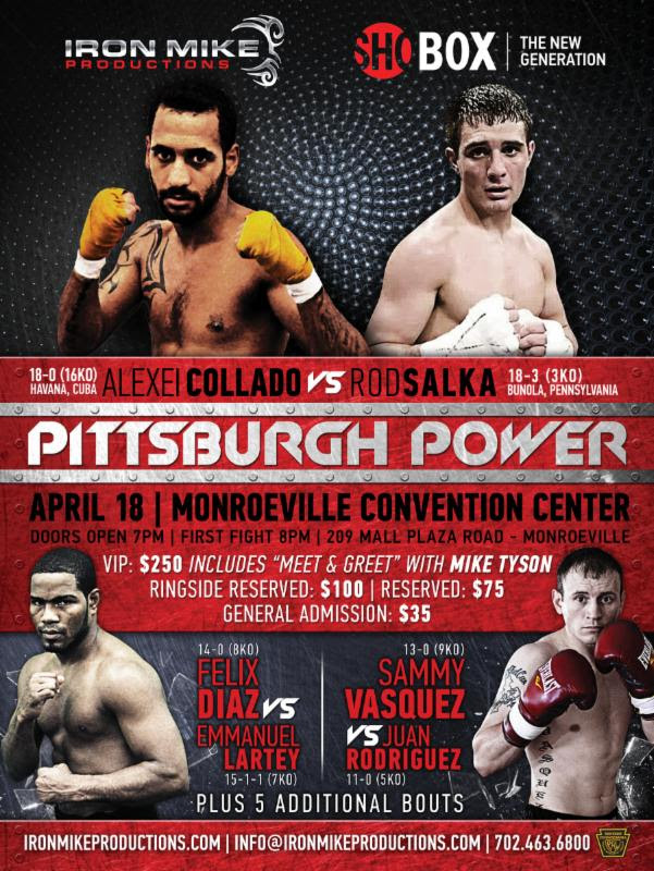 Explosive Cuban southpaw Alexei “The Hurricane” Collado (18-0, 16 KOs), of Miami, Fla., by way Cork, Ireland, and Havana, Cuba, faces Pittsburgh-area crowd favorite “Lightning” Rod Salka (18-3, 3 KOs), of Bunola, Pa., in the 10-round main event for the vacant WBC Interim FECARBOX title.