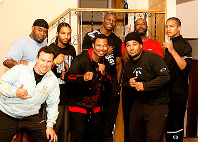 The Mosley Tribe. Top row from left to right: Naazim Richardson (trainer), Karl “Dynamite” Dargan (sparring partner), Steve “USS” Cunningham (cruiserweight and fellow fighter), Elliott Ness (security), Shane Mosley Jr. (Mosley’s son and amateur welterweight fighter). Bottom row from left to right: Gustavo Satragni (fitness trainer and massage therapist), WBA Welterweight World Champion Sugar Shane Mosley and Hassan Abdulrahim, Jr. (training camp coordinator/supervisor).