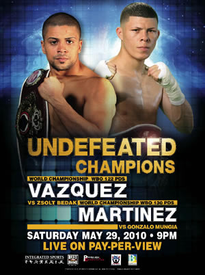 HOBOKEN, N.J. (April 13, 2010) – Integrated Sports Media, North America’s undisputed champion of major pay-per-view boxing distribution, announced today that it’ll be involved in the May 29th “Unbeaten Champions,” featuring three world title fights live from Bayamon, Puerto Rico.