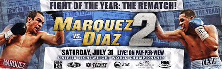 Marquez vs. Diaz II “Fight of the Year: The Rematch” is promoted by Golden Boy Promotions in association with Marquez Boxing Promotions, and sponsored by Cerveza Tecate and AT&T.  The 12-round rematch of the “2009 Fight of the Year” is scheduled for Saturday, July 31 at the Mandalay Bay Events Center in Las Vegas, and will be for Marquez’s Ring Magazine, WBA and WBO Lightweight World titles.  The fight will be produced and distributed live on HBO Pay-Per-View® beginning at 9 p.m. ET/ 6 p.m. PT.