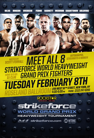 Tuesday, Feb. 8 — Open-to-the-public/media Fan Experience at New York’s Roseland Ballroom (239 W. 52nd Street just West of Broadway, NYC) from 4-6 p.m. (Doors open at 3:30), hosted by Scott Ferrall with special guest deejay, DJ Clue. All eight tournament entrants — Fedor, STRIKEFORCE Heavyweight World Champion Alistair Overeem, former heavyweight champions Antonio “Big Foot” Silva and Andrei Arlovski, Brazilian Jiu-Jitsu specialist Fabricio Werdum, hard-hitting Brett Rogers, talented Josh Barnett and Russian star Sergei Kharitonov will participate.