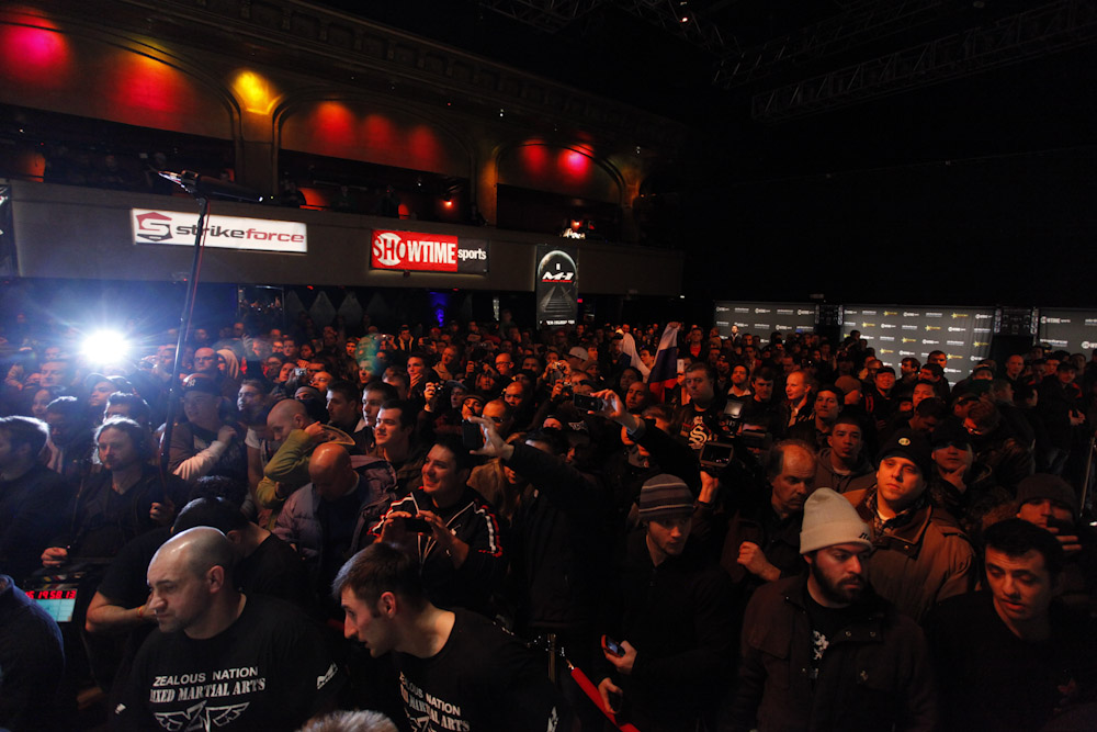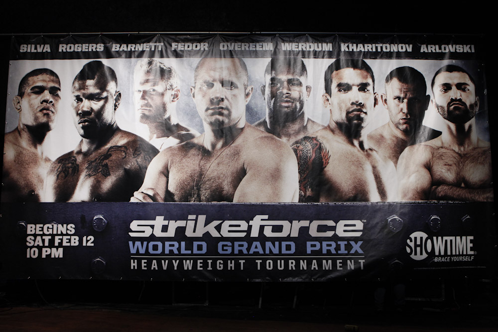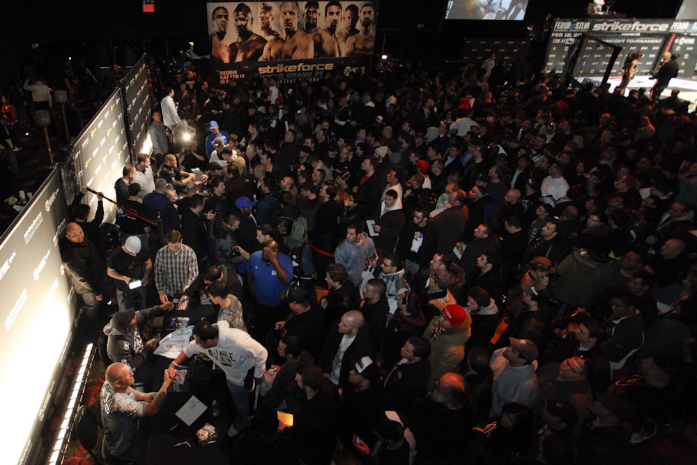 Seven hours before the doors would open for the STRIKEFORCE Grand Prix Fan Experience Tuesday, a long line began to form outside the Roseland Ballroom in New York City. Once inside, the approximately 1,500 MMA fans who jammed the venue for the event were treated to a spectacular afternoon they will not soon forget. All eight fighters who will compete in the eagerly awaited STRIKEFORCE World Grand Prix — Heavyweight Tournament were in attendance and signed autographs, answered questions from emcee Scott Ferrall and posed for photos. There were ticket, T-shirt and STRIKEFORCE fight gear giveaways, fight videos shown on giant television screens, workouts in the cage and photo opportunities with The Rockstar Girls. Music was provided by special guest deejay, DJ Clue. The STRIKEFORCE World Grand Prix — Heavyweight Tournament begins this Saturday, Feb. 12, live on SHOWTIME® (10 p.m. ET/PT, delayed on the West Coast) with two quarterfinal fights from the IZOD Center in East Rutherford, N.J. The first live, non-televised undercard bout starts at 7:30 p.m. ET.