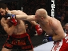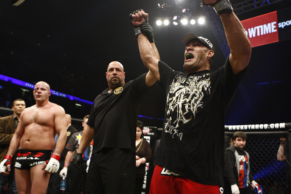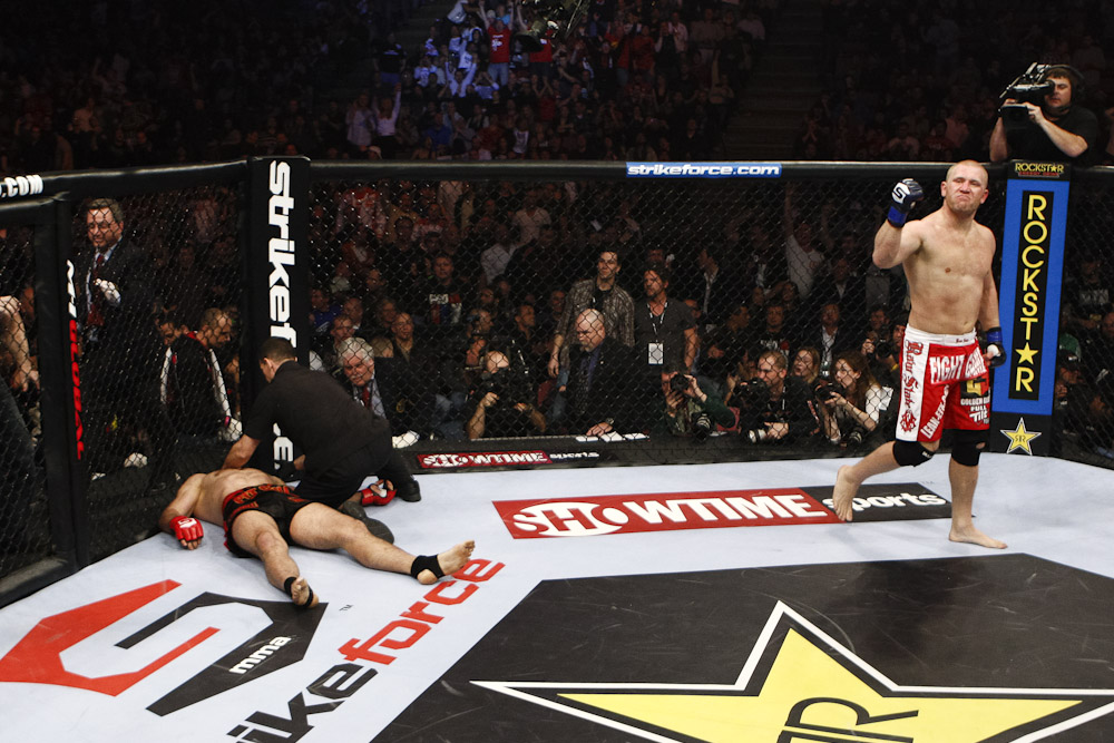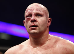 After a close first round in a STRIKEFORCE and M-1 Global main event, Silva dominated the second. At the conclusion of the round, Fedor’s face was swollen, badly bruised and he could not see out of his right eye. Moments later, the doctor halted the fight.
