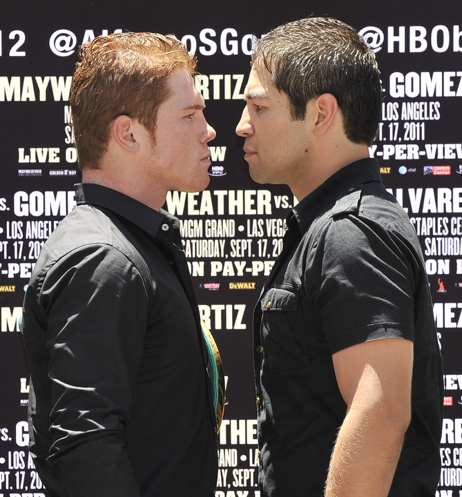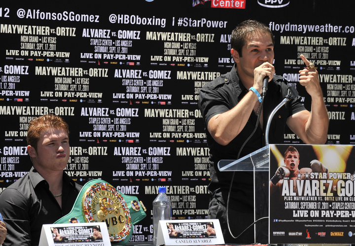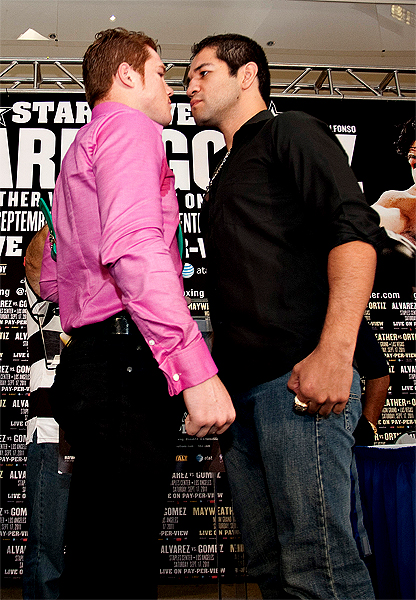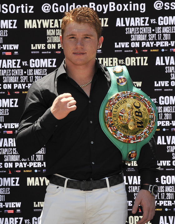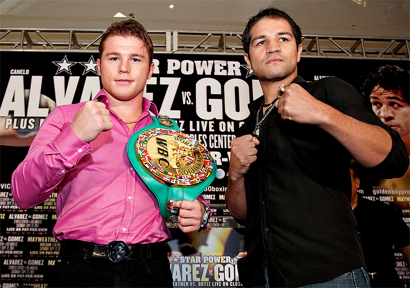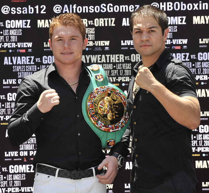 WBC Super Welterweight World Champion Canelo Alvarez (Left) and super welterweight contender Alfonso Gomez (Right) pose on July 26, 2011 in Los Angeles, California at the press conference to officially announce their September 17, 2011 world title fight.