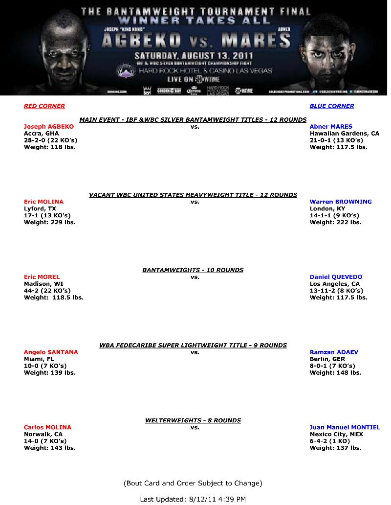 WEIGHTS FOR AGBEKO VS. MARES SHOWTIME BANTAMWEIGHT FINAL – LIVE FROM HARD ROCK HOTEL & CASINO LAS VEGAS Isaac Barrio / August 13, 2011 WEIGHTS FOR AGBEKO VS. MARES