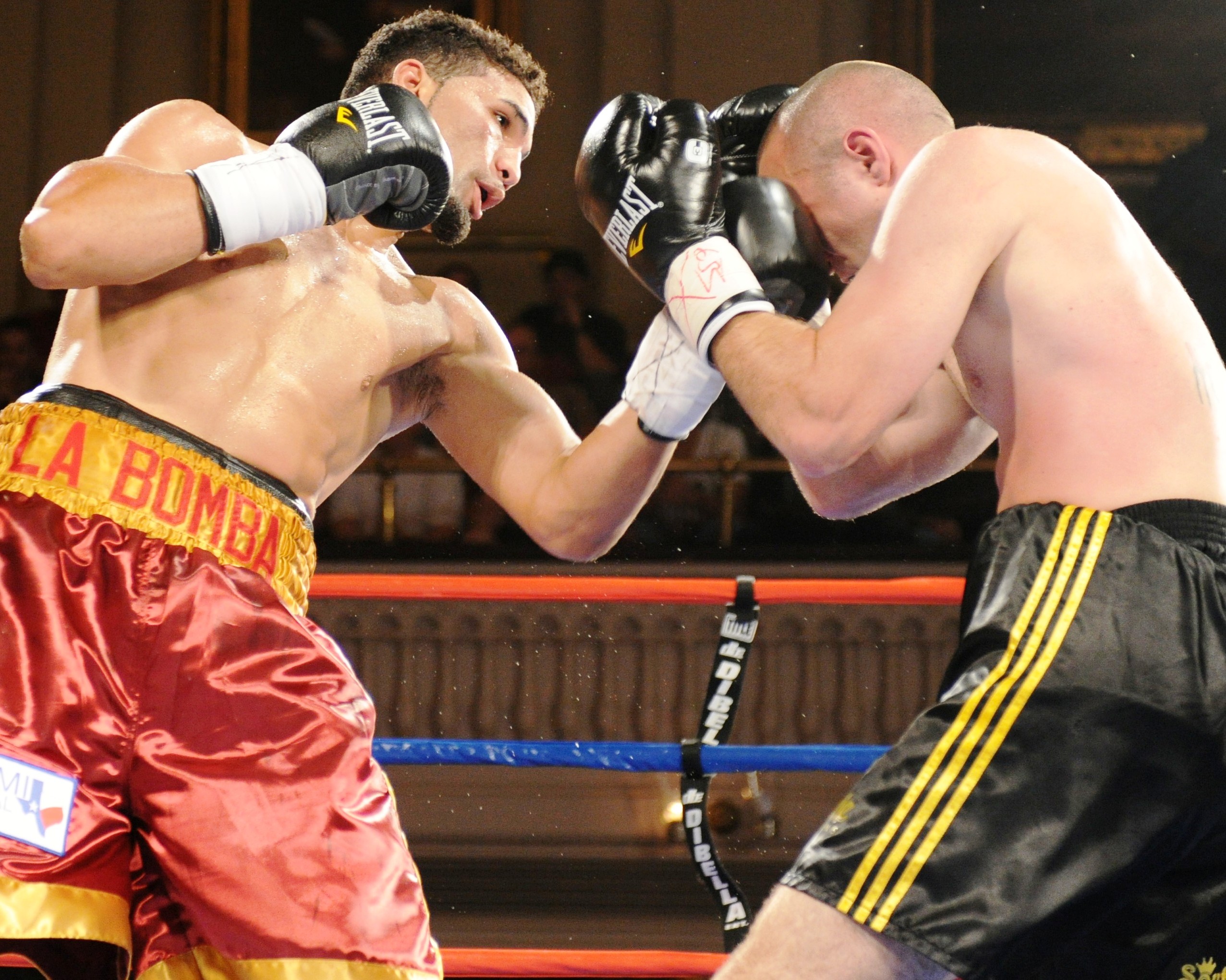 Displaying more boxing skills and patience under for his new head trainer Ronnie Shields, Rodriguez outclassed a game Traietti (10-3, 6 KOs), who is an Iraq War veteran and college graduate.Edwin dropped a few right-handed bombs on Traietti in the opening round and a devastating right hand to Traietti’s ribs (left) left him unable to breathe properly and unable to answer the bell for the third.