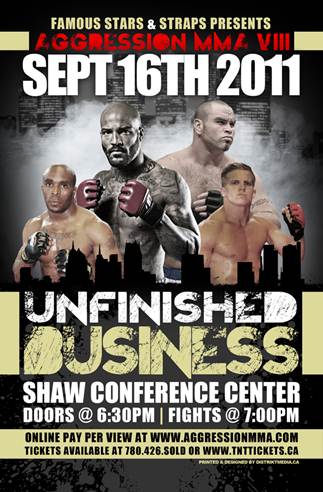 Edmonton, Alberta (Canada) – One of Canada’s top fight promotions today released its fight card for its upcoming September 16th event, as Aggression MMA announced opponents for Ryan “The Real Deal” Ford, Tim “Thrashing Machine” Hague, and Freddy Assuncao. In addition, a featherweight title match between top Canadian 145-pounder Adam Lorenz and UFC veteran Alvin “The Kid” Robinson has been added to the night’s fights. “Unfinished Business” will be broadcasted live across the globe through online Pay-Per-View at www.AggressionMMA.com.