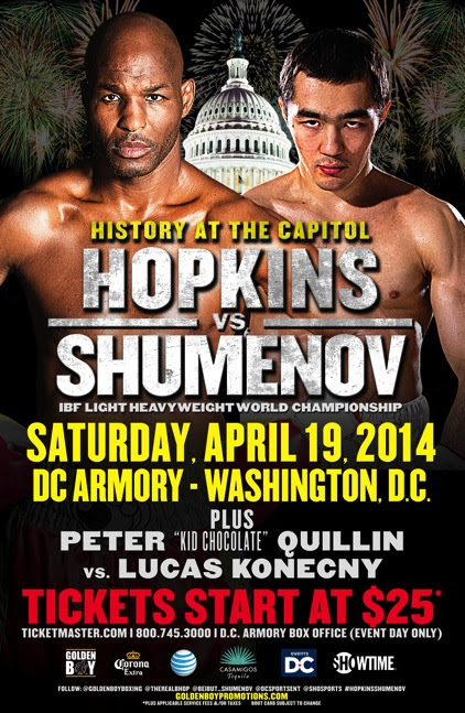 Hopkins vs. Shumenov, a 12-round fight for the IBF, IBA and WBA Light Heavyweight World Championship, will take place Saturday, April 19 at the DC Armory in Washington, D.C. The event is promoted by Golden Boy Promotions and sponsored by Corona, AT&T and Casamigos Tequila. In the co-features, Peter Quillin puts his WBO Middleweight World Title on the line against Lukas Konecny in a 12-round bout and Shawn Porter faces Paulie Malignaggi in a 12-round welterweight bout for his IBF World title. The live SHOWTIME CHAMPIONSHIP BOXING® telecast will begin at 9 p.m. ET/PT (delayed on the West Coast) and will be available in Spanish via secondary audio programming (SAP).