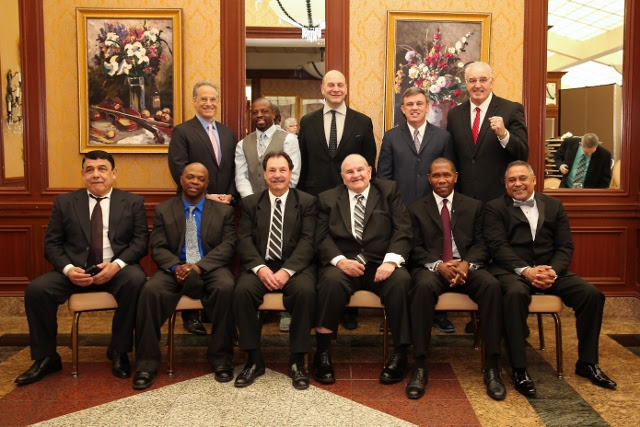 (L-R) Seated – Mustafa Hamsho, Tracy Patterson, Billy Backus, Gene Moore, Howard Davis Jr and Juan LaPorte; Standing – Steve Farhood, Keven Kelley, Lou DiBella, Teddy Atlas and Gerry Cooney.