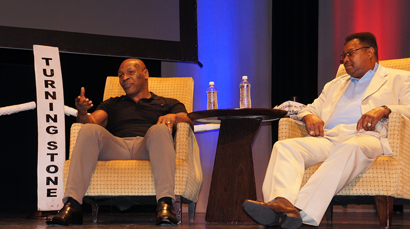 VERONA, NY – Turning Stone hosted “Kings of the Ring: A Conversation with Mike Tyson and Larry Holmes” today to promoted this week’s ESPN Friday Night Fights (see fact sheet below), promoted by Iron Mike Productions, at the resort casino in upstate New York.Longtime sports columnist for the Syracuse Post-Standard and Syracuse.com, Bud Poliguin, served as the moderator, asking the two Hall of Famers and world heavyweight champions a series of questions, before the floor was opened for the many fans in attendance to ask Tyson and Holmes questions.