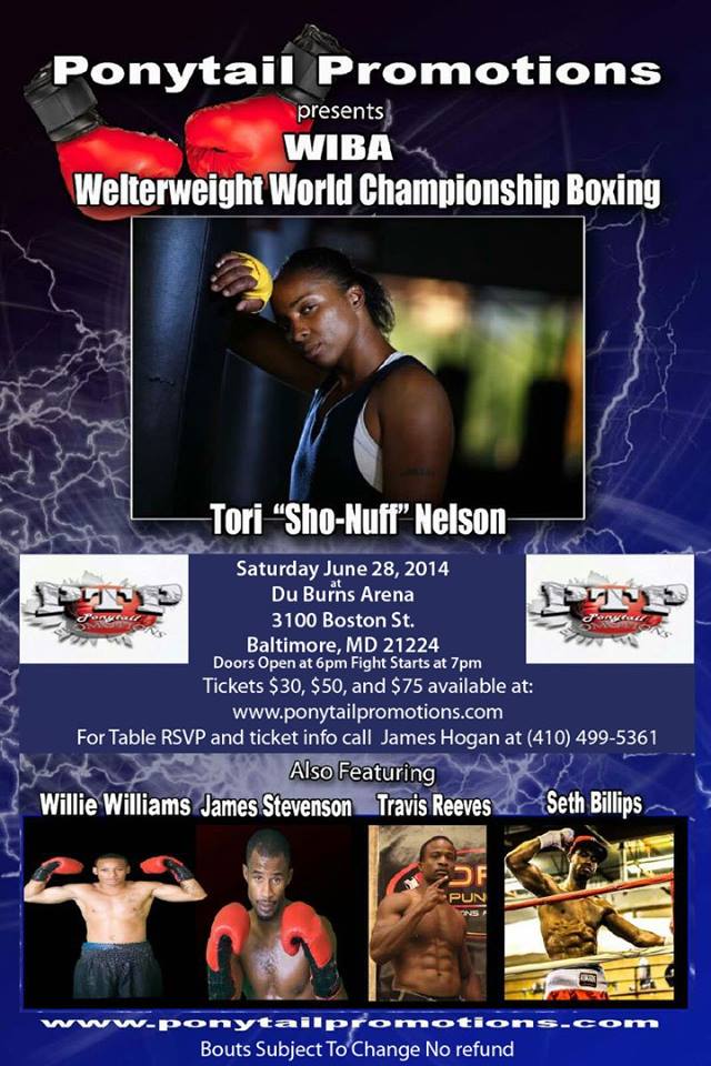 Baltimore, MD – Undefeated multi-division world champion Tori “Sho Nuff” Nelson will defend her WIBA welterweight belt against longtime contender Nicole Woods Saturday, June 28 in the main event a Ponytail Promotions card at the Du Burns Arena.