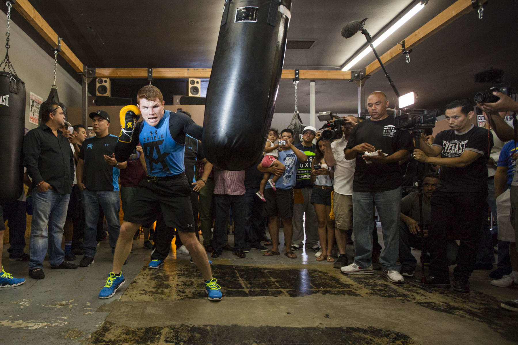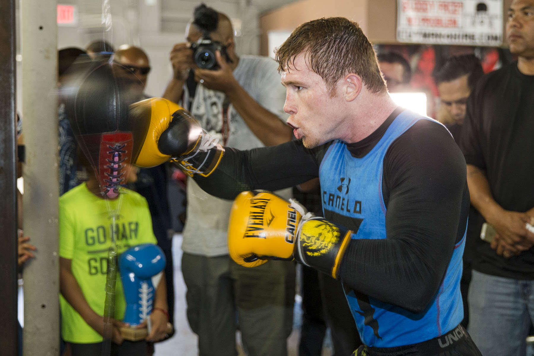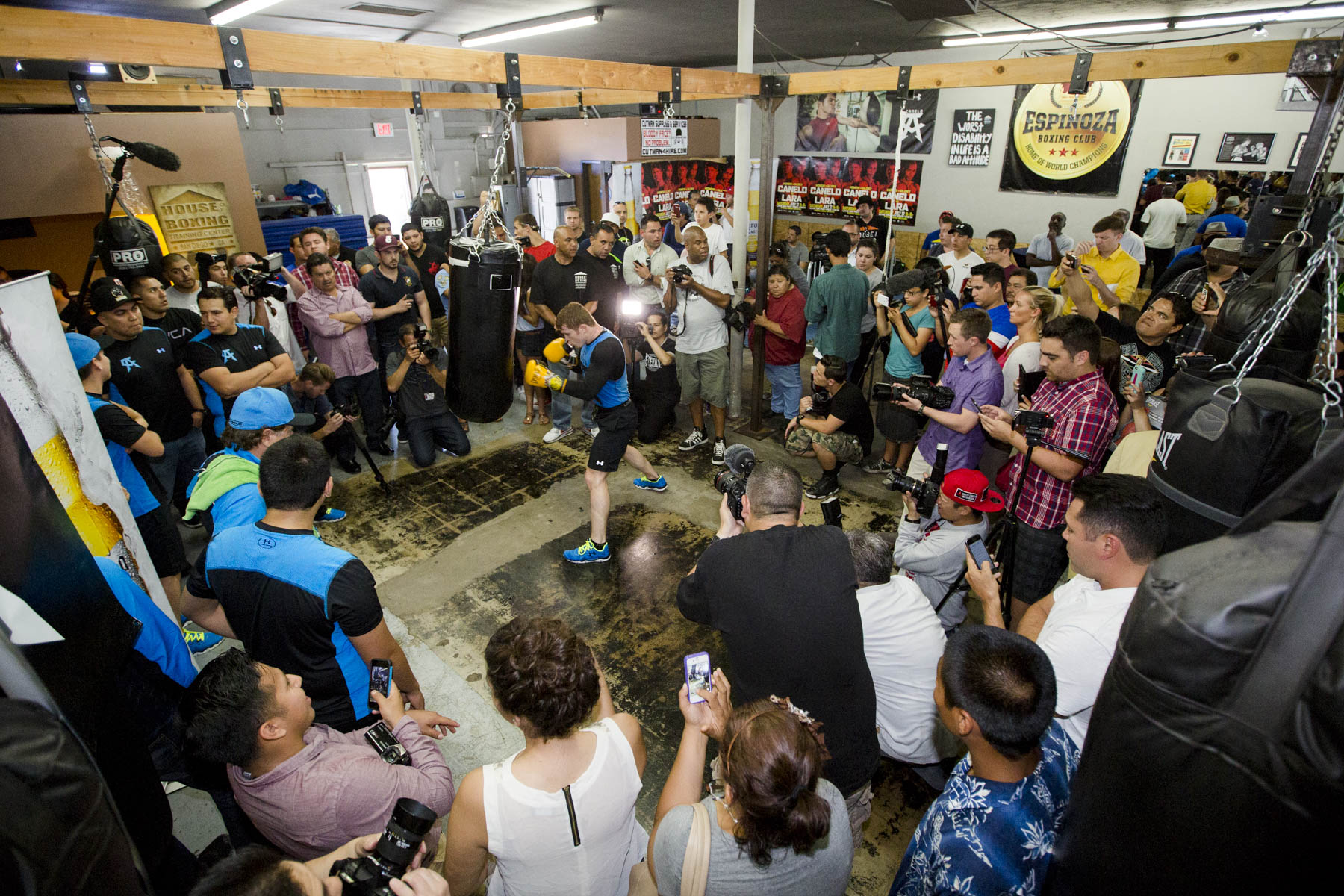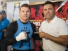 Tuesday, Canelo spent more than two hours at the House of Boxing. He worked up a heavy sweat during a spirited, 75-minute-plus workout that consisted of jumping rope, shadow-boxing, smacking the heavy bag, hitting the double-ended bag and working the speed bag. Before and after, he did interviews, signed autographs, posed for photos and mingled with his many fans.