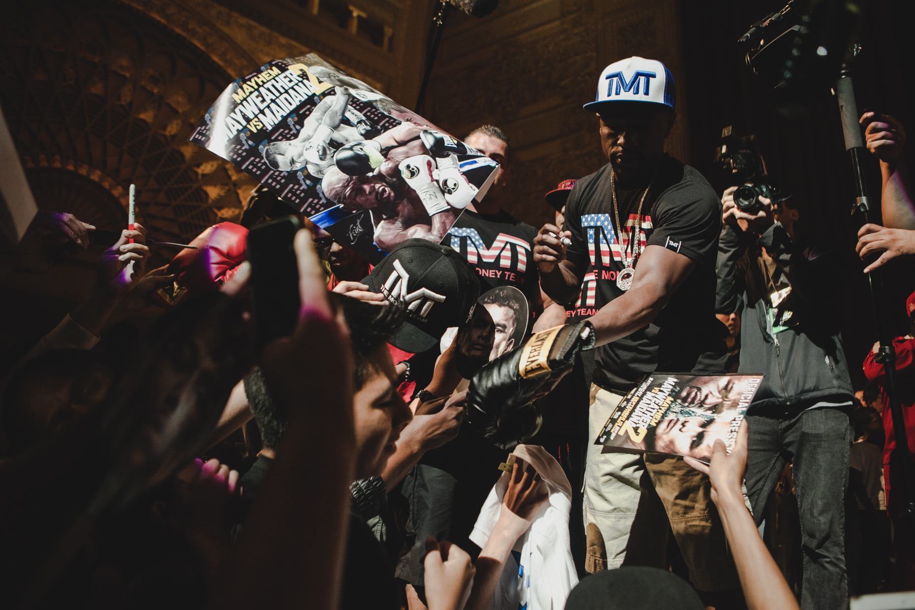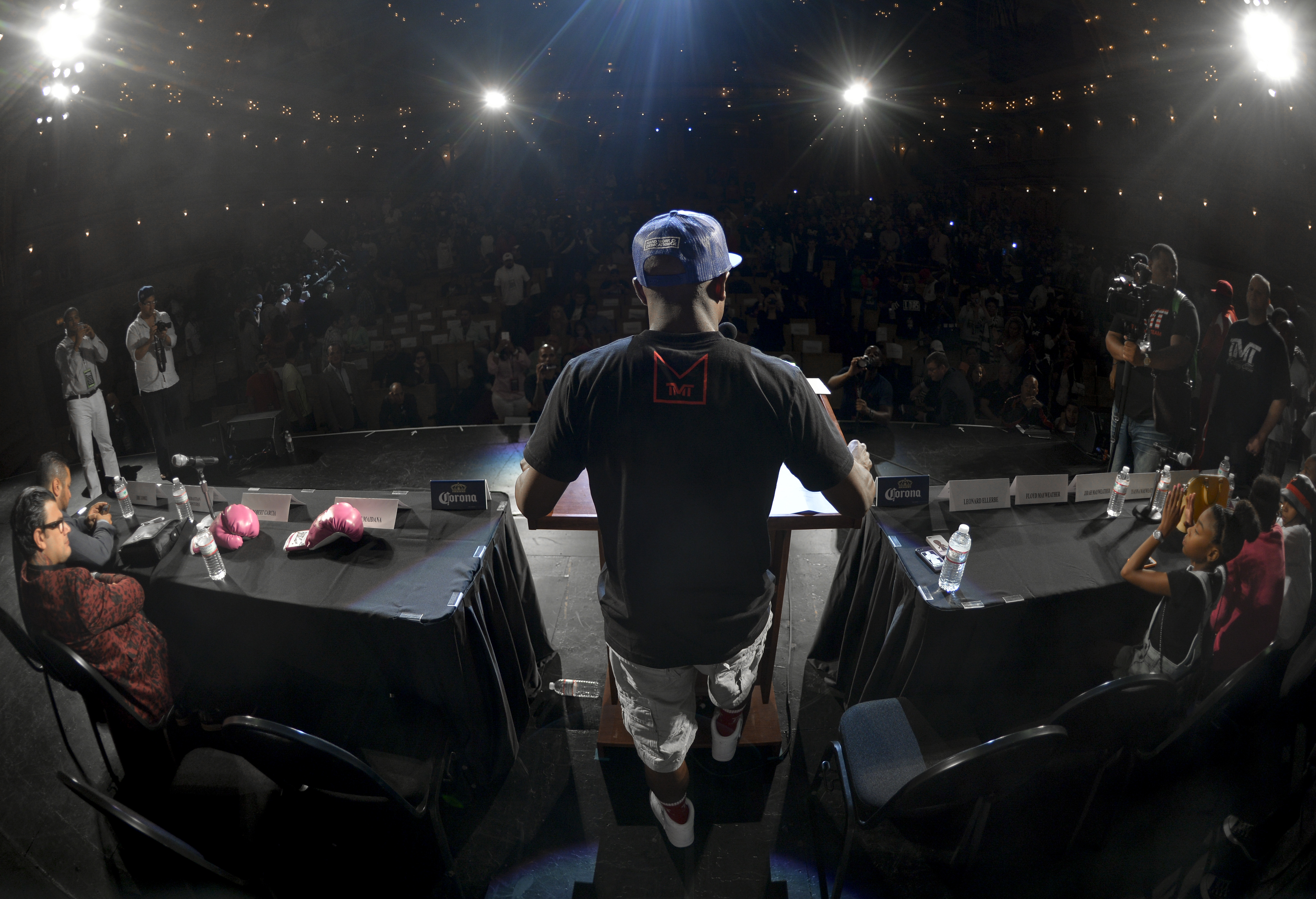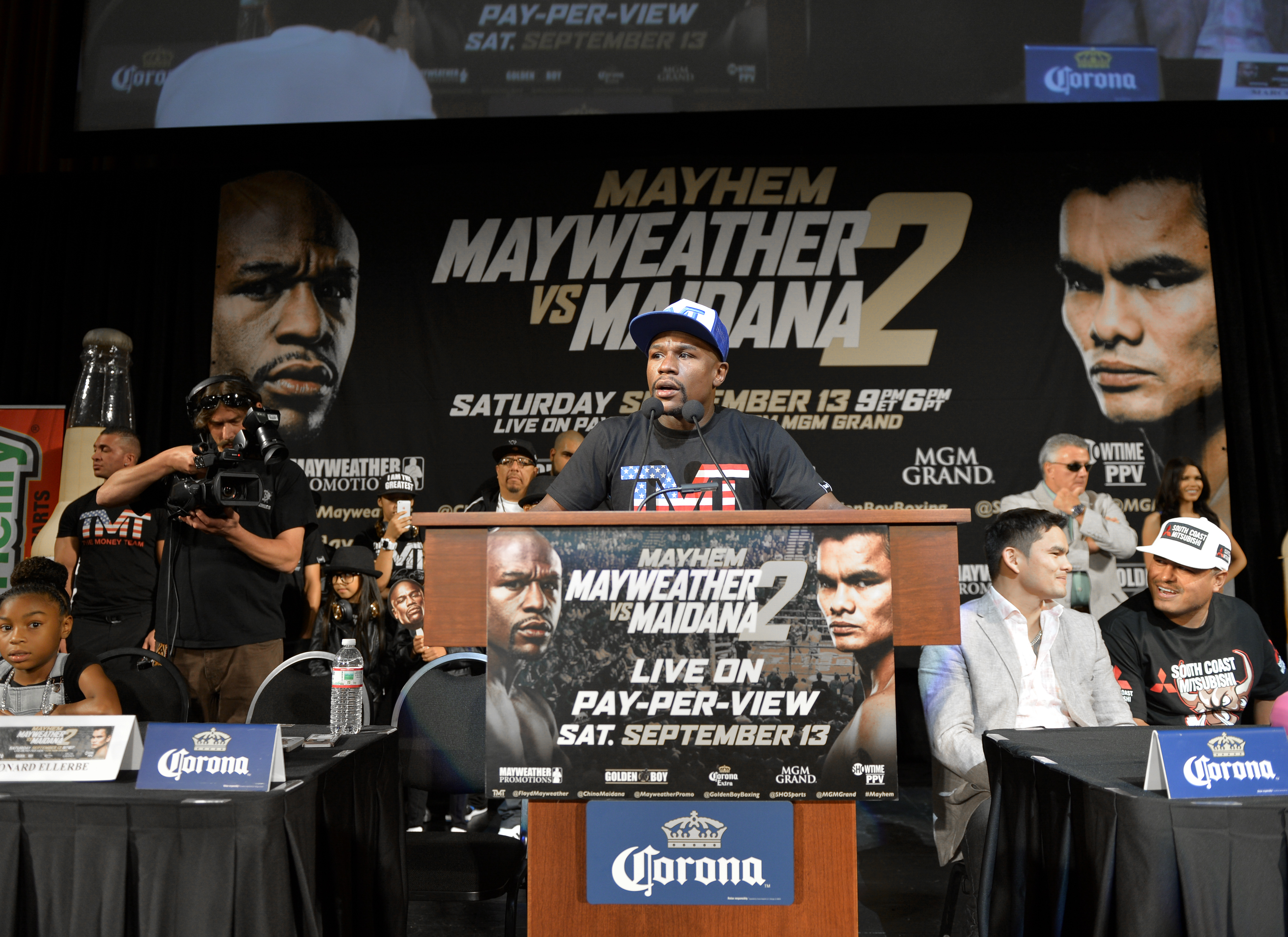 Eleven-time world champion Mayweather refused to sit down as Maidana and his trainer,Robert Garcia, took their turn at the podium. Instead, he signed autographs for fans, taunted Garcia and chanted his signature line: “Hard work, dedication.”