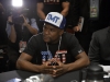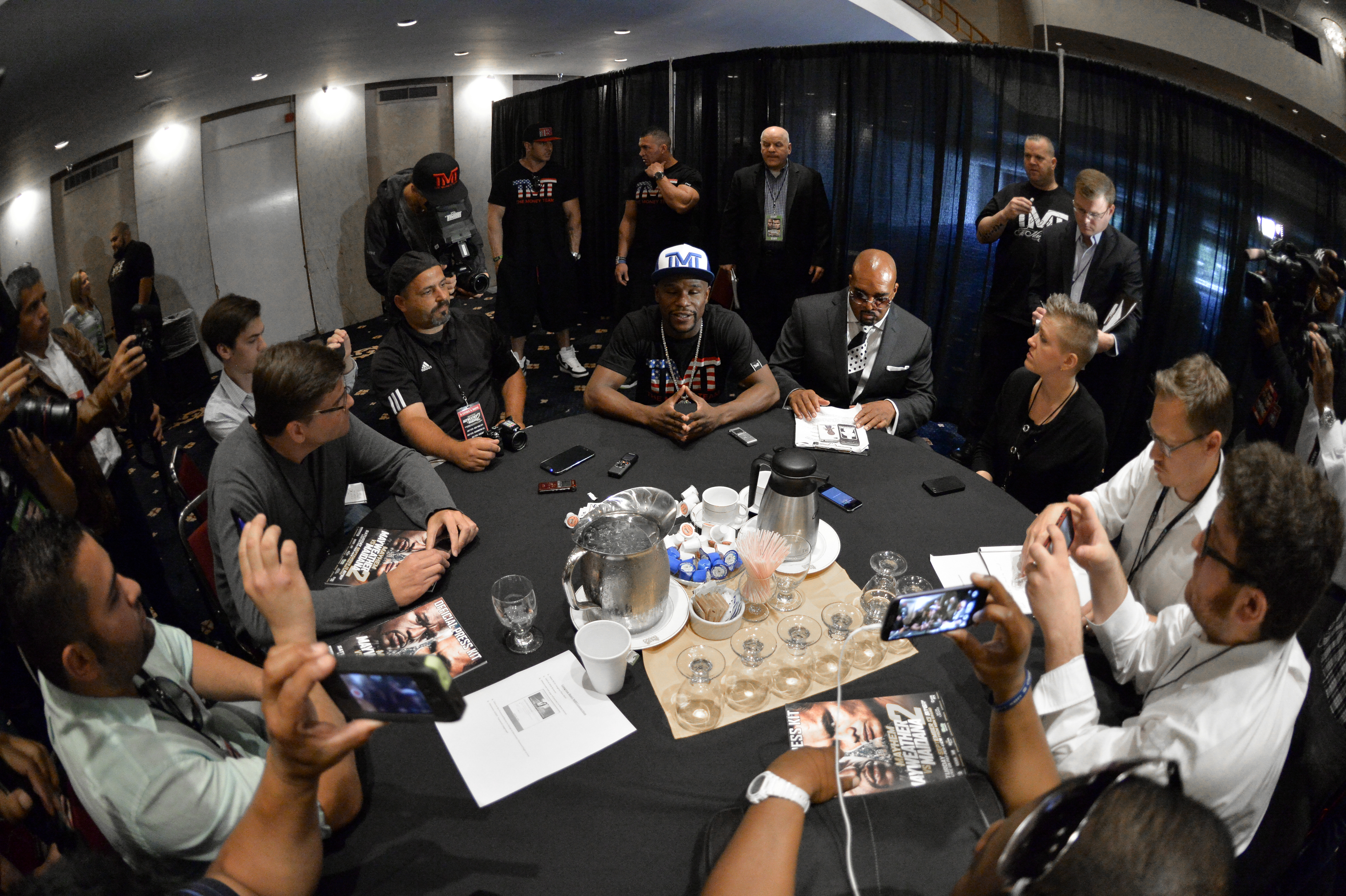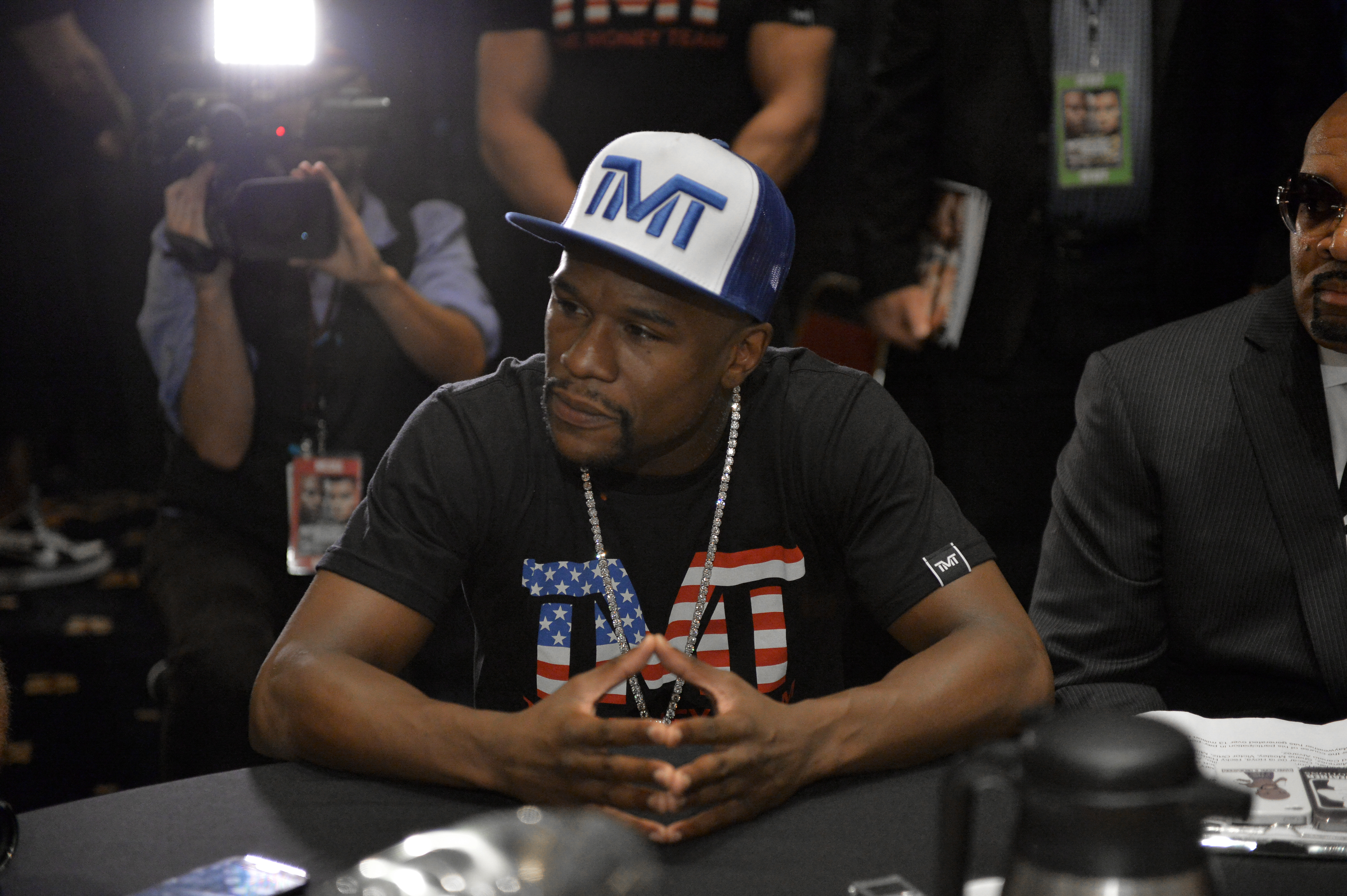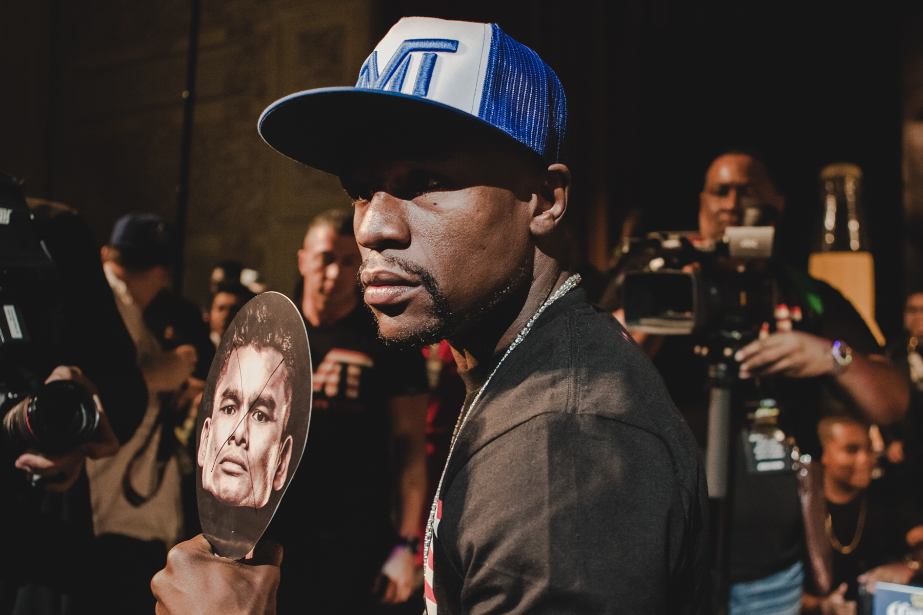 Eleven-time world champion Mayweather refused to sit down as Maidana and his trainer,Robert Garcia, took their turn at the podium. Instead, he signed autographs for fans, taunted Garcia and chanted his signature line: “Hard work, dedication.”