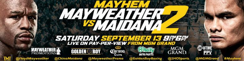 “MAYHEM: Mayweather vs. Maidana 2,“ a 12-round world championship bout for Mayweather’s 147-pound titles taking place Saturday, Sept. 13 at MGM Grand in Las Vegas, is promoted by Mayweather Promotions and Golden Boy Promotions and sponsored by Corona Extra and O’Reilly Auto Parts. The event will be produced and distributed live by SHOWTIME PPV and is the fourth fight of a lucrative six-fight deal with Showtime Networks Inc. Mayweather vs. Maidana 2 will be shown on the big screen in movie theaters across the country via Fathom Events. Information will be available at www.fathomevents.com.