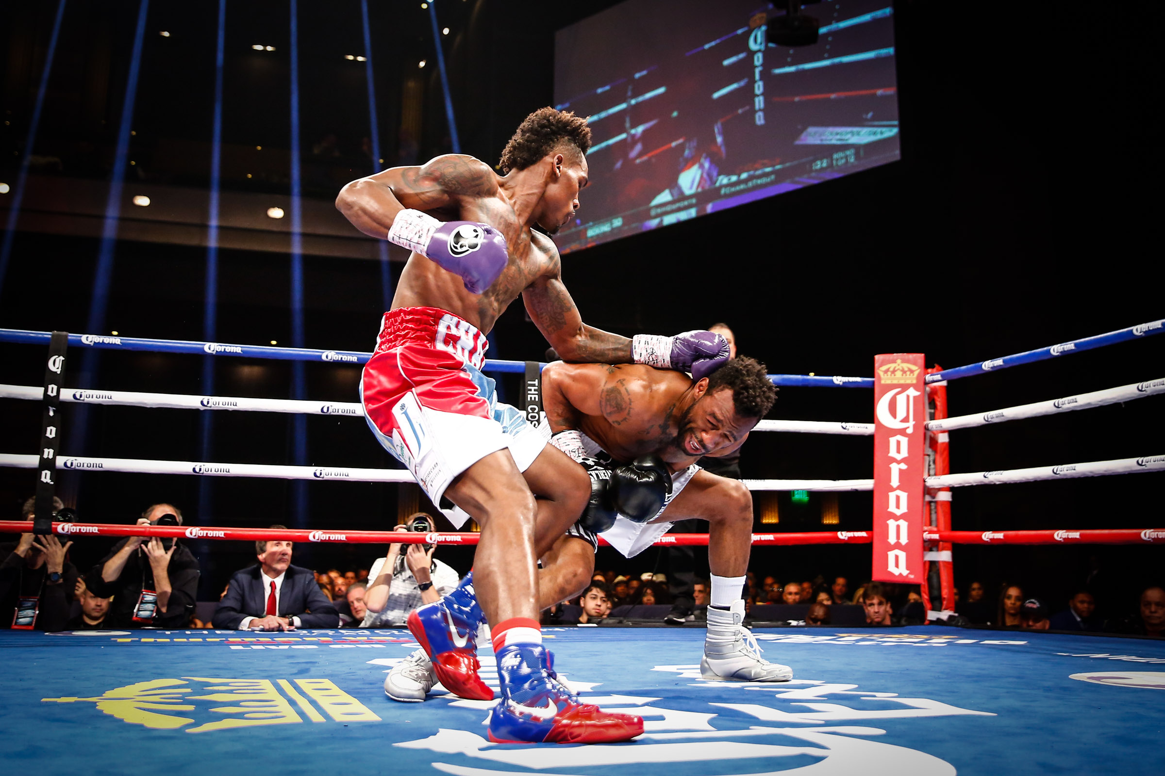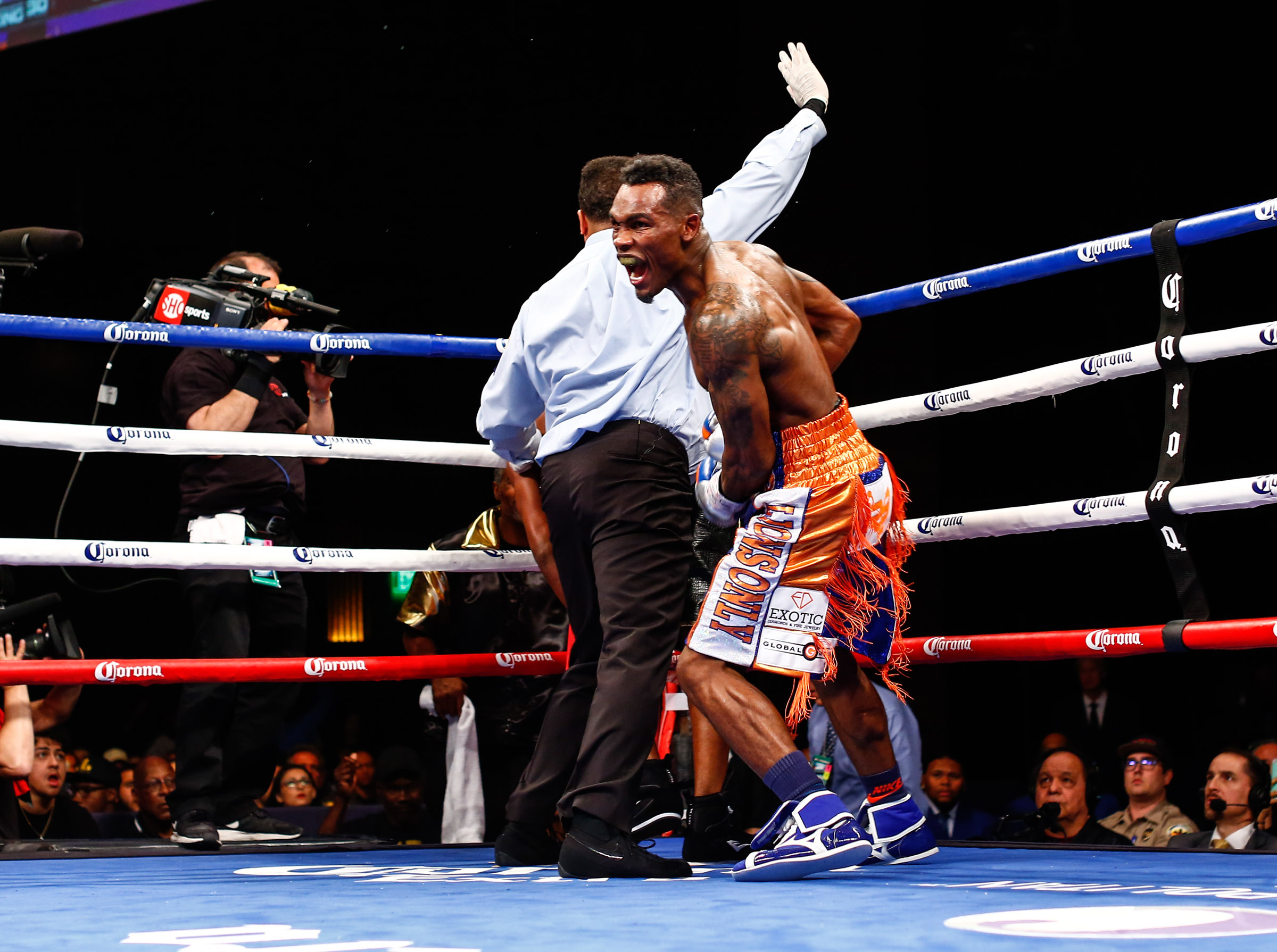 Two minutes into the eighth round, Jermell Charlo, trailing 69-64 on the three judges’ scorecards, landed a perfect counter right hand to Jackson’s left eye. As Jackson dropped his guard to insure his mouthpiece was in place, Jermell connected with two more right hands that sent Jackson falling forward into his corner. Defenseless and seemingly out on his feet, referee Tony Weeks stepped in immediately and stopped it at 0:51.