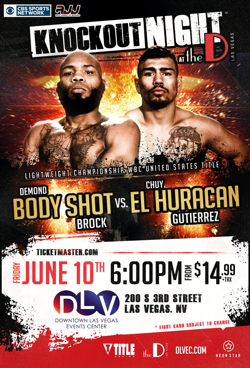 Demond Brock vs. Chuy GutierrezLAS VEGAS  –  An old-time grudge match between lightweights Demond “Body Shot” Brock and Chuy “Hurrican” Gutierrez will headline the third installment of the “Knockout Night at the D” series, Friday night, June 10, airing (11 p.m. ET / 8 p.m. PT) live on CBS Sports Network from the outdoor Downtown Las Vegas Events Center(DLVEC).