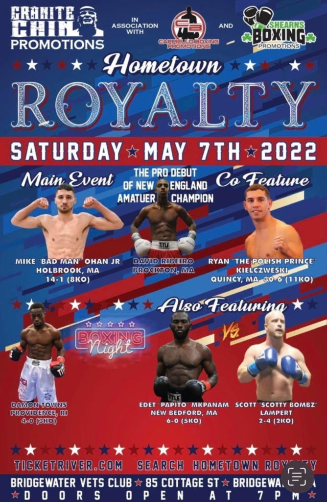 Former New England Welterweight Champion Mike “Bad Man Ohan, Jr. (14-1, 8 KOs), of Holbrook, MA, headlines “Hometown Royalty” in the 8-round main event against Argentinian opponent Jose “El Chino” Aubel (8-9, 7 KOs).