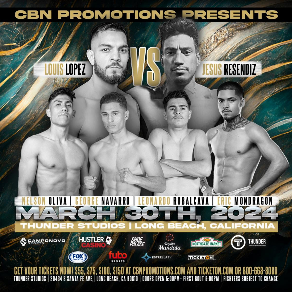 LONG BEACH, CA (March 25, 2024) – Welterweight Louie Lopez (14-2-2, 5 KOs), from Corona, CA, is gearing up for his upcoming fight against Jesus Resendiz (8-0-1, 6 KOs) from San Diego, CA. The scheduled 8-round bout will headline CBN Promotions’ March 30 card at Thunder Studios in Long Beach, California.