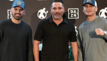 FRESNO, CALIF. (March 26, 2024) – Photo Credit: Golden Boy / Rebi Films U.S. Olympian and former unified super lightweight world champion Jose Ramirez (28-1, 18 KOs) and undefeated knockout monster and super welterweight world title contender Vergil Ortiz Jr. (20-0, 20 KOs) of Grand Prairie, Texas hosted a press conference in Fresno, California along with Chairman and CEO of Golden Boy Promotions Oscar De La Hoya.