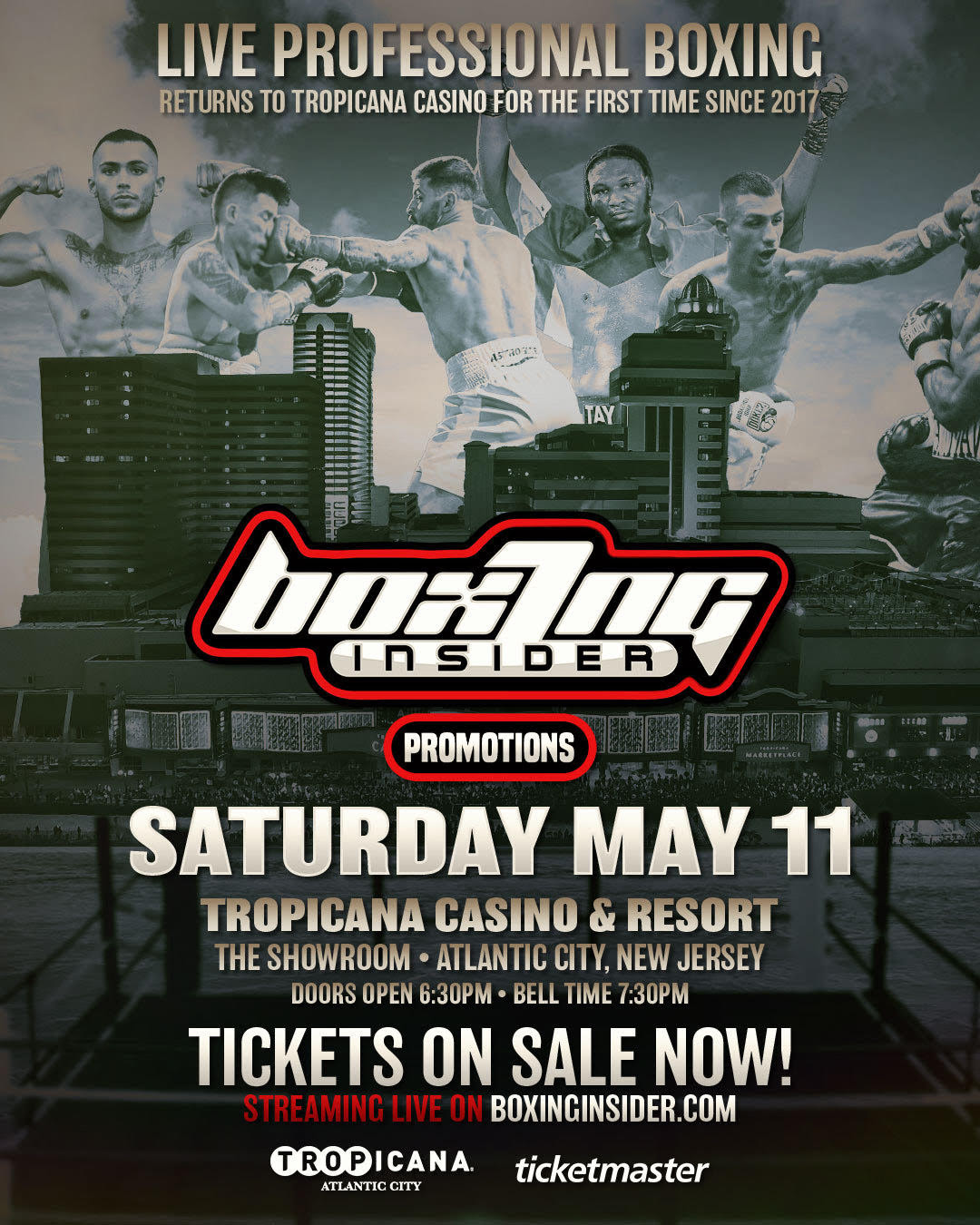 ATLANTIC CITY, NJ (April 3, 2024) — Boxing Insider Promotions is bringing boxing back to the Boardwalk at the Tropicana Hotel/Casino in Atlantic City. The date is Saturday, May 11, and begins at 7:30 PM in the Showroom. This is the Atlantic City debut for the company, which has been promoting shows at the legendary Sony Hall in New York City.