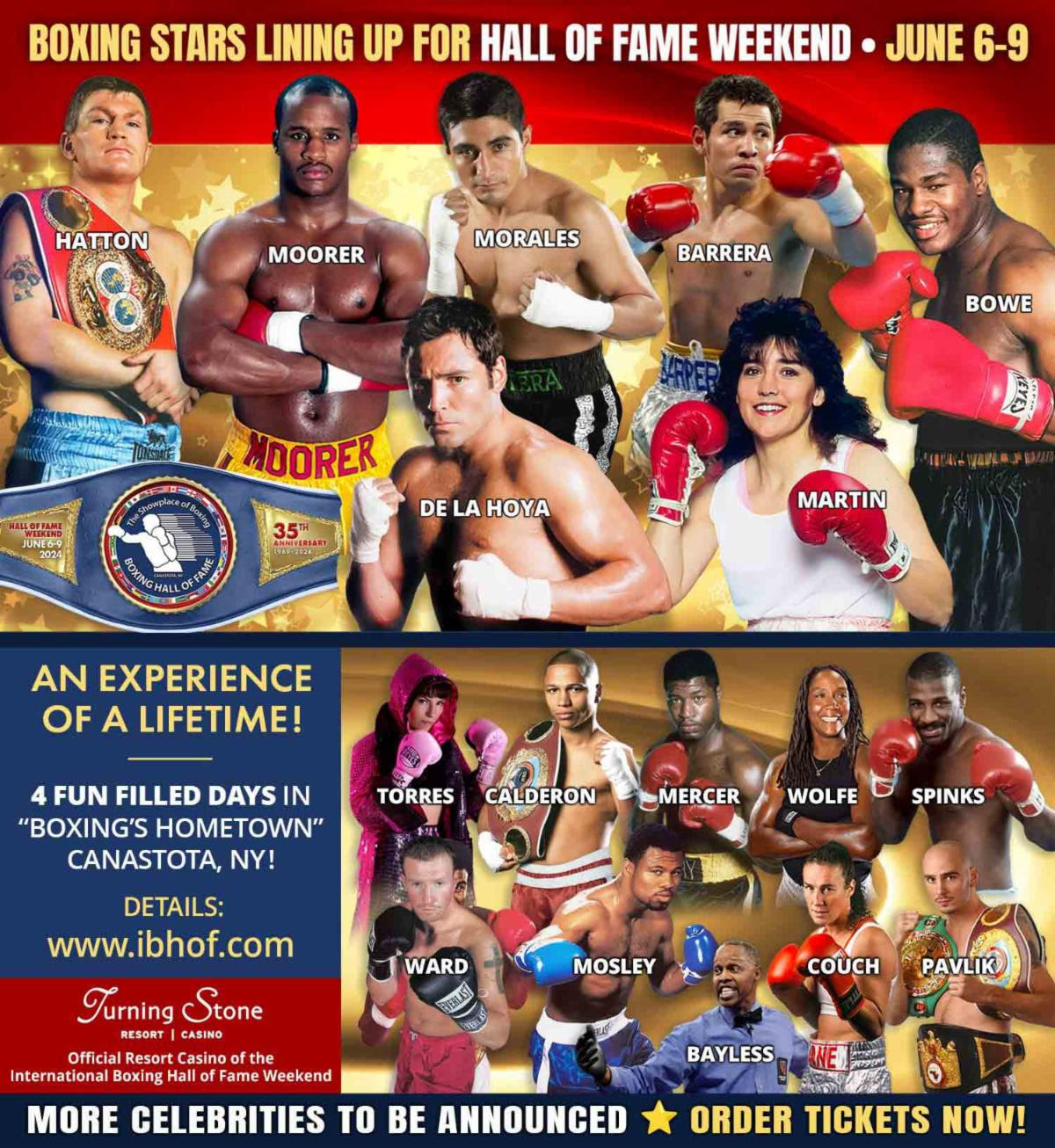 “The Hall of Fame is thrilled with the incredible lineup of boxing stars who will participate in this year’s Hall of Fame Weekend,” said Hall of Fame director Edward Brophy. “We can’t wait to welcome them and boxing fans from around the world to Canastota to celebrate the new class of inductees and the Hall of Fame’s 35th Anniversary.”