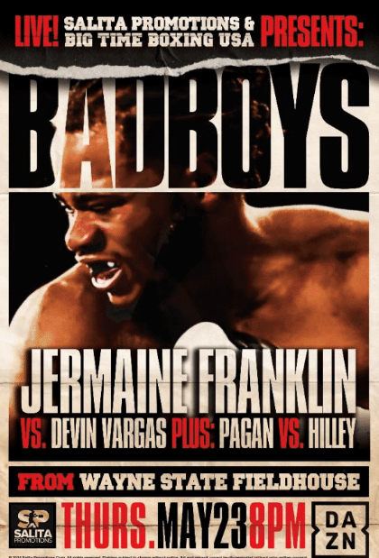 DETROIT – April 25, 2024 – Salita Promotions’ top American heavyweight Jermaine Franklin Jr. (22-2, 14 KOs) returns to his home state of Michigan to take on former US Olympian Devin Vargas (22-10, 9 KOs) from nearby Sylvania, OH, in the 10-round main event of the next installment of the “Big Time Boxing USA” boxing series on Thursday, May 23, from Wayne State Fieldhouse in Detroit and live on global premier sports platform DAZN (8 p.m. ET/5 p.m. PT).