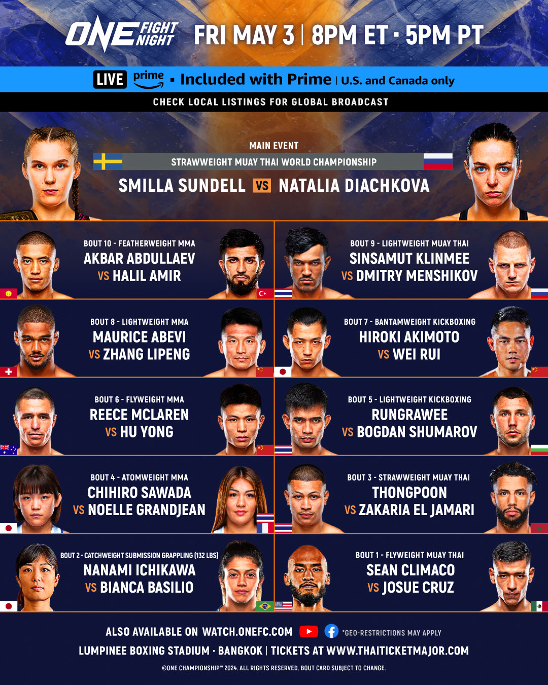 In the main event, ONE Women’s Strawweight Muay Thai World Champion Smilla Sundell defends her belt against dangerous Russian knockout artist Natalia Diachkova. The card also features IBJJF World Champion Bianca Basilio grappling with Japanese standout Nanami Ichikawa, and undefeated Shooto Atomweight MMA Champion Chihiro Sawada meets French-Thai judo black belt Noelle Grandjean.