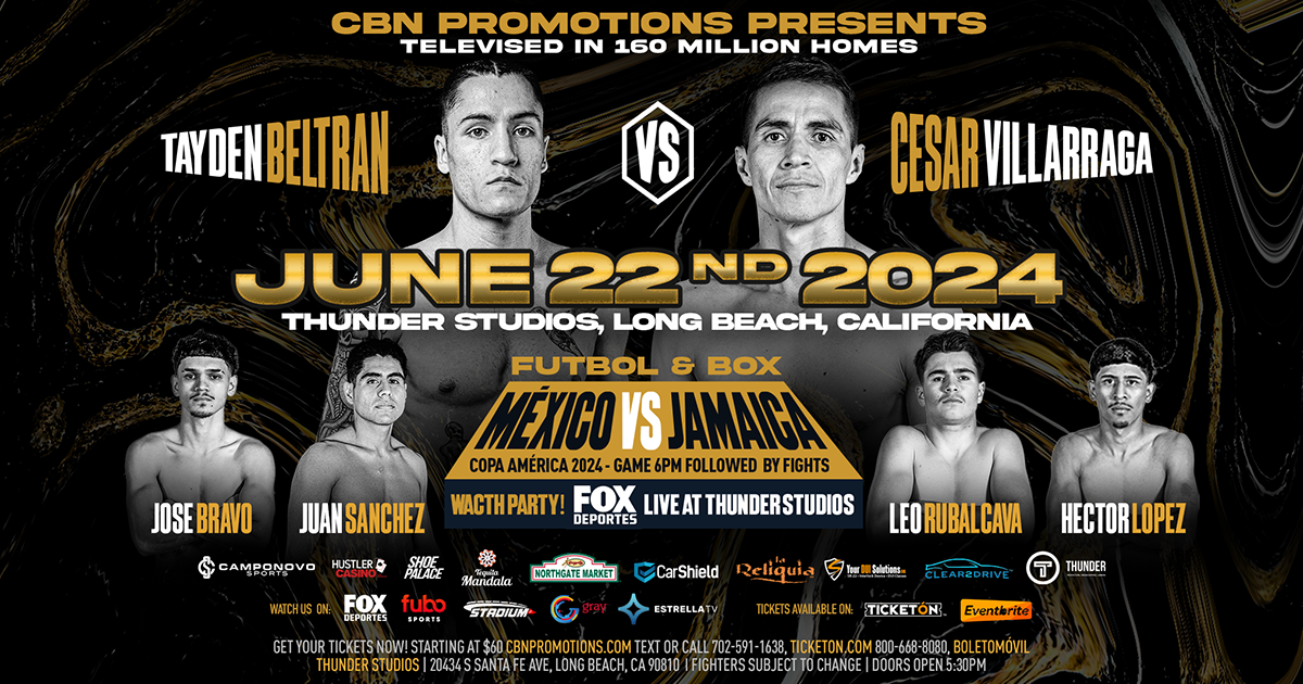 The entire event will be broadcast live in 160 million homes on Fubo Sports, Fox Deportes, Stadium, Gray TV, and tape delayed on Estrella TV. Doors open and at 5:30 pm PT and the festivities will commence with a live WATCH PARTY showing MEXICO vs. JAMAICA for the COPA AMERICA 2024 beginning at 6:00 pm PT on FOX Deportes – drink and food specials will be available for FUTBOL & BOXING! First bout starts at 8:00 pm PT. Tickets priced $60, 100, $125 (Plus applicable fees), are available for purchase now by calling by calling 800-283-8699, by text at 702-591-1638, or online at www.cbnpromotions.com. Thunder Studios is located at 20434 S Santa Fe Ave, Long Beach, CA 90810