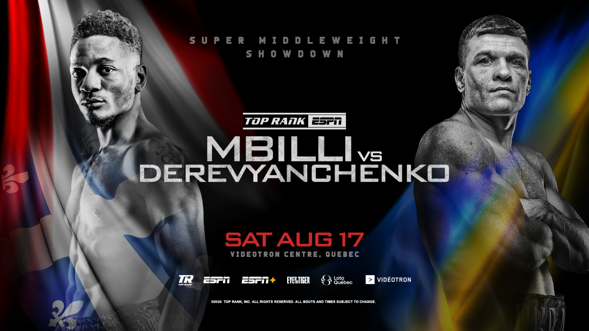 Promoted by Top Rank and Eye of the Tiger, Mbilli-Derevyanchenko will be broadcast live in the U.S. on ESPN, ESPN Deportes, and ESPN+ at 10 p.m. ET/7 p.m. PT. Sky Sports will have coverage in the U.K. & Ireland.