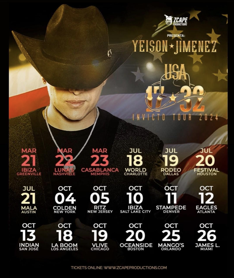 Fans can expect an unforgettable experience at each tour stop. With high-caliber production and a repertoire that will include his greatest hits, Yeison Jiménez is ready to take his music to new heights. Here are the confirmed dates for the Invicto Tour 17-32: