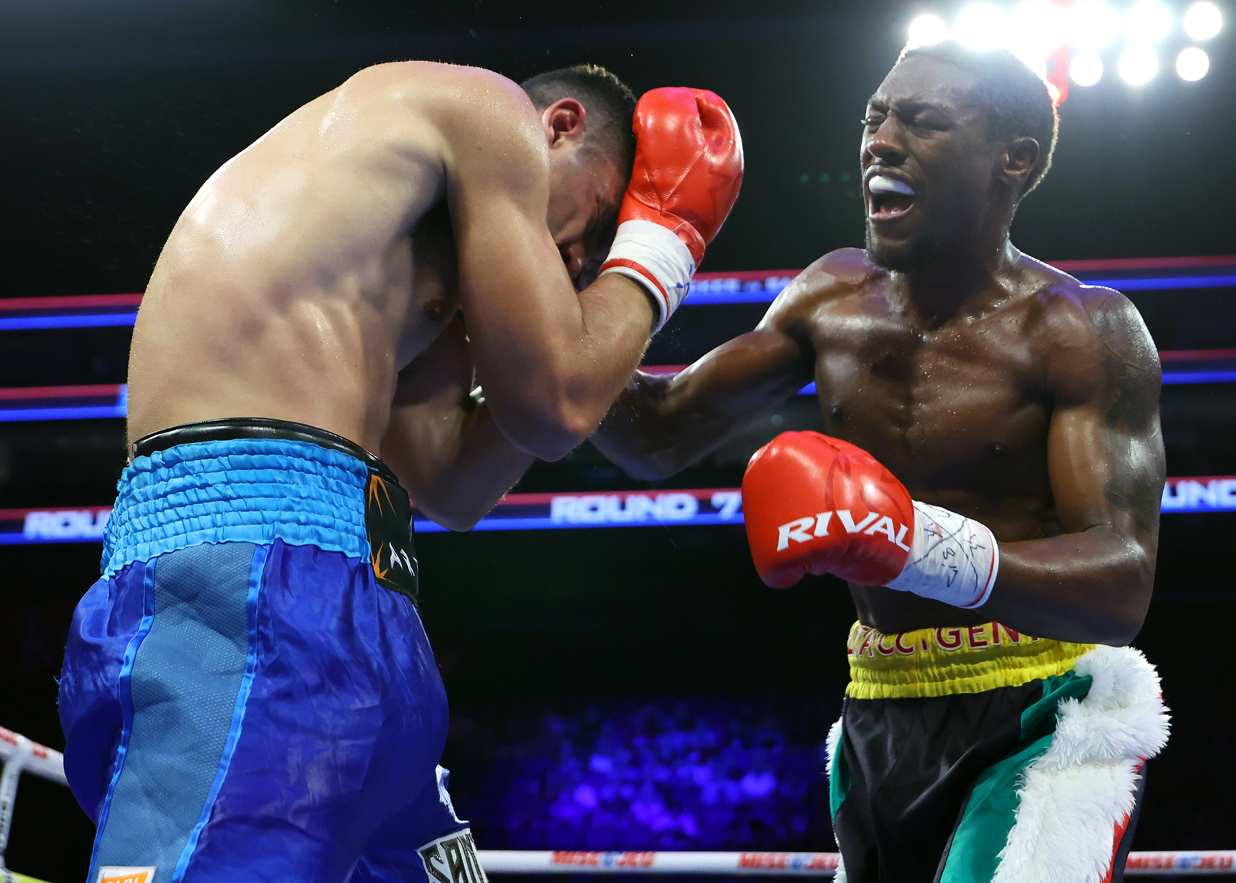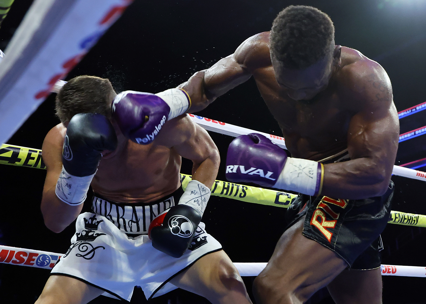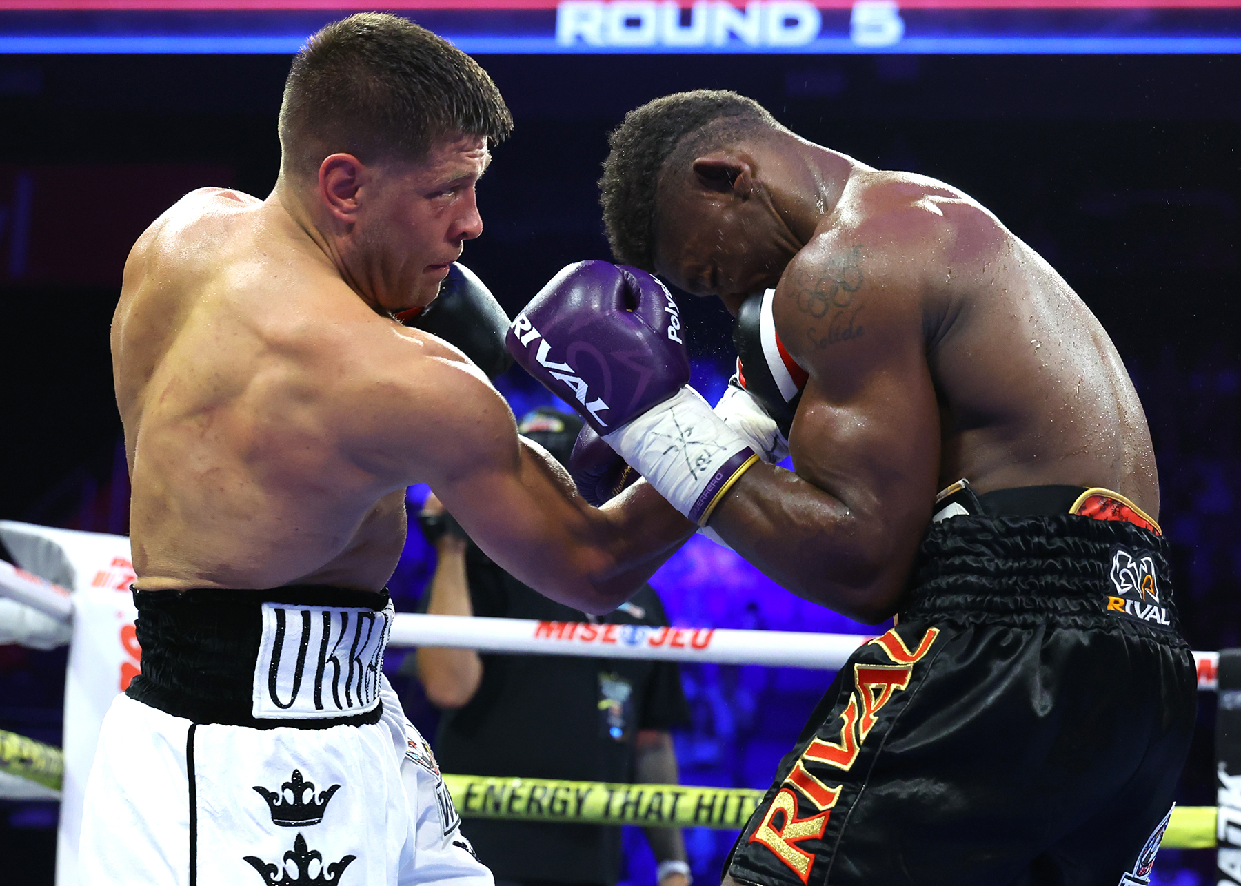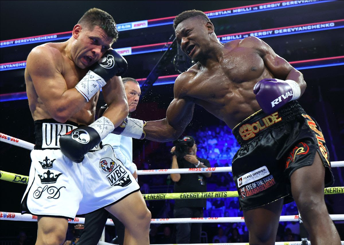 Derevyanchenko tried to box from the outside but hurt his left biceps in the third round, forcing him to fight with just one hand. In the fifth, the 38-year-old Ukrainian fought back with consecutive rights, but Mbilli’s youth and power overwhelmed him as he struggled to end the fight on his feet.