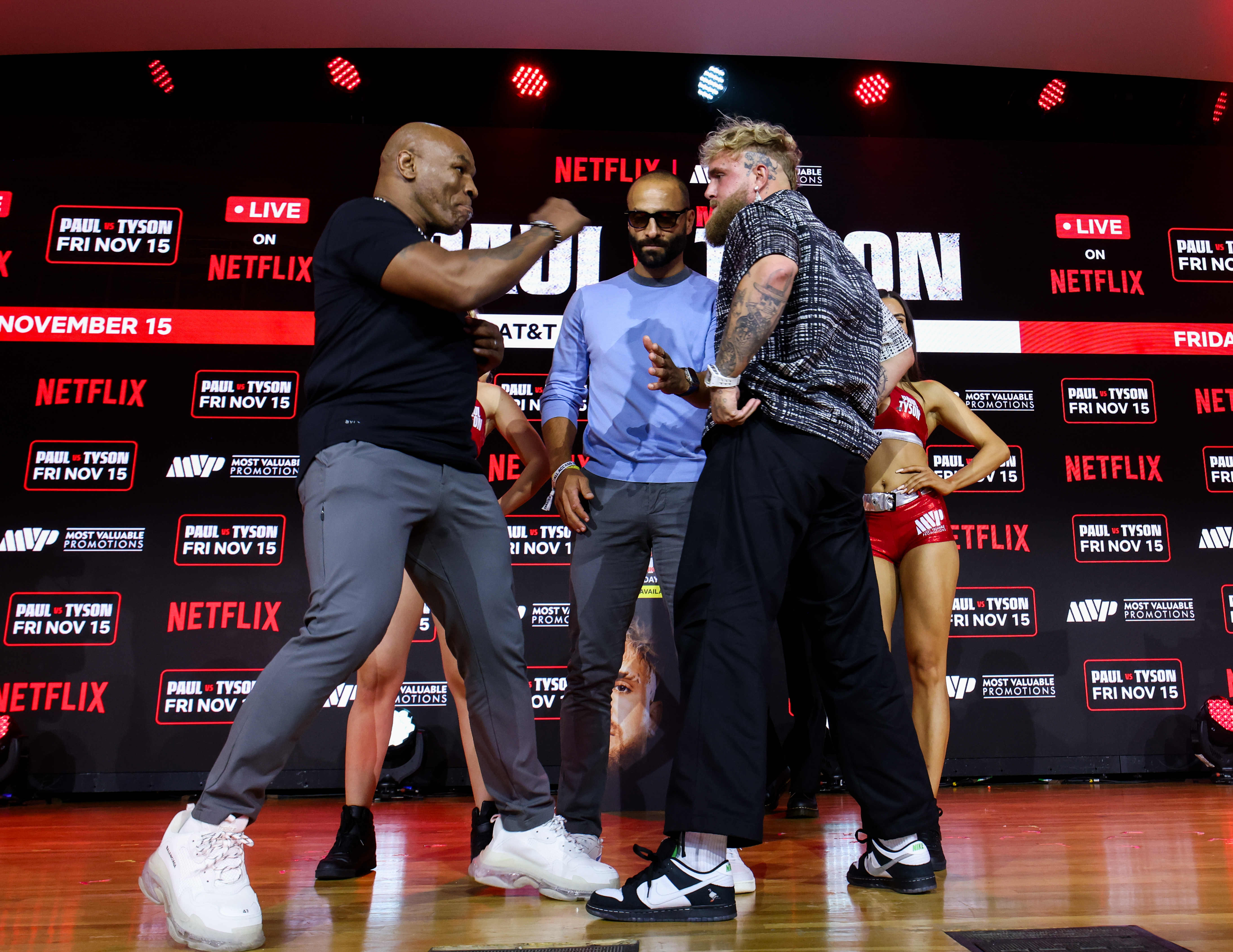 NEW YORK, NY – August 18, 2024 – Today at the inaugural Fanatics Fest NYC, an immersive sports festival where sports, culture, and collecting collide, at the Javits Center in New York, the Problem Child, Jake “El Gallo” Paul (10-1, 7 KOs) and the Baddest Man on the Planet Mike Tyson (50-6, 44 KOs) came face to face for the first time since the Netflix and Most Valuable Promotions (MVP) historic bout was rescheduled. Paul vs. Tyson is set for an eight-round professional bout with two-minute rounds and will stream live globally, exclusively on Netflix on Friday, November 15, 2024 from the 80,000-seat capacity AT&T Stadium in Arlington, Texas, home of the NFL’s Dallas Cowboys. Tickets for Paul vs. Tyson are on sale now at Seatgeek.com