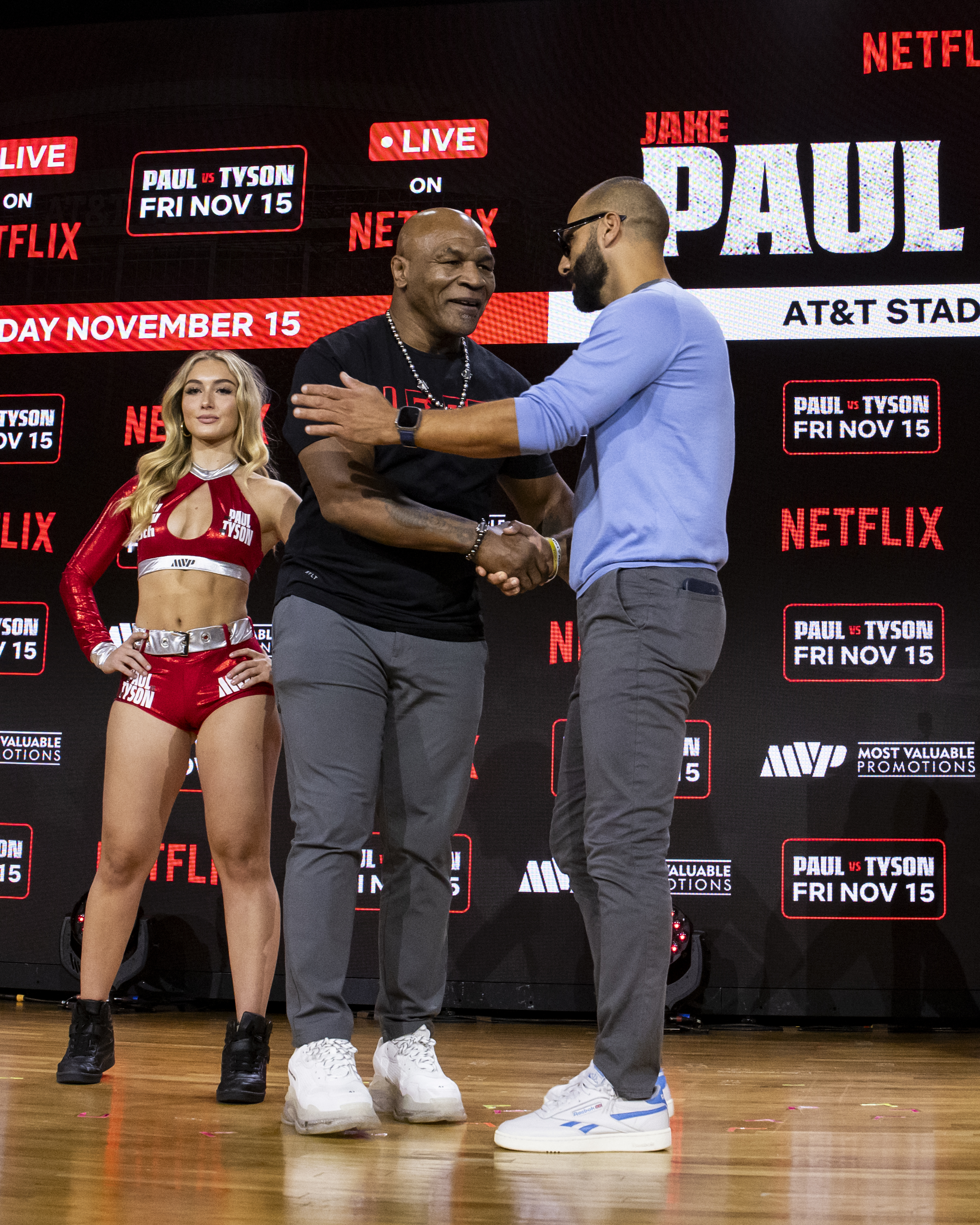NEW YORK, NY – August 18, 2024 – Today at the inaugural Fanatics Fest NYC, an immersive sports festival where sports, culture, and collecting collide, at the Javits Center in New York, the Problem Child, Jake “El Gallo” Paul (10-1, 7 KOs) and the Baddest Man on the Planet Mike Tyson (50-6, 44 KOs) came face to face for the first time since the Netflix and Most Valuable Promotions (MVP) historic bout was rescheduled. Paul vs. Tyson is set for an eight-round professional bout with two-minute rounds and will stream live globally, exclusively on Netflix on Friday, November 15, 2024 from the 80,000-seat capacity AT&T Stadium in Arlington, Texas, home of the NFL’s Dallas Cowboys. Tickets for Paul vs. Tyson are on sale now at Seatgeek.com