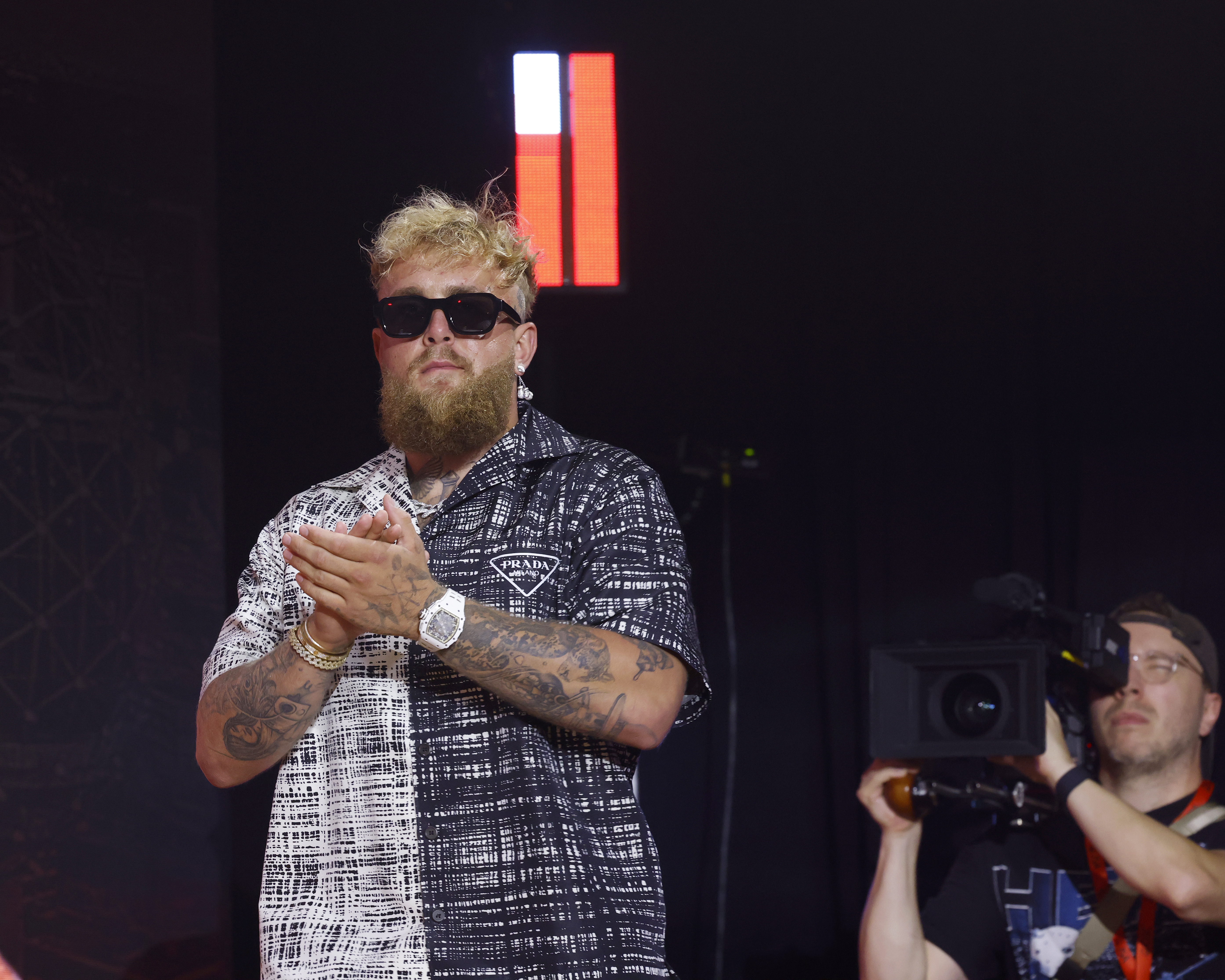 NEW YORK, NY - AUGUST 18: Jake Paul vs Mike Tyson press conference, ahead of their fight in to be held November, during the inaugural Fanatics Fest NYC at the Jacob Javits Center on August 18, 2024 in New York City. ©Michelle Farsi/MVP Promotions