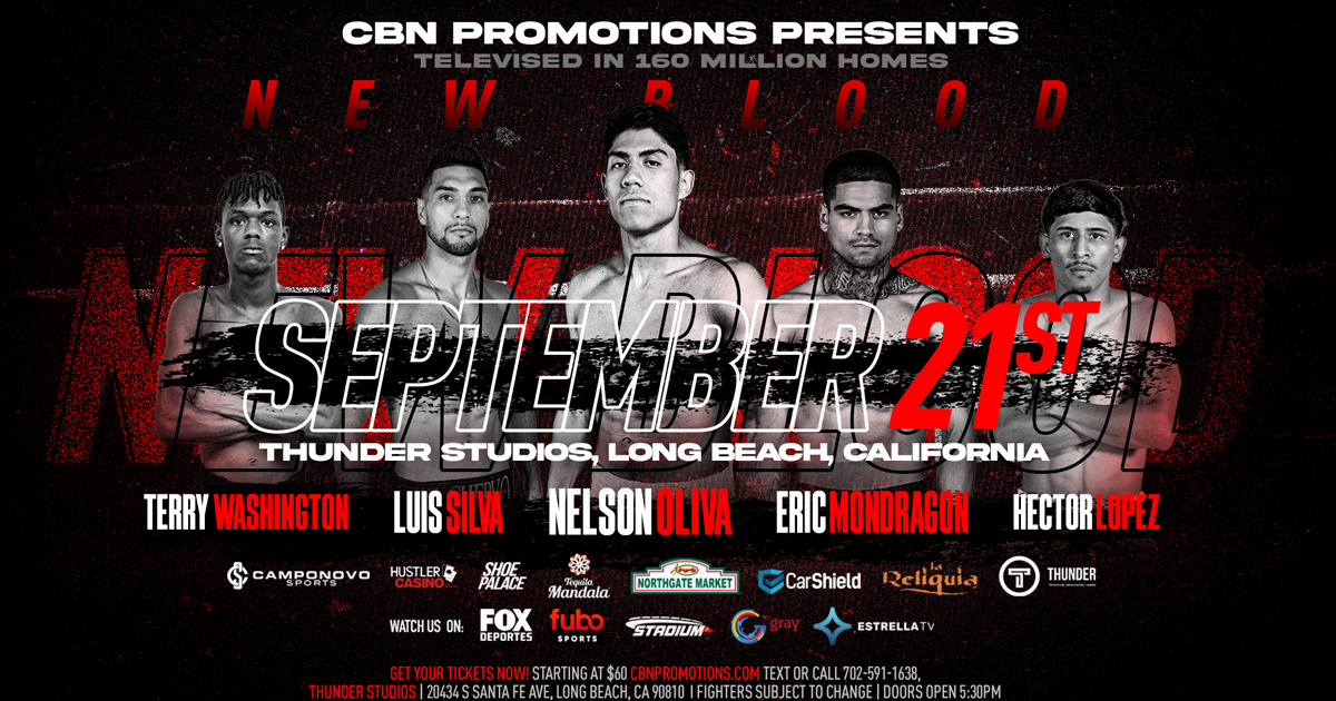 LONG BEACH, CA – CBN Promotions is proud to announce its next highly anticipated boxing event, taking place on Saturday, September 21, 2024, at Thunder Studios in Long Beach, CA. The action-packed night will be headlined by an 8-round main event featuring undefeated middleweight Nelson Oliva (11-0, 8 KOs) from Los Angeles, CA. Oliva, known for his explosive power in both hands, will be looking to continue his unbeaten streak against Paulo Cesar Galdino (13-8-2, 9 KOs), Sao Paulo, Brazil.