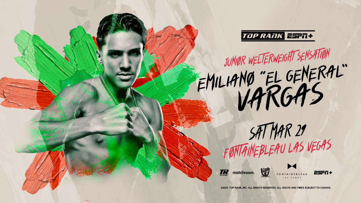 LAS VEGAS (Feb. 21, 2025) — Junior welterweight sensation Emiliano Fernando Vargas and Olympic middleweight standout Troy Isley made important strides last year but now look to take bigger leaps as they initiate their 2025 campaigns on Saturday, March 29, at BleauLive Theater at Fontainebleau Las Vegas.