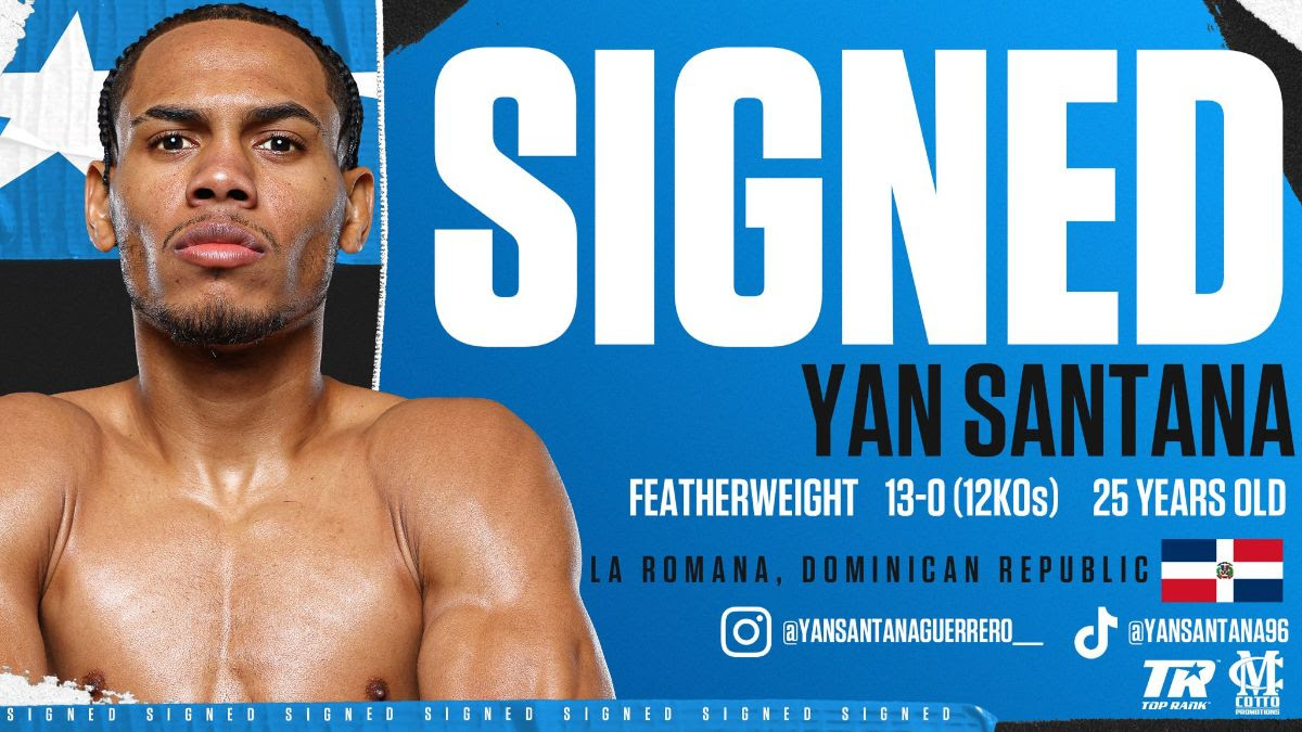 “Yan Santana is a sensational talent who is well on his way to becoming a dominant presence in the featherweight division and beyond,” said Top Rank Chairman Bob Arum. “I look forward to working with Miguel Cotto and his team to help guide Yan to the championship level. He has everything it takes to become a Dominican boxing legend.”