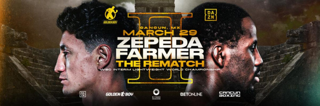 CANCÚN, Quintana Roo, Mexico (March 3, 2025) — As the countdown continues to the highly anticipated rematch between boxing’s most electrifying, undefeated machine, WBC Interim Lightweight World Champion William “El Camarón” Zepeda (31-0, 26 KOs) of San Mateo Atenco, Mexico, and former IBF Super Featherweight Champion Tevin “2X” Farmer (33-7-1, 8 KOs) of Philadelphia, Golden Boy announced today a stacked card featuring its current stars, rising prospects, and former world champions. The 12-round main event for Zepeda’s WBC interim title is set for Saturday, March 29, at the Poliforum Benito Juárez in Cancún, Mexico, in association with Cancún Boxing and will be broadcast worldwide on DAZN.