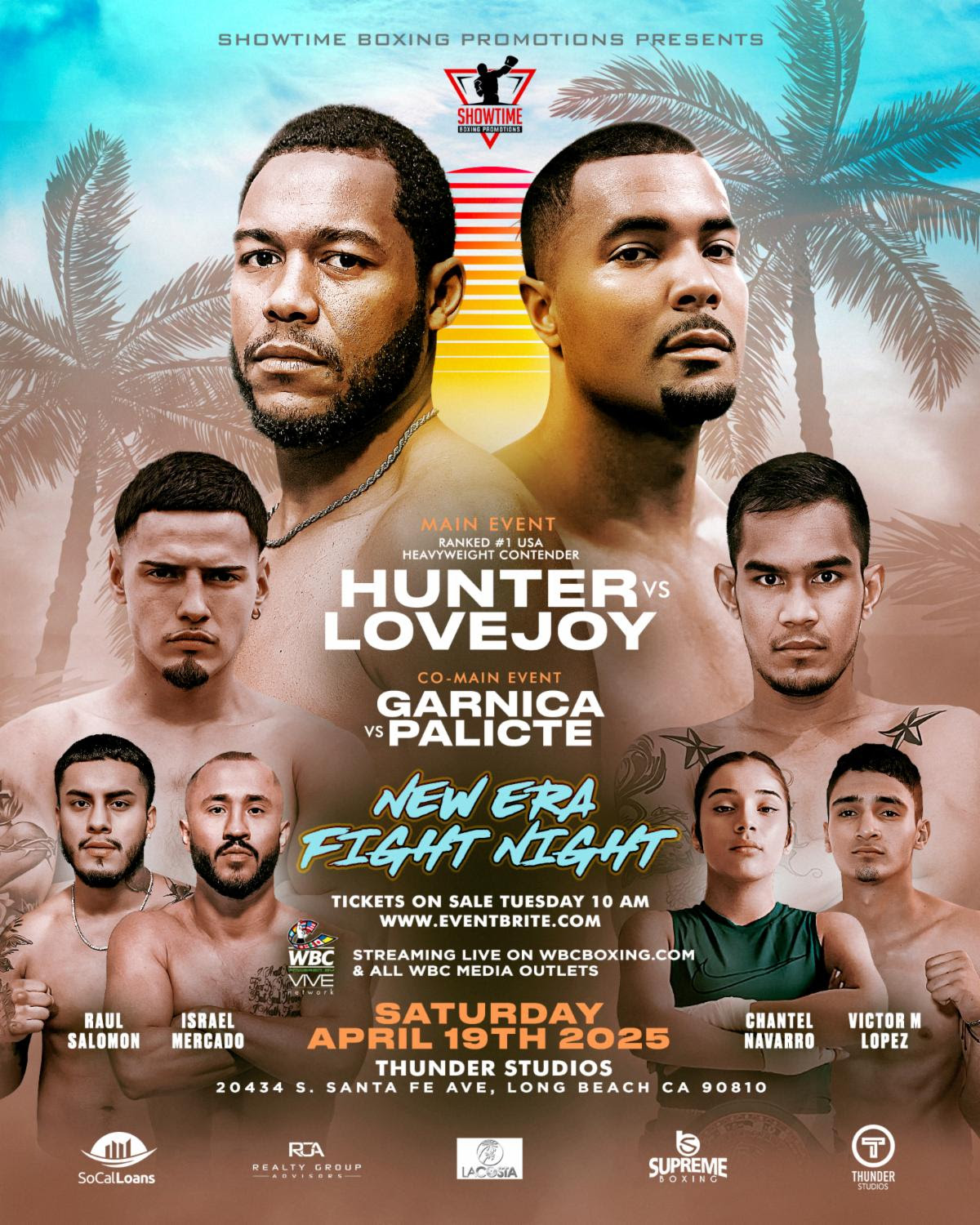 Headlining the event, WBA #1 ranked heavyweight contender Michael “The Bounty” Hunter (24-1-2, 17 KOs) of Las Vegas, NV, takes on knockout artist Christopher Lovejoy (20-1-1, 20 KOs) of Los Angeles, CA, in a scheduled 8-round showdown. With both fighters carrying serious power, fans can expect an explosive main event as Hunter looks to solidify his path toward a world title shot while Lovejoy aims to shake up the division.