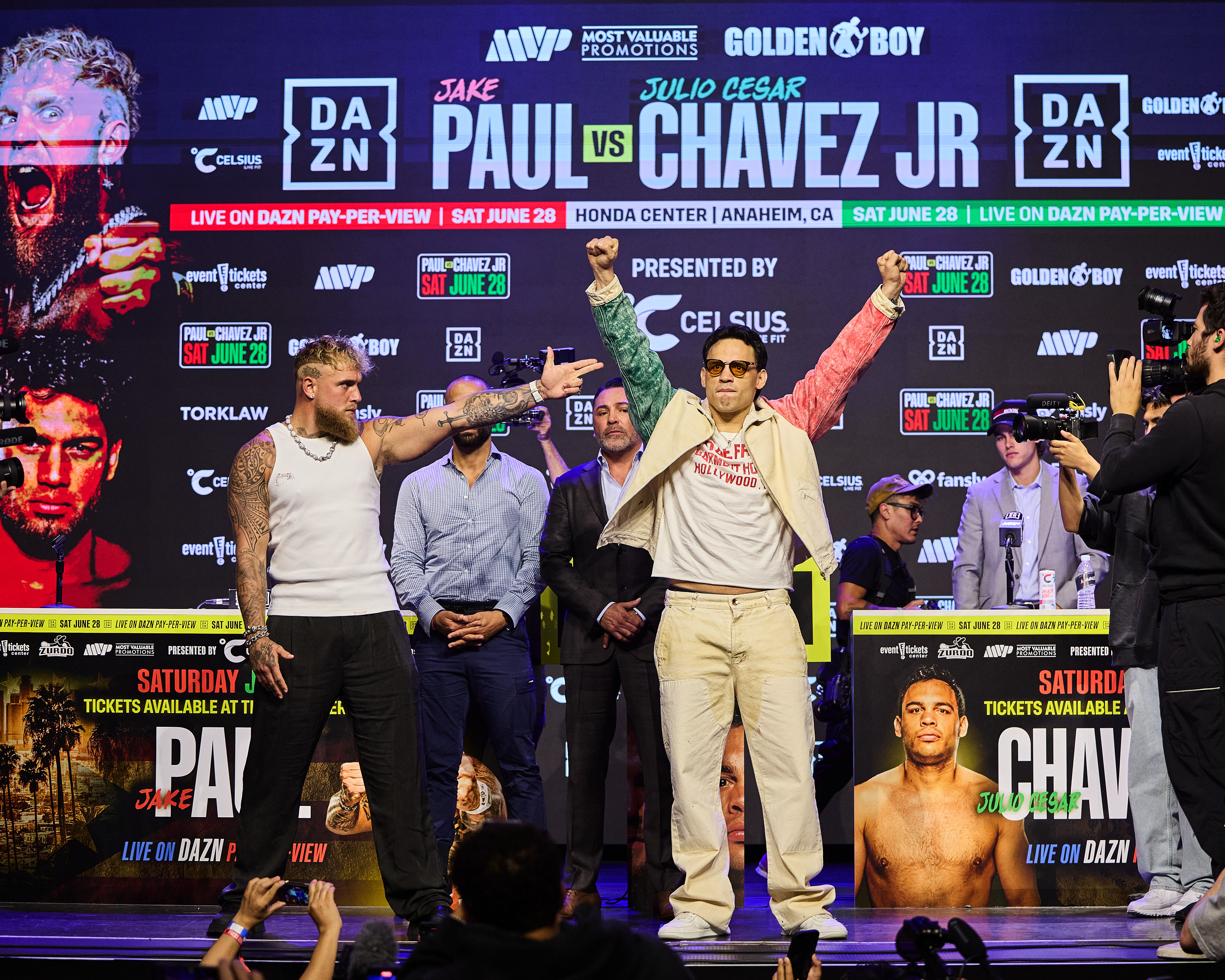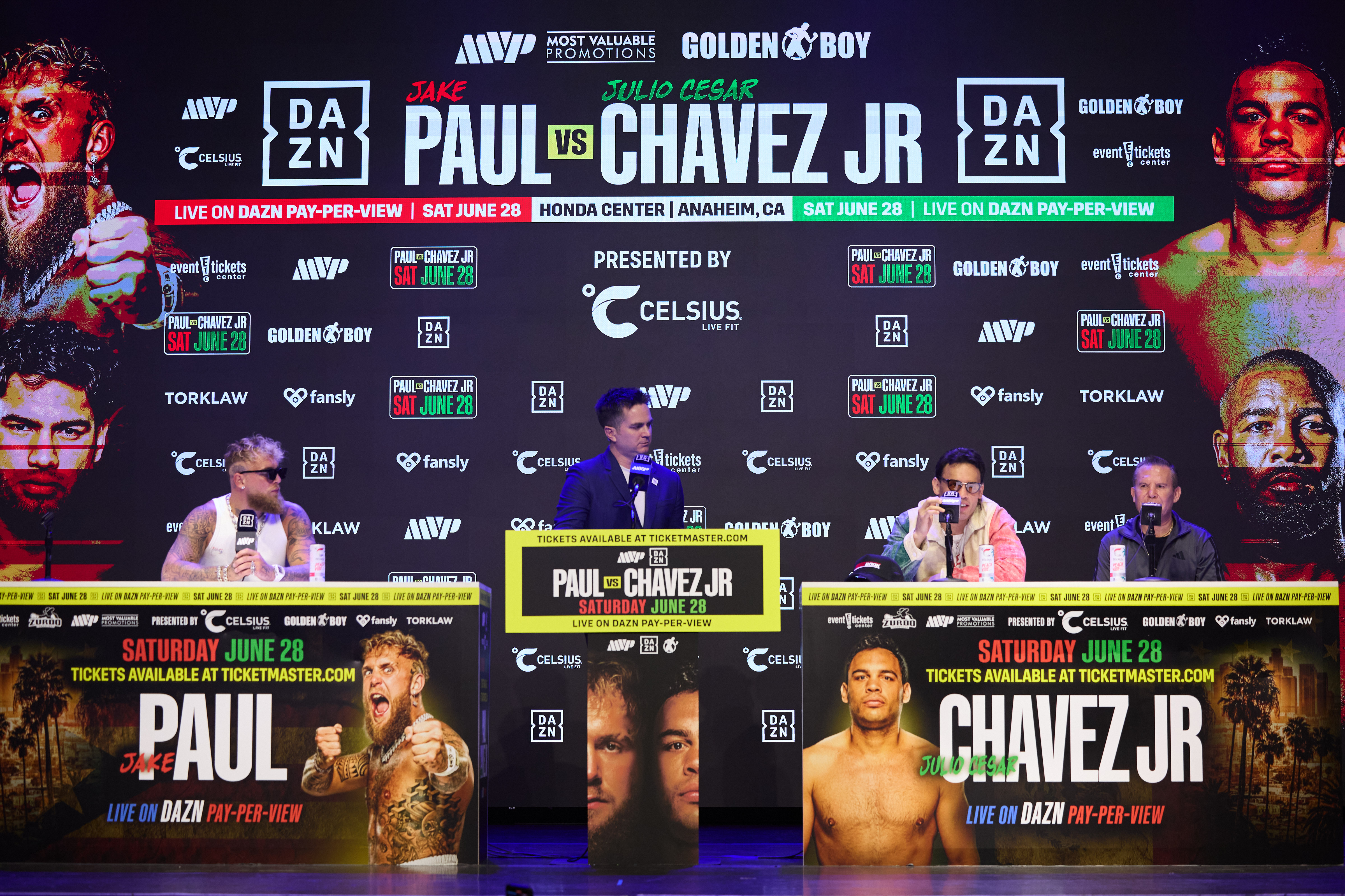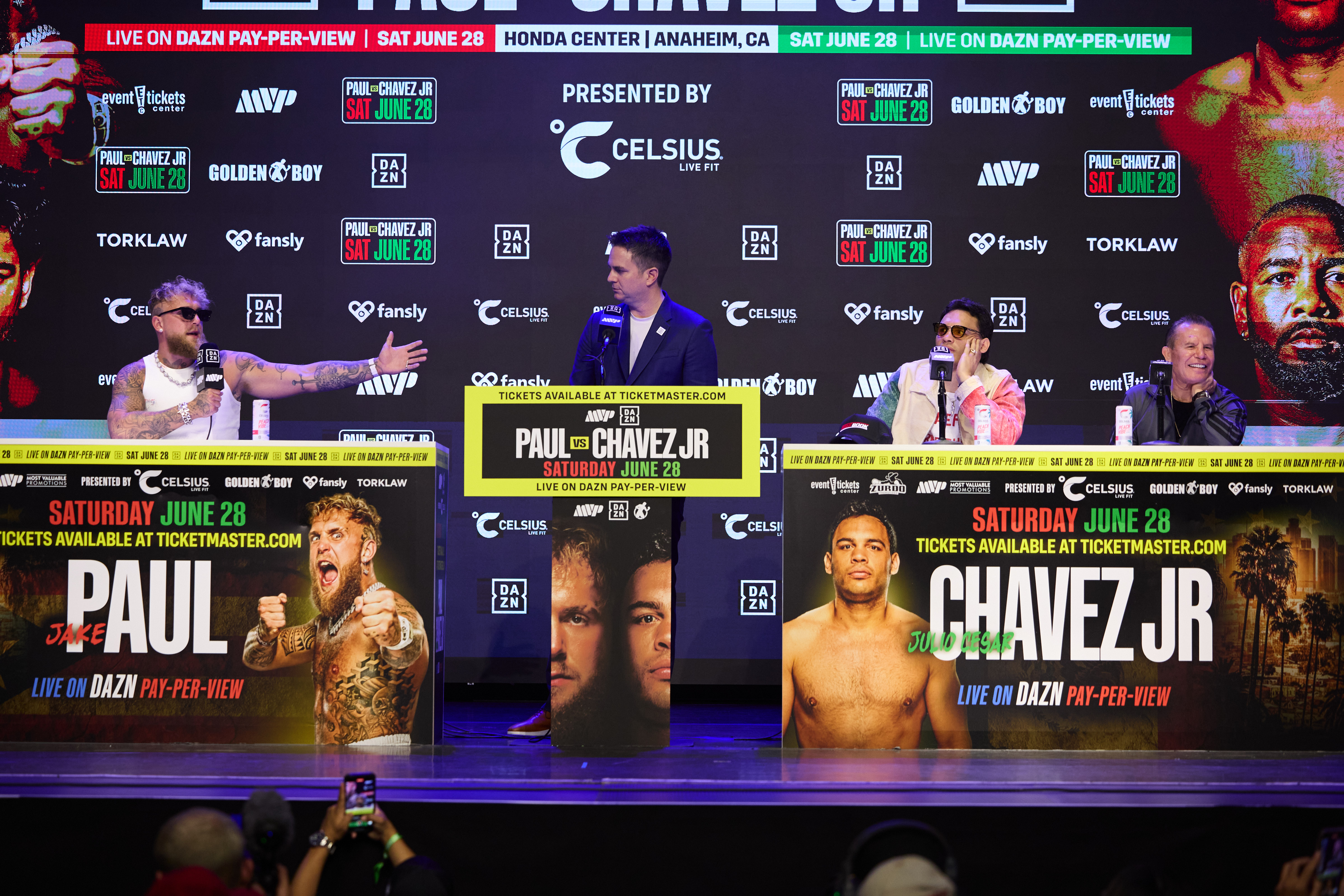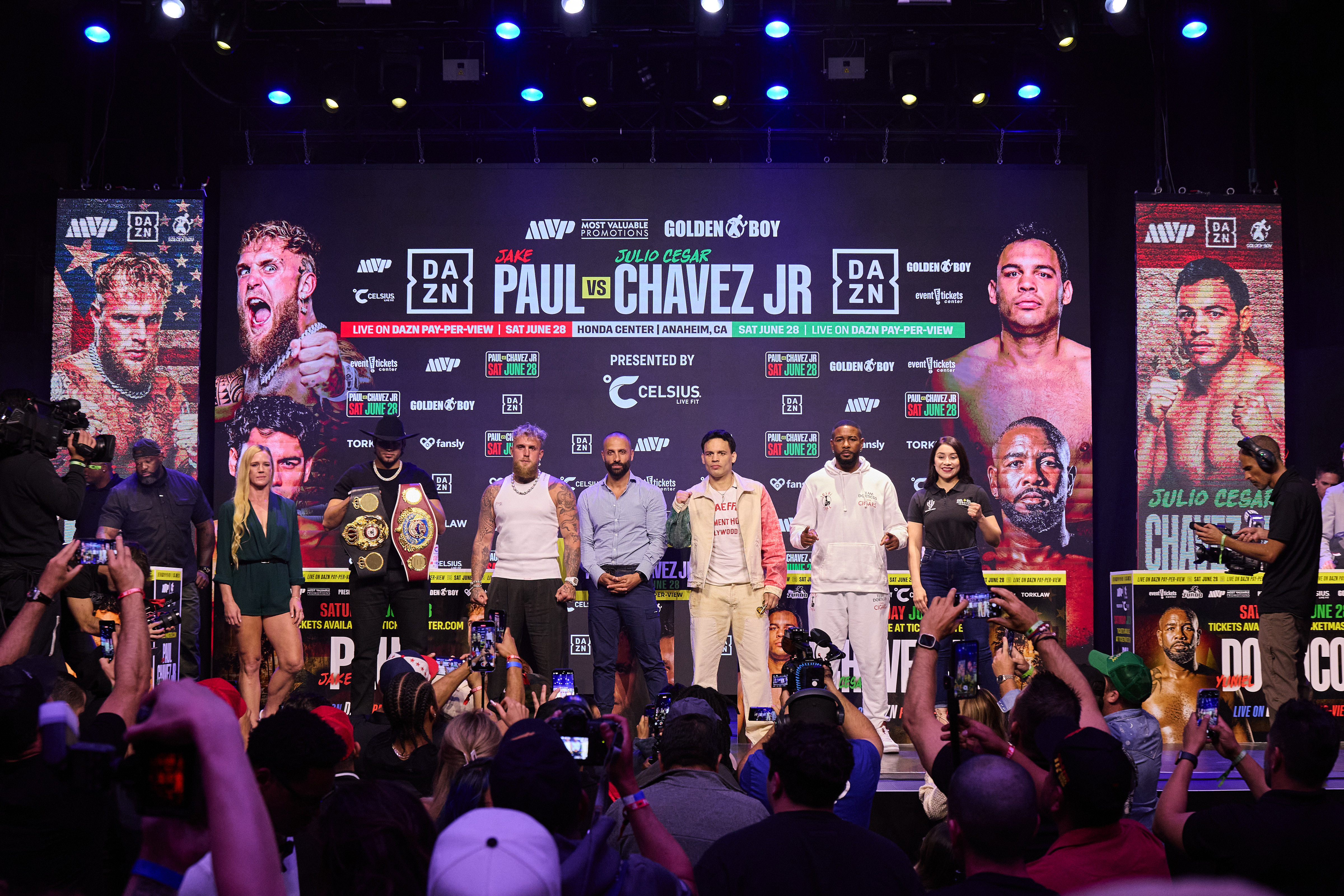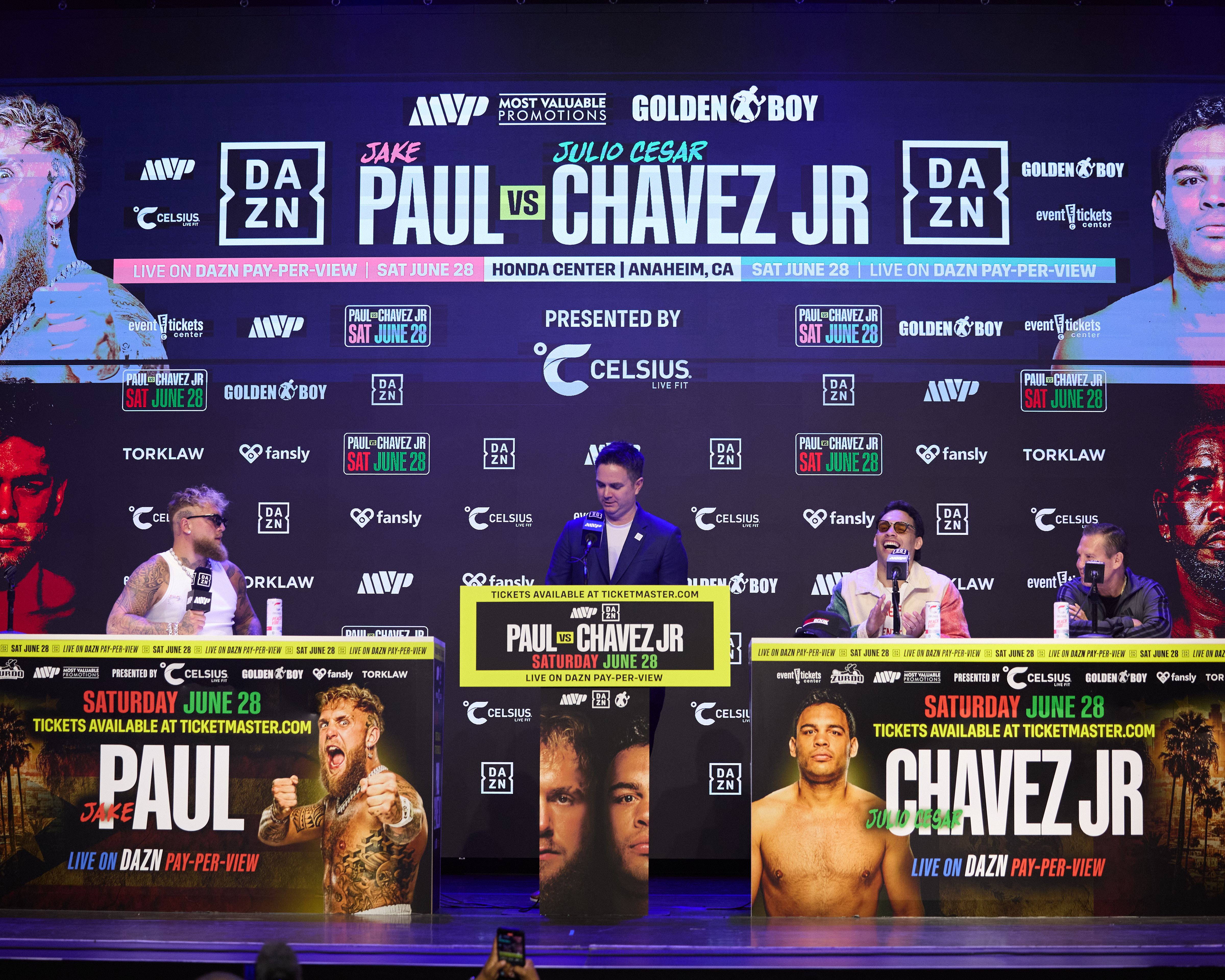 LOS ANGELES, CA – Today at the Avalon Hollywood Theater in Los Angeles, CA, The Problem Child, Jake “El Gallo de Dorado” Paul (11-1, 7 KOs) and Mexico’s former champion Julio Cesar Chavez Jr. (54-6-1, 34 KOs) met face-to-face to preview their highly anticipated Most Valuable Promotions (MVP) bout. This event will air live globally on DAZN pay-per-view on Saturday, June 28, from Honda Center in Anaheim, California, and is presented by CELSIUS Live Fit Essential Energy with Golden Boy Promotions serving as an official licensed promoter. Paul vs. Chavez is also sponsored by Event Ticket Center and Fansly. All tickets are on sale now via Ticketmaster