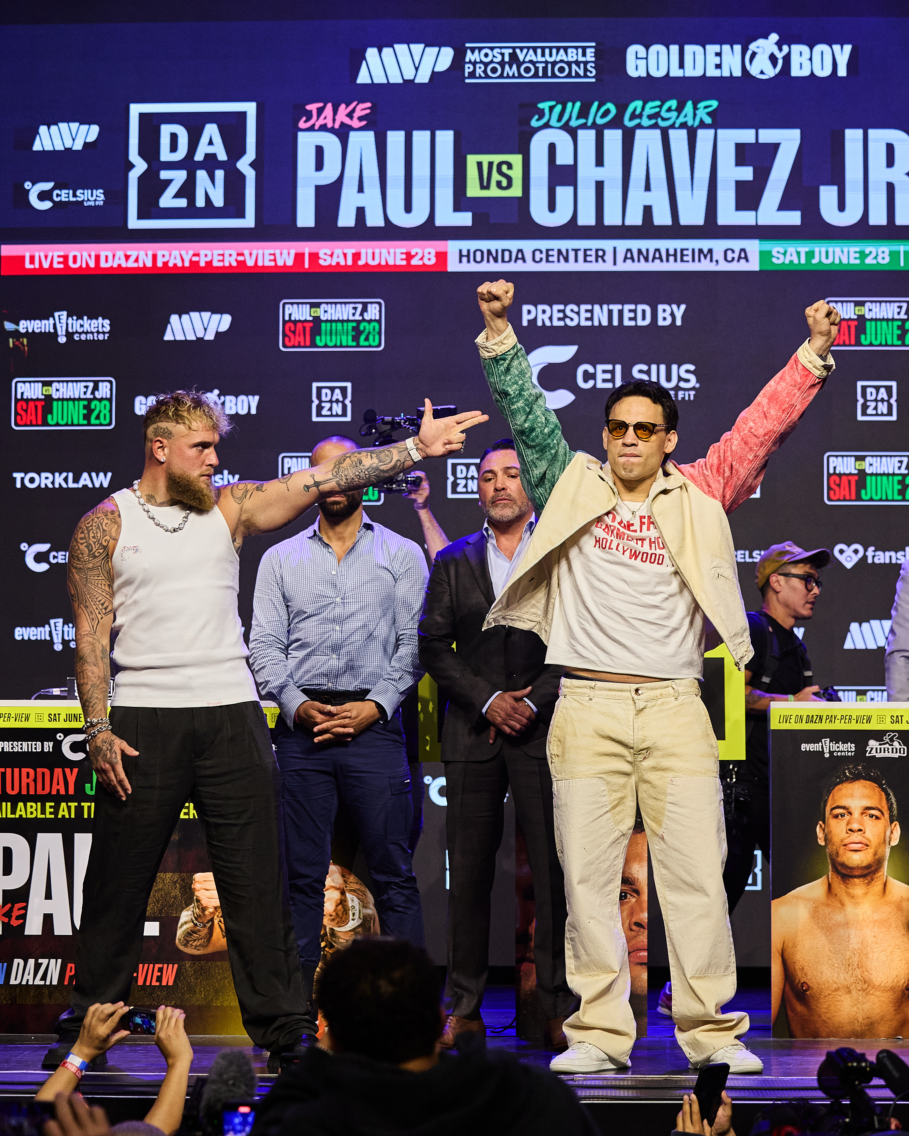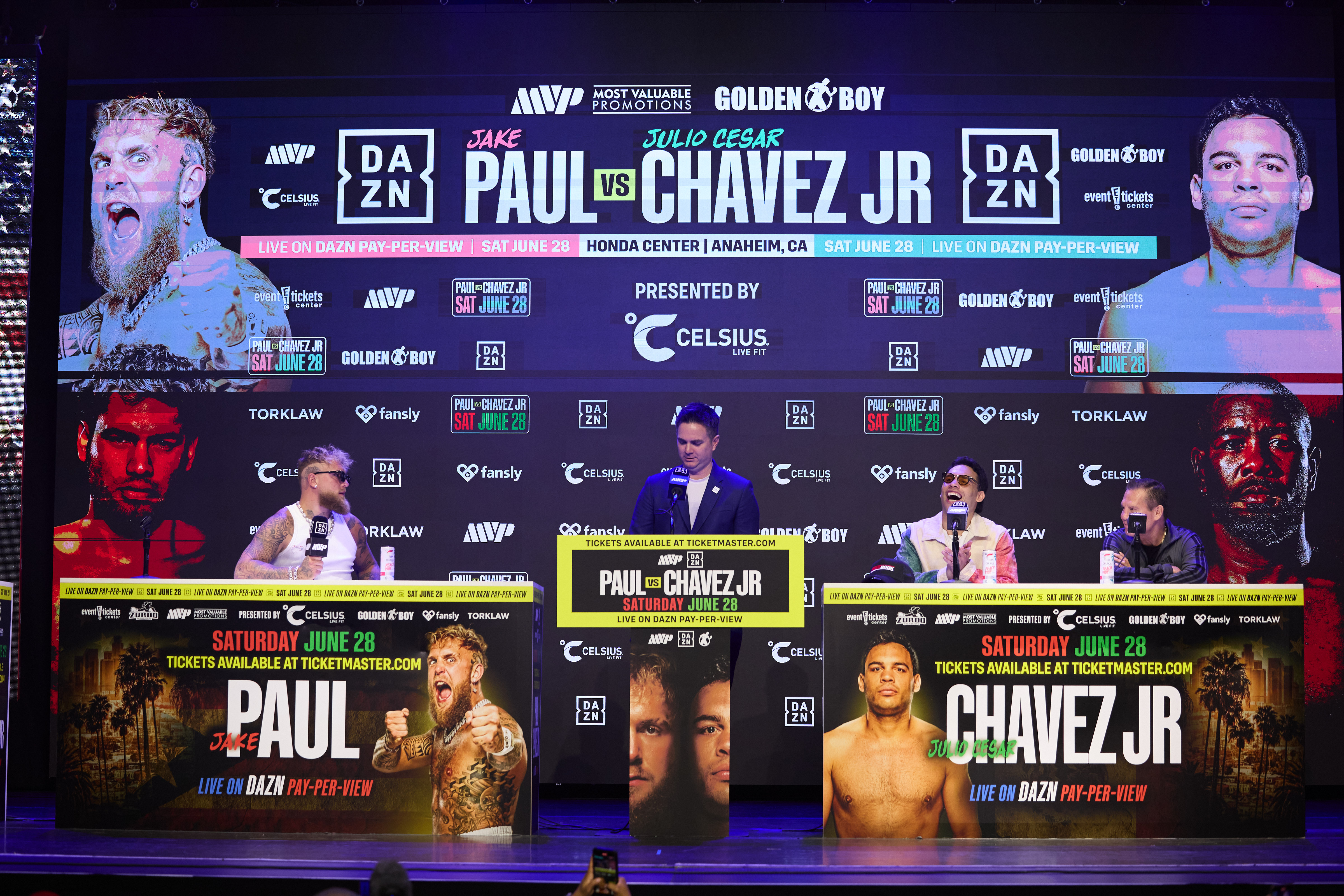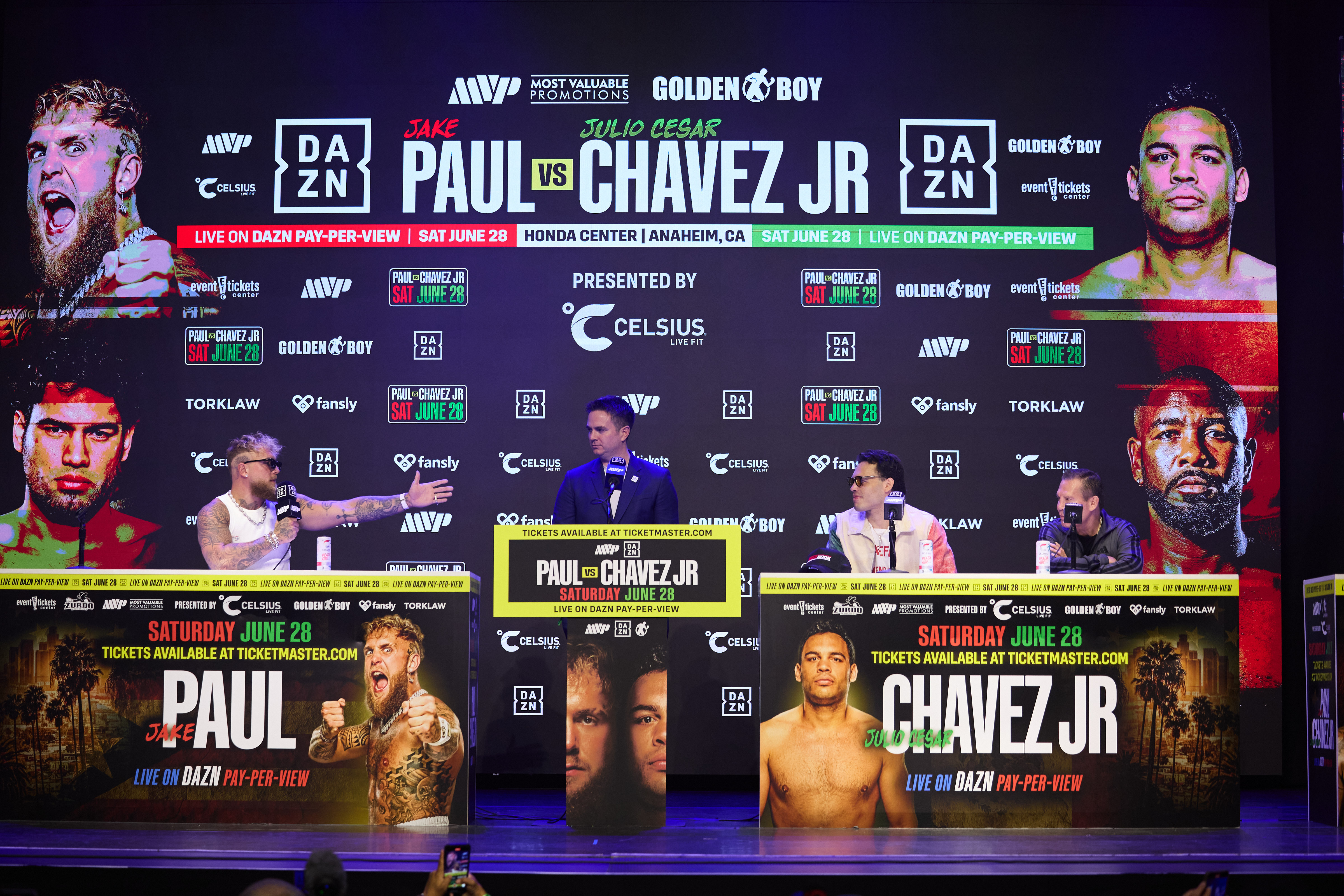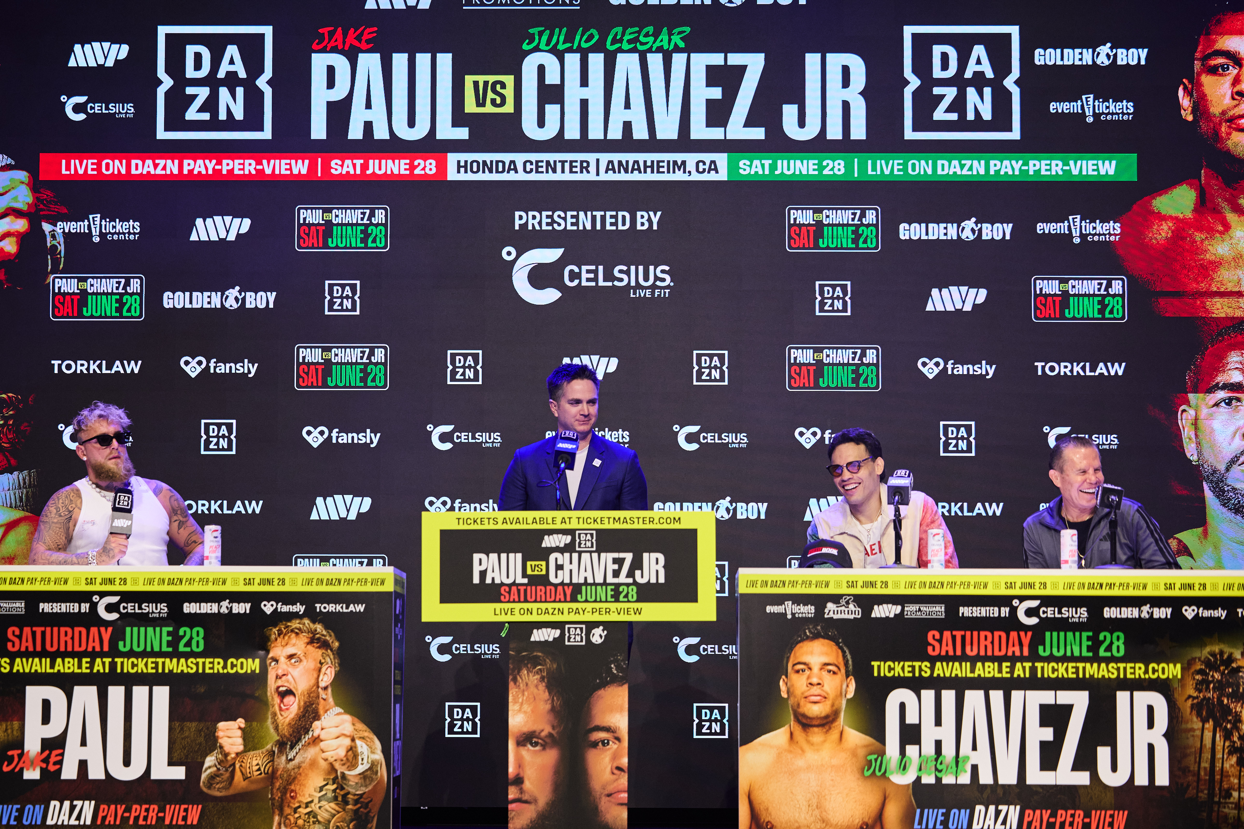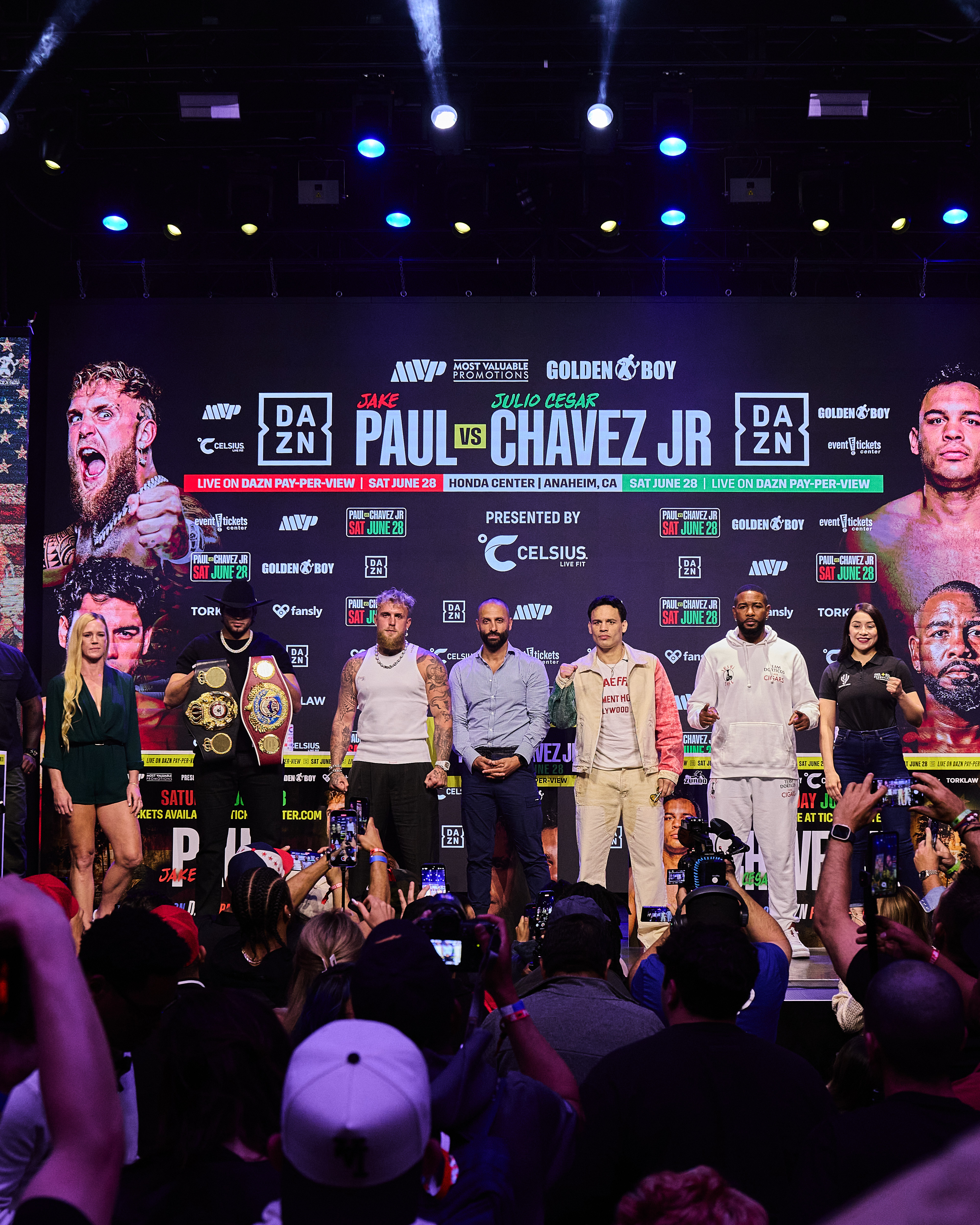 LOS ANGELES, CA – Today at the Avalon Hollywood Theater in Los Angeles, CA, The Problem Child, Jake “El Gallo de Dorado” Paul (11-1, 7 KOs) and Mexico’s former champion Julio Cesar Chavez Jr. (54-6-1, 34 KOs) met face-to-face to preview their highly anticipated Most Valuable Promotions (MVP) bout. This event will air live globally on DAZN pay-per-view on Saturday, June 28, from Honda Center in Anaheim, California, and is presented by CELSIUS Live Fit Essential Energy with Golden Boy Promotions serving as an official licensed promoter. Paul vs. Chavez is also sponsored by Event Ticket Center and Fansly. All tickets are on sale now via Ticketmaster