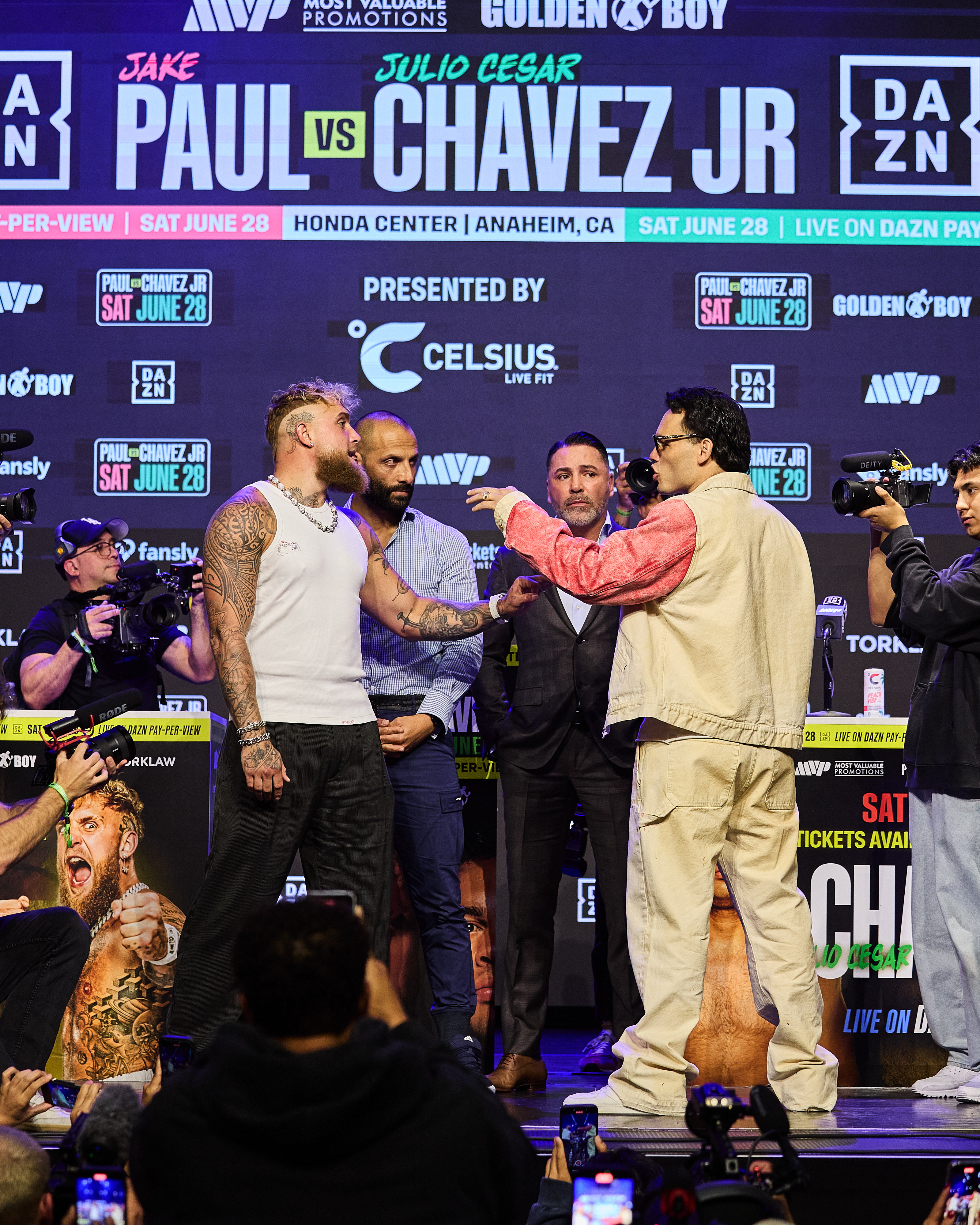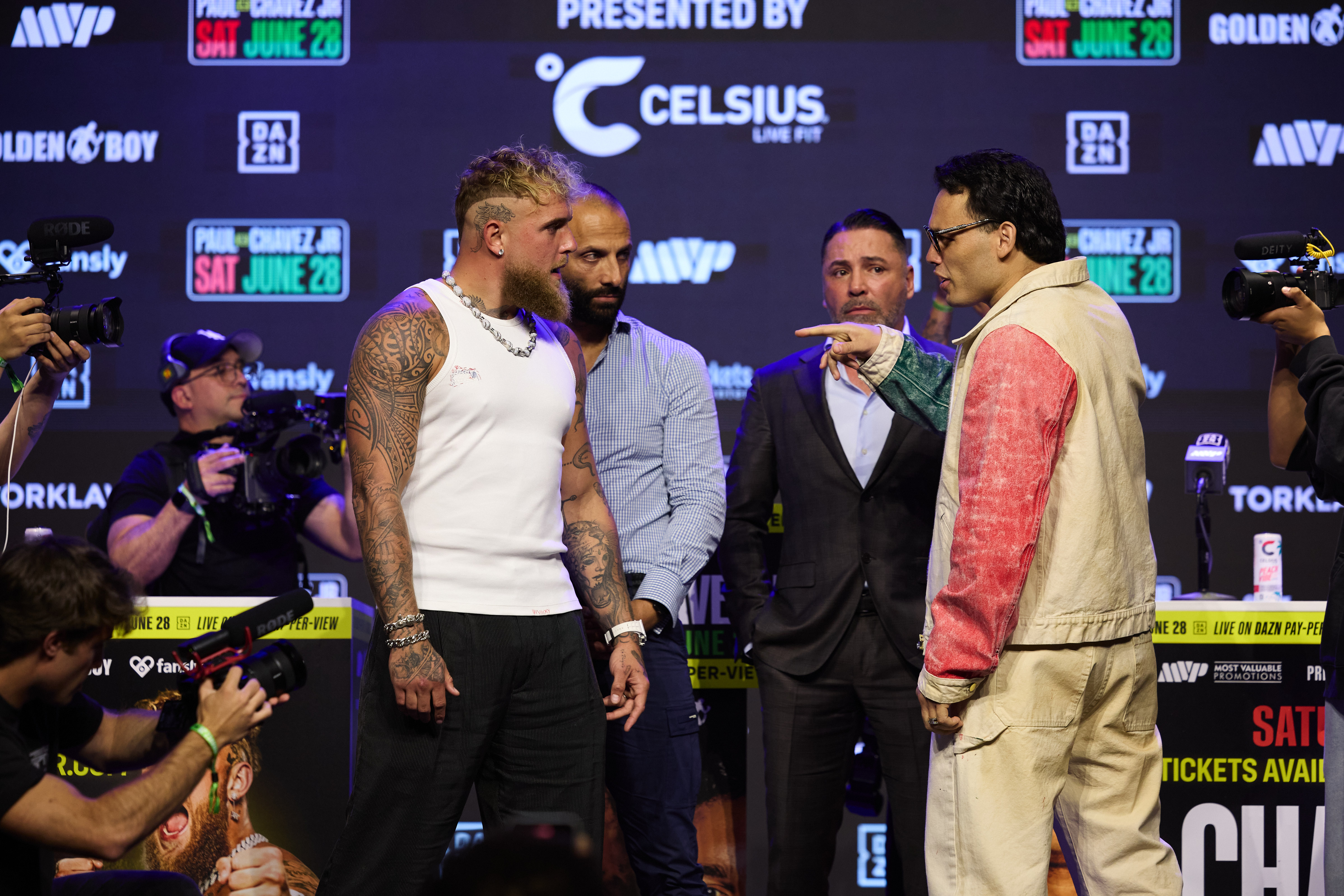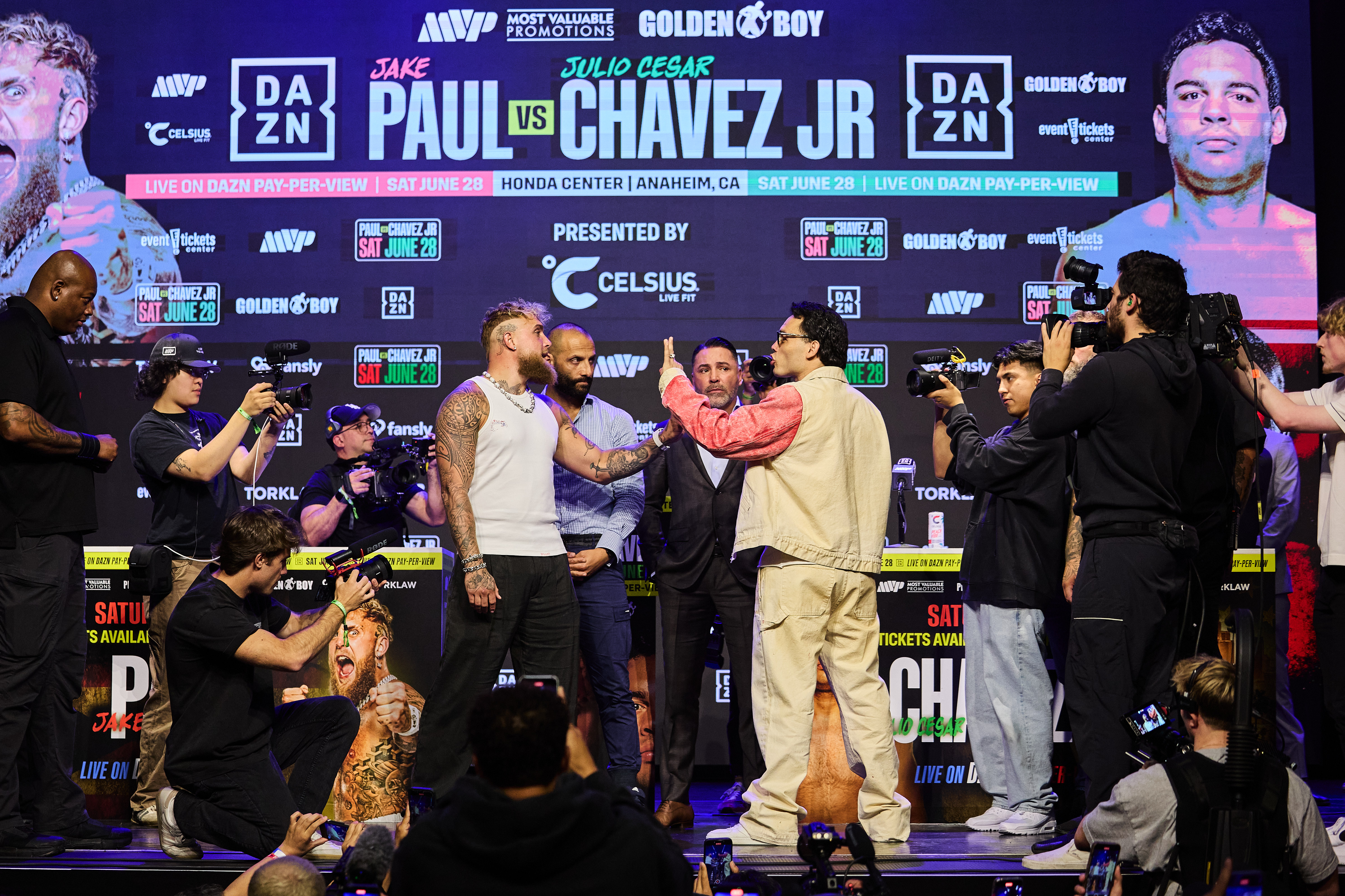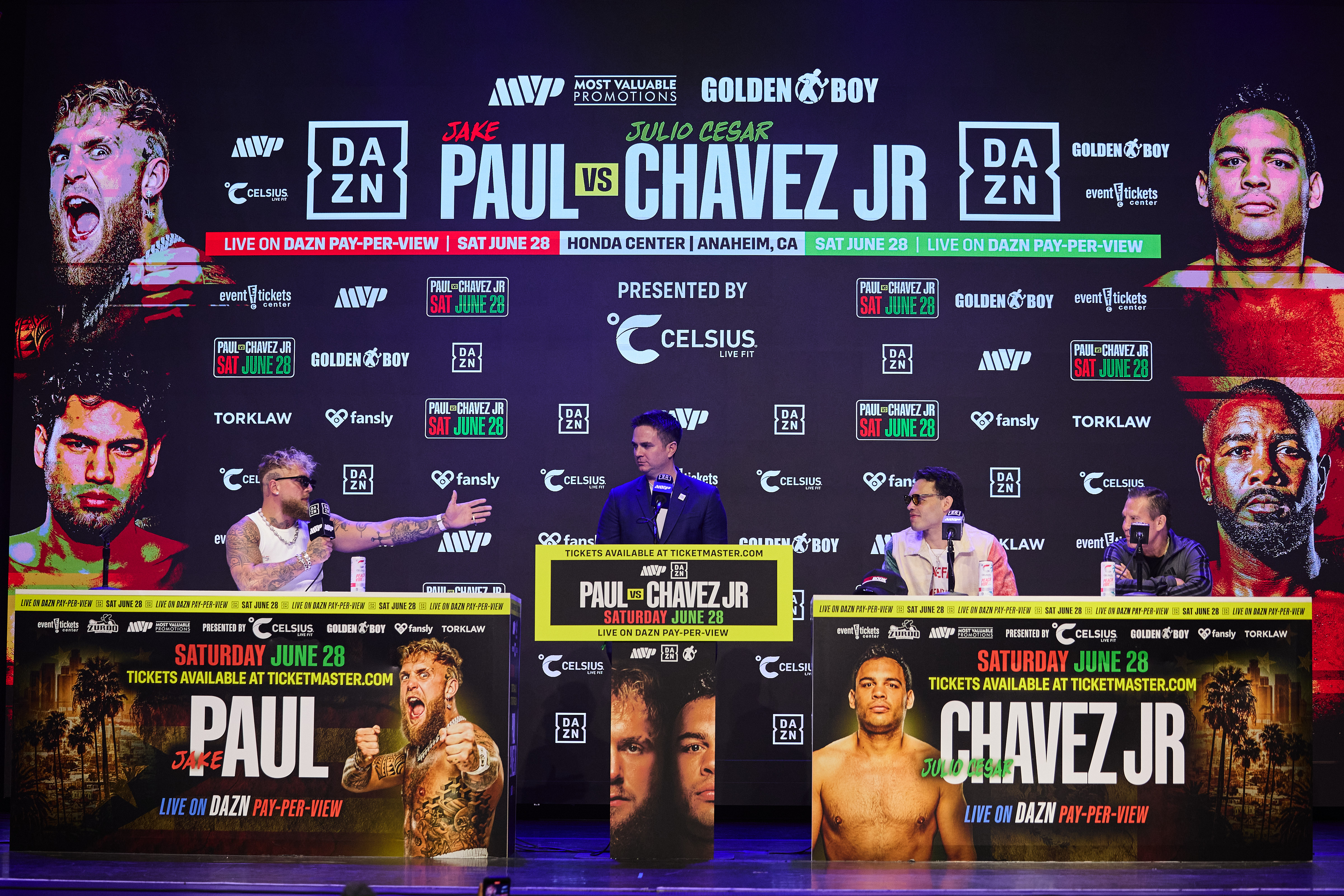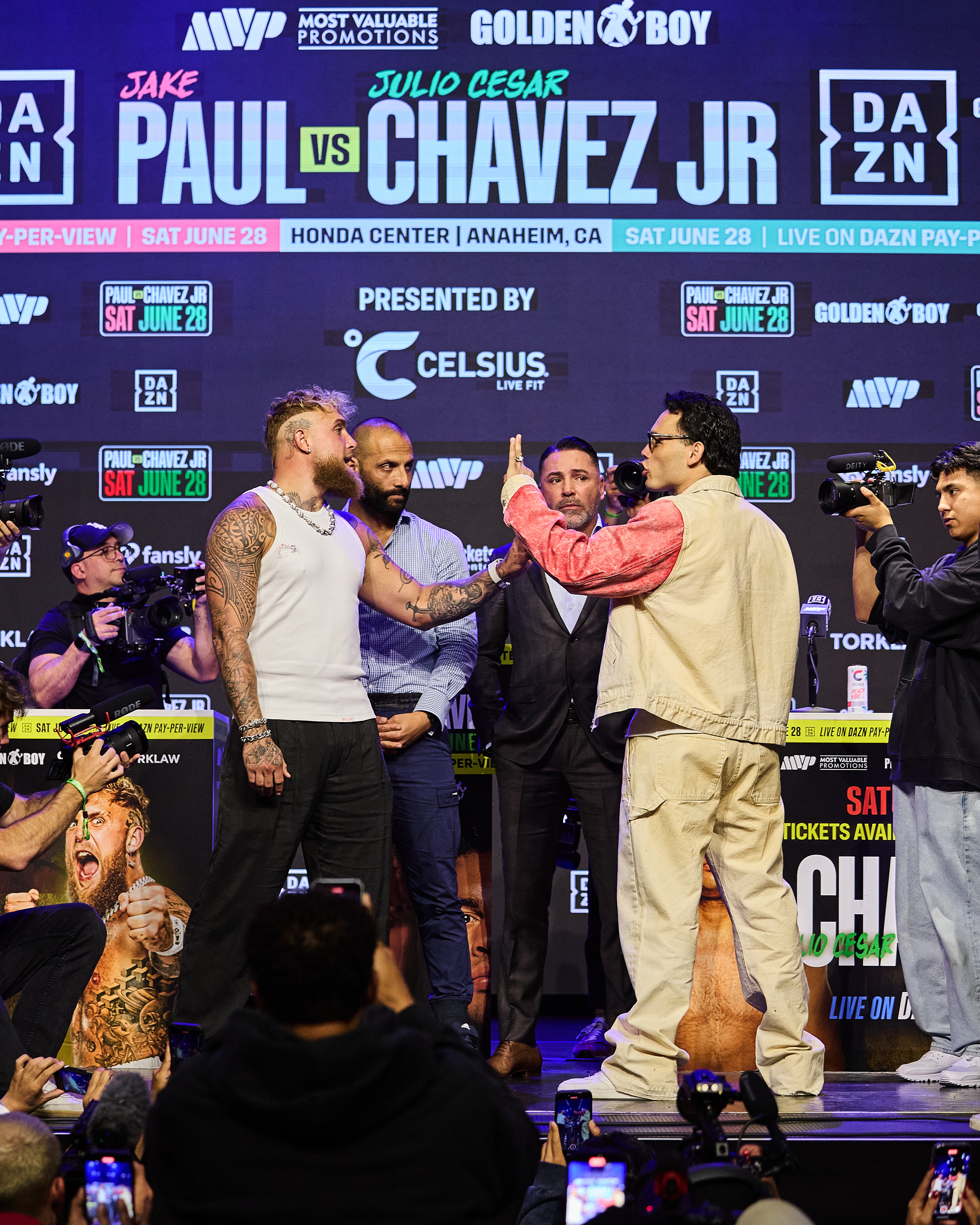 LOS ANGELES, CA – Today at the Avalon Hollywood Theater in Los Angeles, CA, The Problem Child, Jake “El Gallo de Dorado” Paul (11-1, 7 KOs) and Mexico’s former champion Julio Cesar Chavez Jr. (54-6-1, 34 KOs) met face-to-face to preview their highly anticipated Most Valuable Promotions (MVP) bout. This event will air live globally on DAZN pay-per-view on Saturday, June 28, from Honda Center in Anaheim, California, and is presented by CELSIUS Live Fit Essential Energy with Golden Boy Promotions serving as an official licensed promoter. Paul vs. Chavez is also sponsored by Event Ticket Center and Fansly. All tickets are on sale now via Ticketmaster
