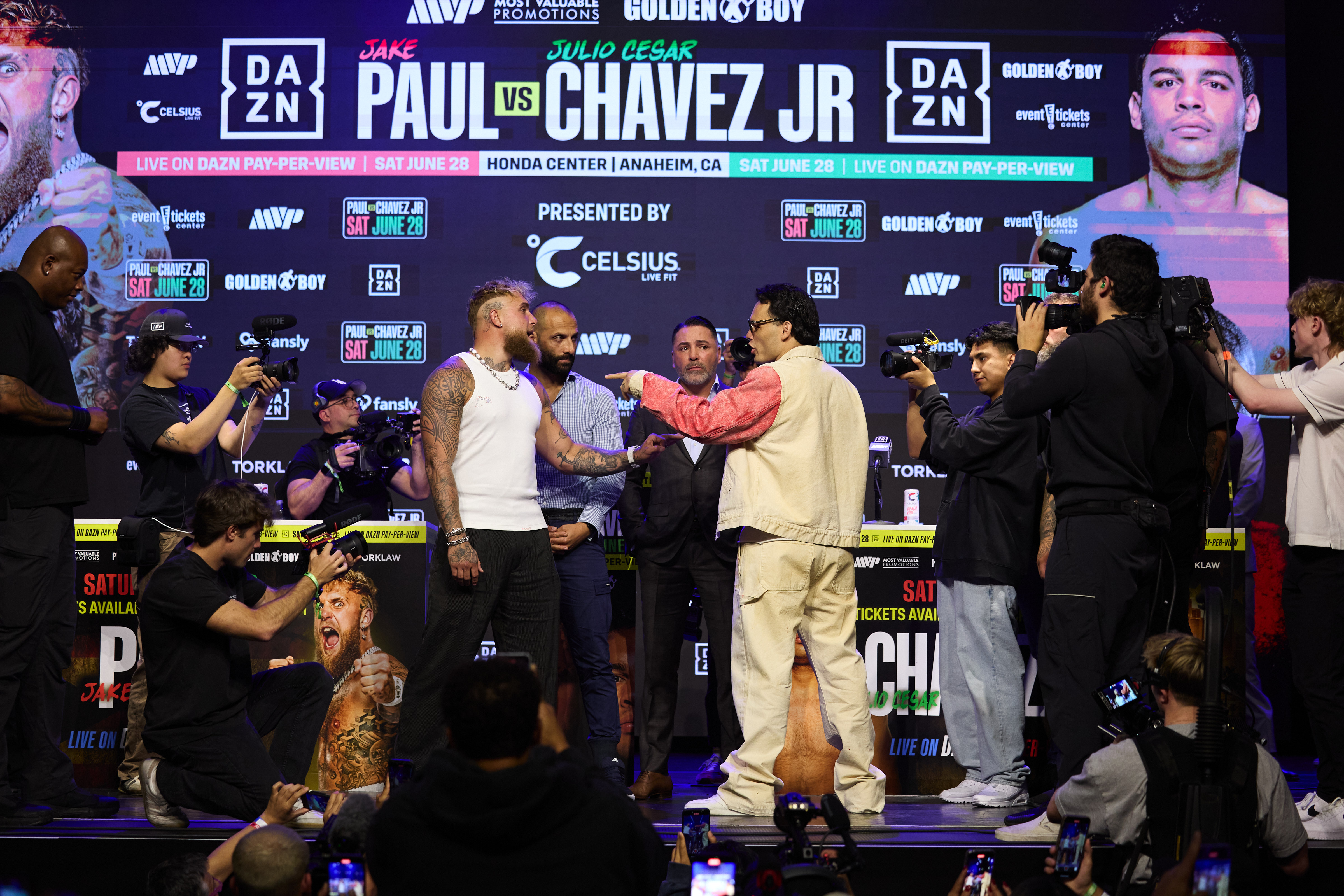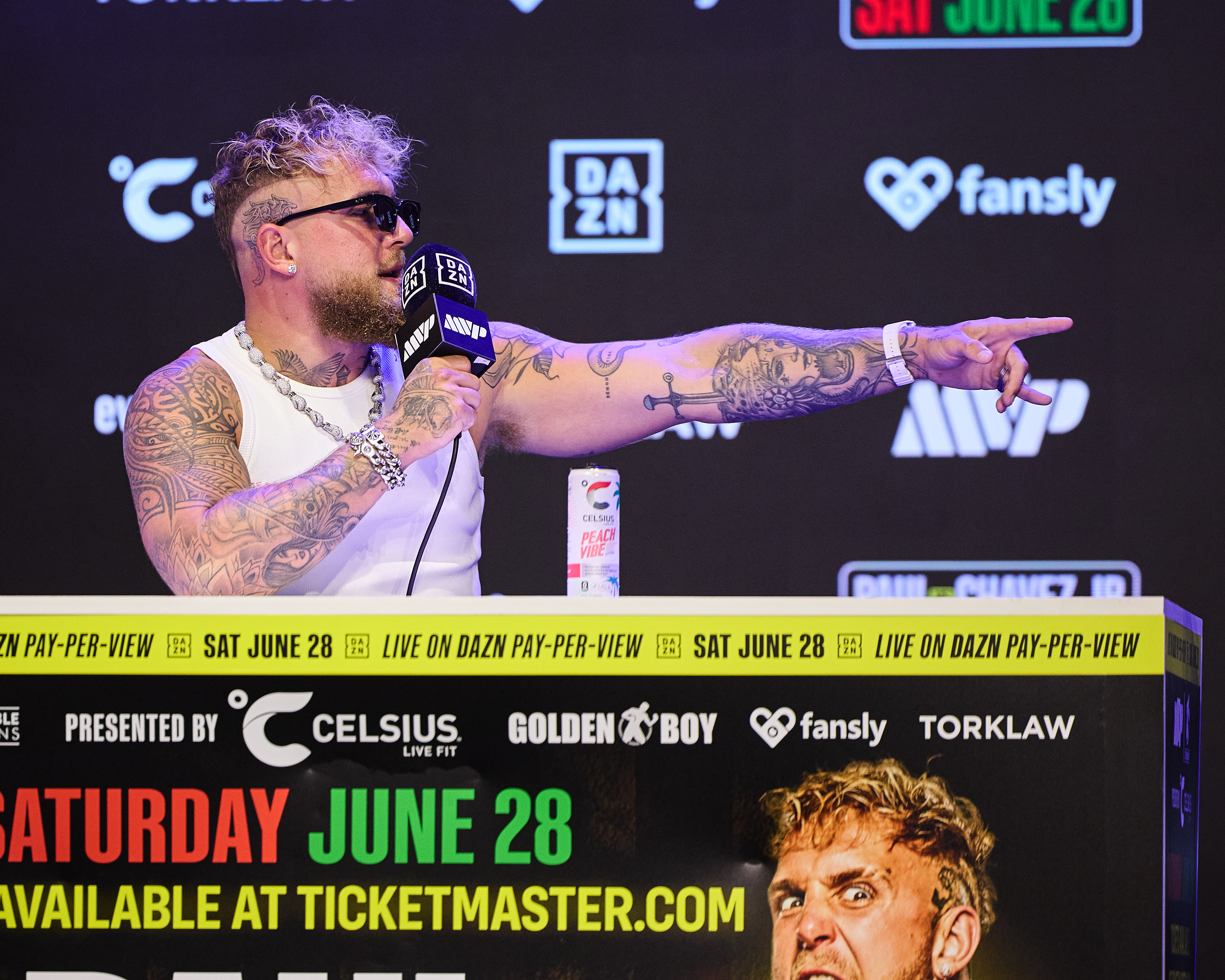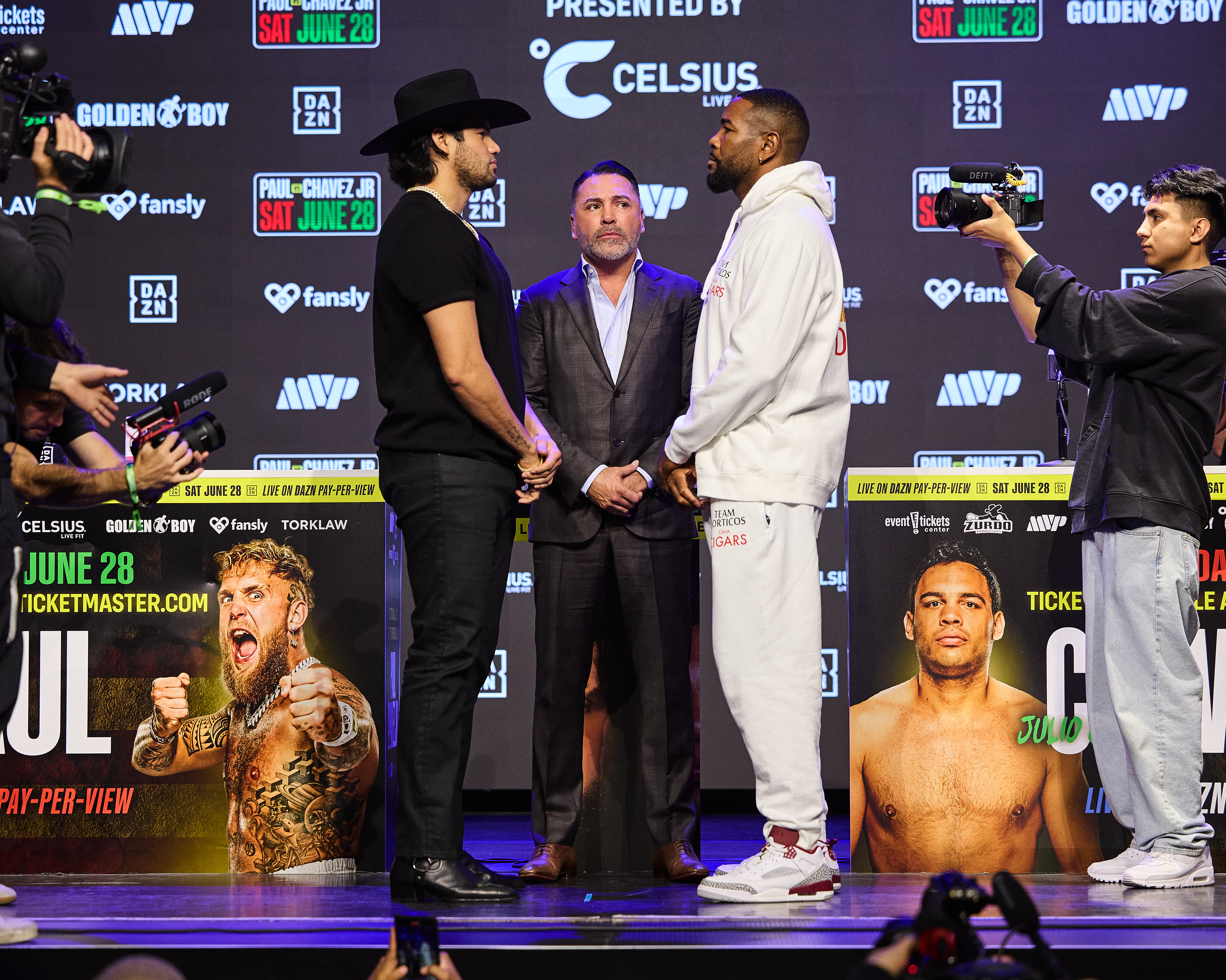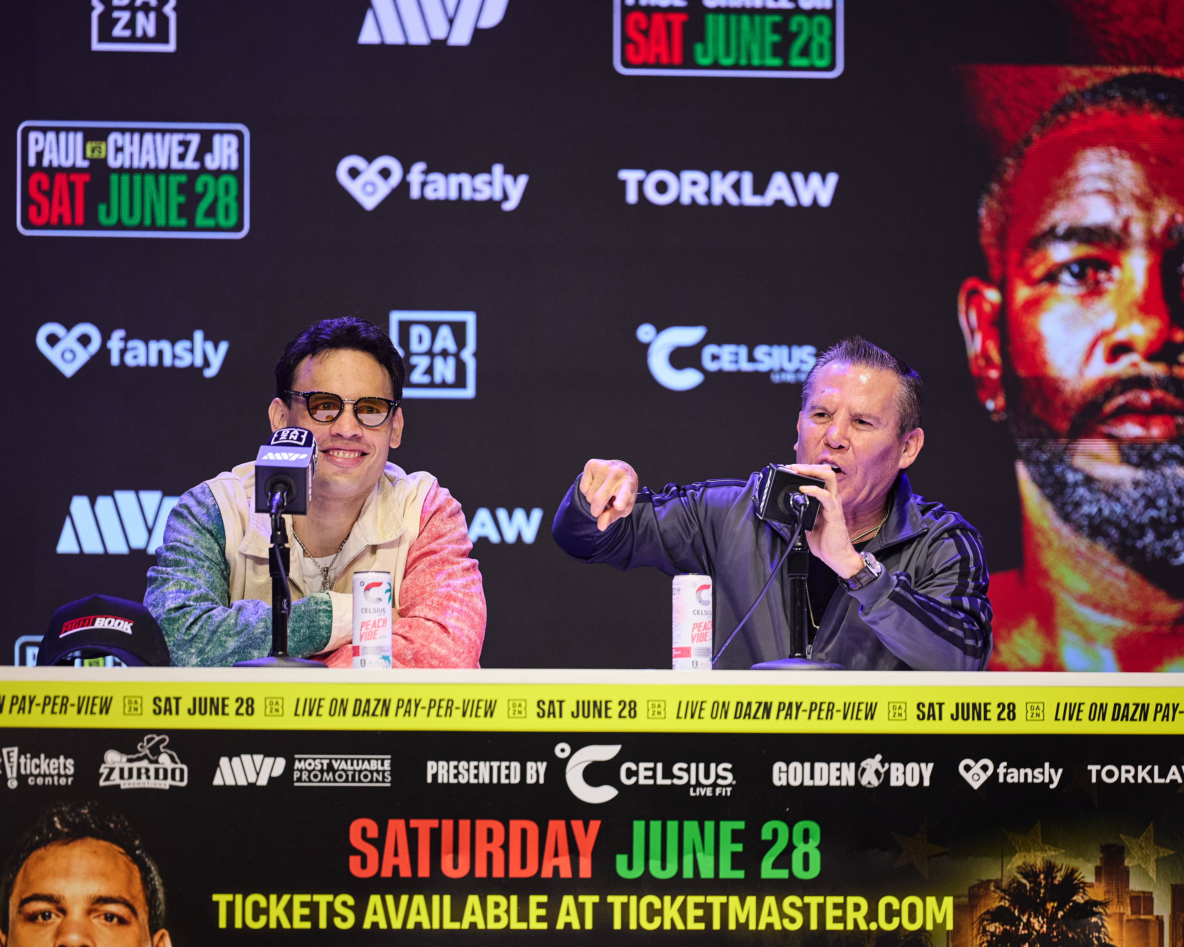 LOS ANGELES, CA – Today at the Avalon Hollywood Theater in Los Angeles, CA, The Problem Child, Jake “El Gallo de Dorado” Paul (11-1, 7 KOs) and Mexico’s former champion Julio Cesar Chavez Jr. (54-6-1, 34 KOs) met face-to-face to preview their highly anticipated Most Valuable Promotions (MVP) bout. This event will air live globally on DAZN pay-per-view on Saturday, June 28, from Honda Center in Anaheim, California, and is presented by CELSIUS Live Fit Essential Energy with Golden Boy Promotions serving as an official licensed promoter. Paul vs. Chavez is also sponsored by Event Ticket Center and Fansly. All tickets are on sale now via Ticketmaster