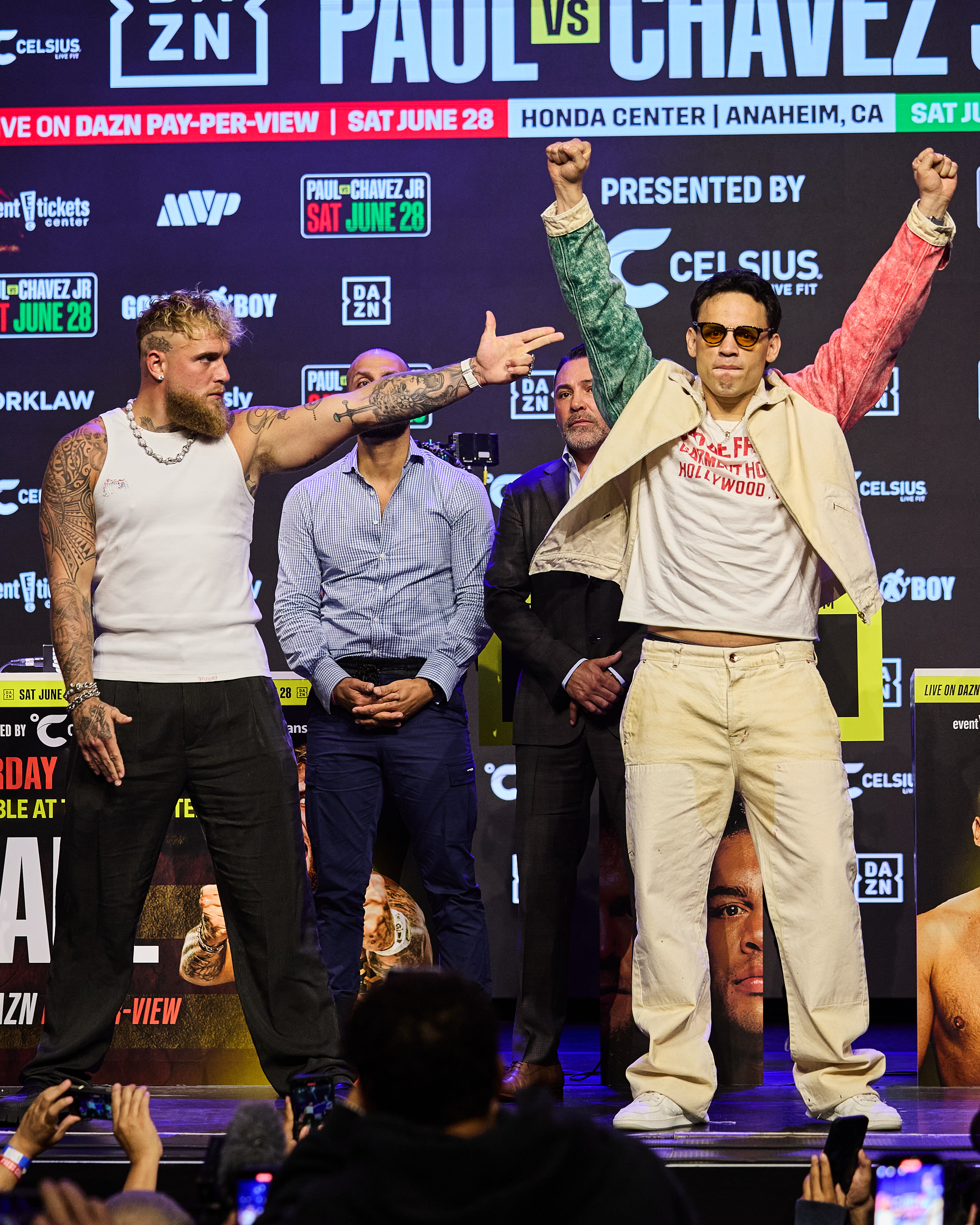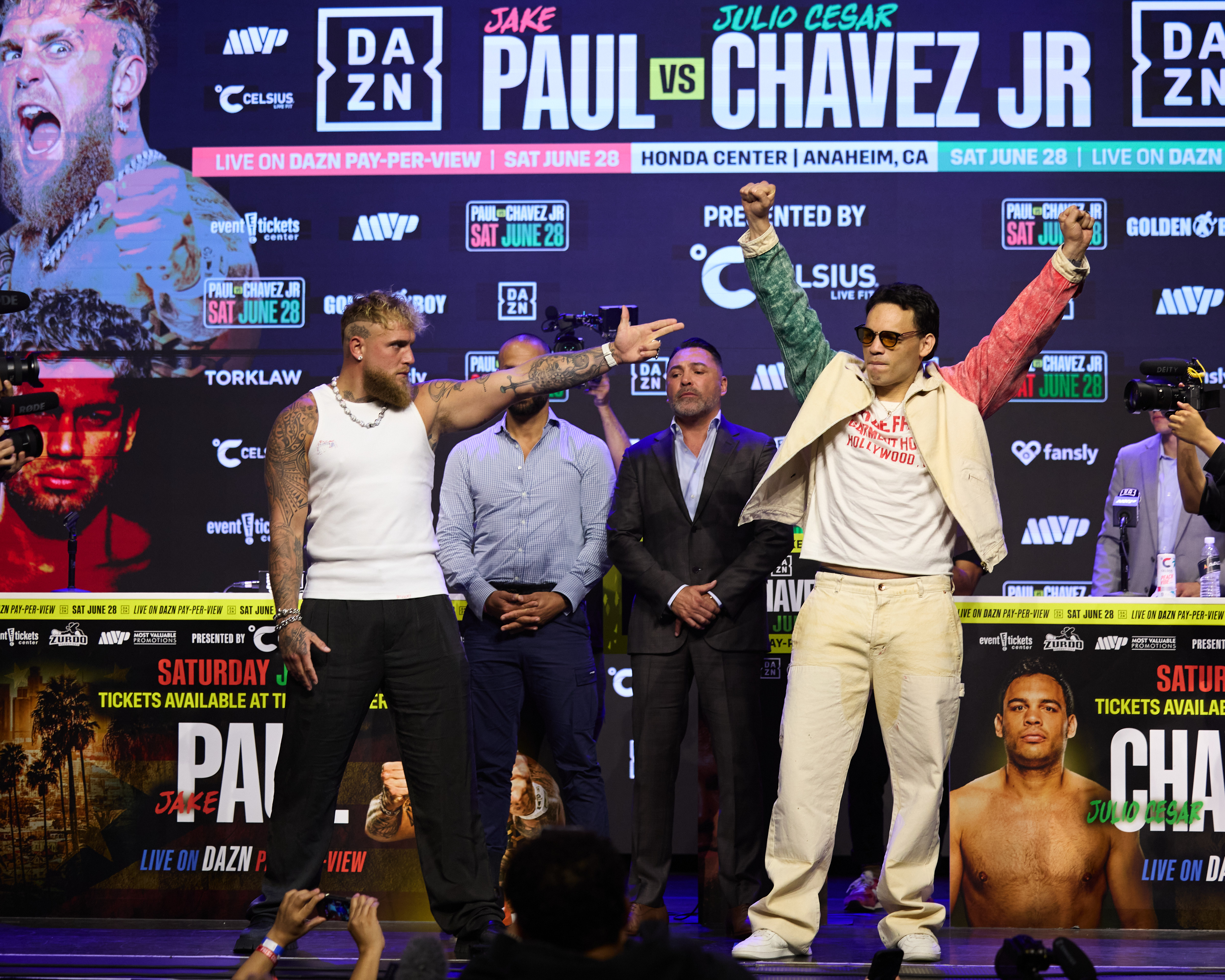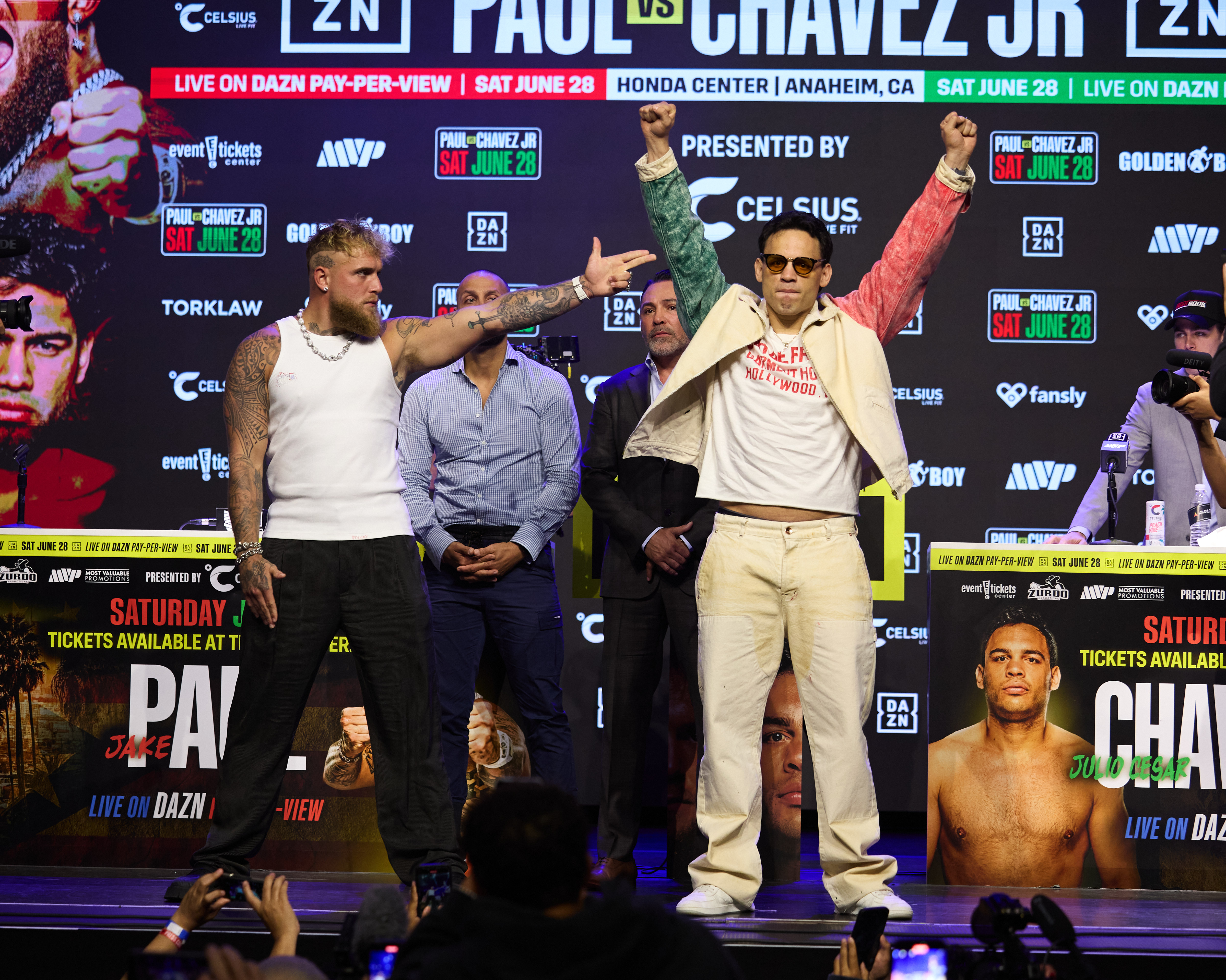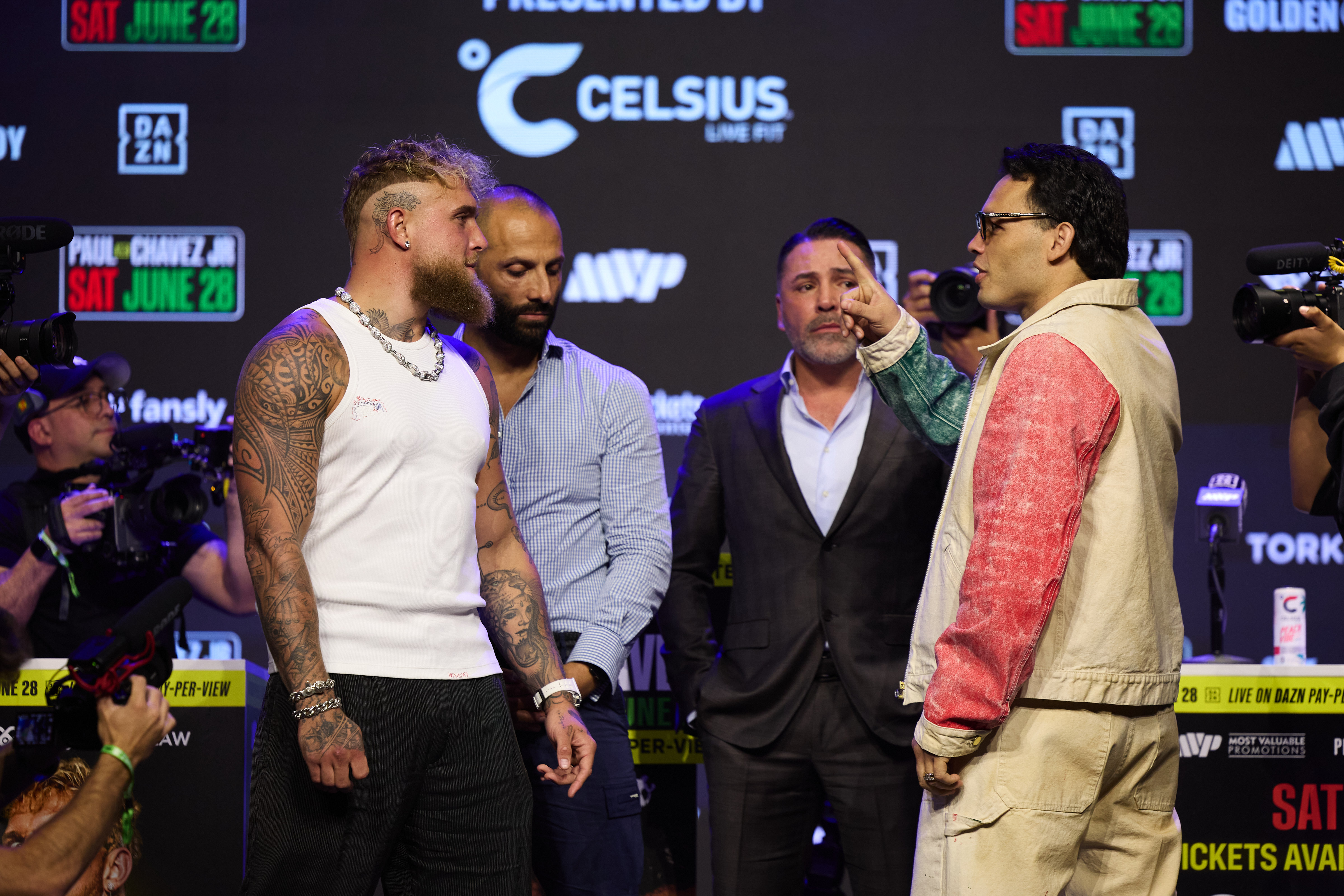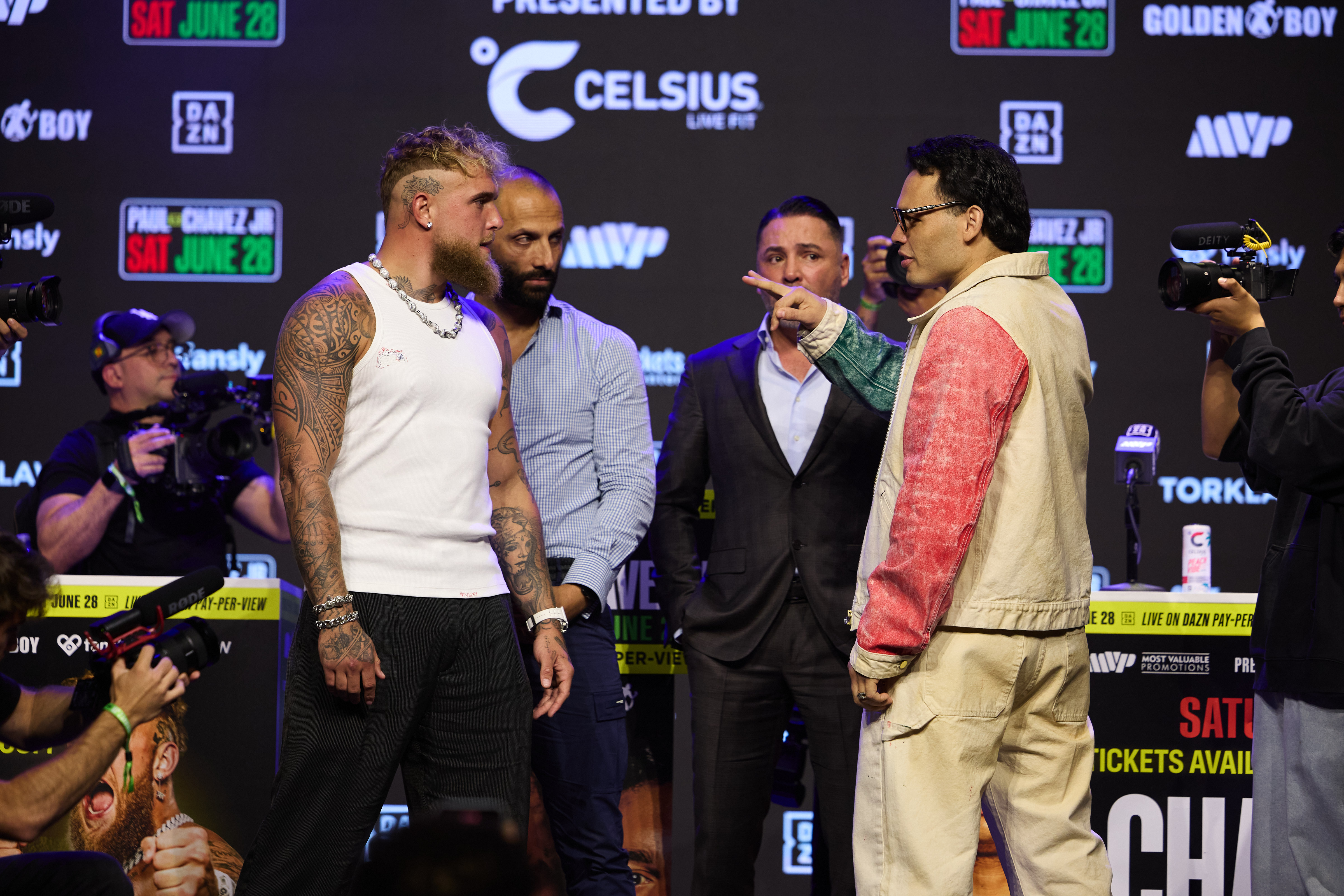 LOS ANGELES, CA – Today at the Avalon Hollywood Theater in Los Angeles, CA, The Problem Child, Jake “El Gallo de Dorado” Paul (11-1, 7 KOs) and Mexico’s former champion Julio Cesar Chavez Jr. (54-6-1, 34 KOs) met face-to-face to preview their highly anticipated Most Valuable Promotions (MVP) bout. This event will air live globally on DAZN pay-per-view on Saturday, June 28, from Honda Center in Anaheim, California, and is presented by CELSIUS Live Fit Essential Energy with Golden Boy Promotions serving as an official licensed promoter. Paul vs. Chavez is also sponsored by Event Ticket Center and Fansly. All tickets are on sale now via Ticketmaster