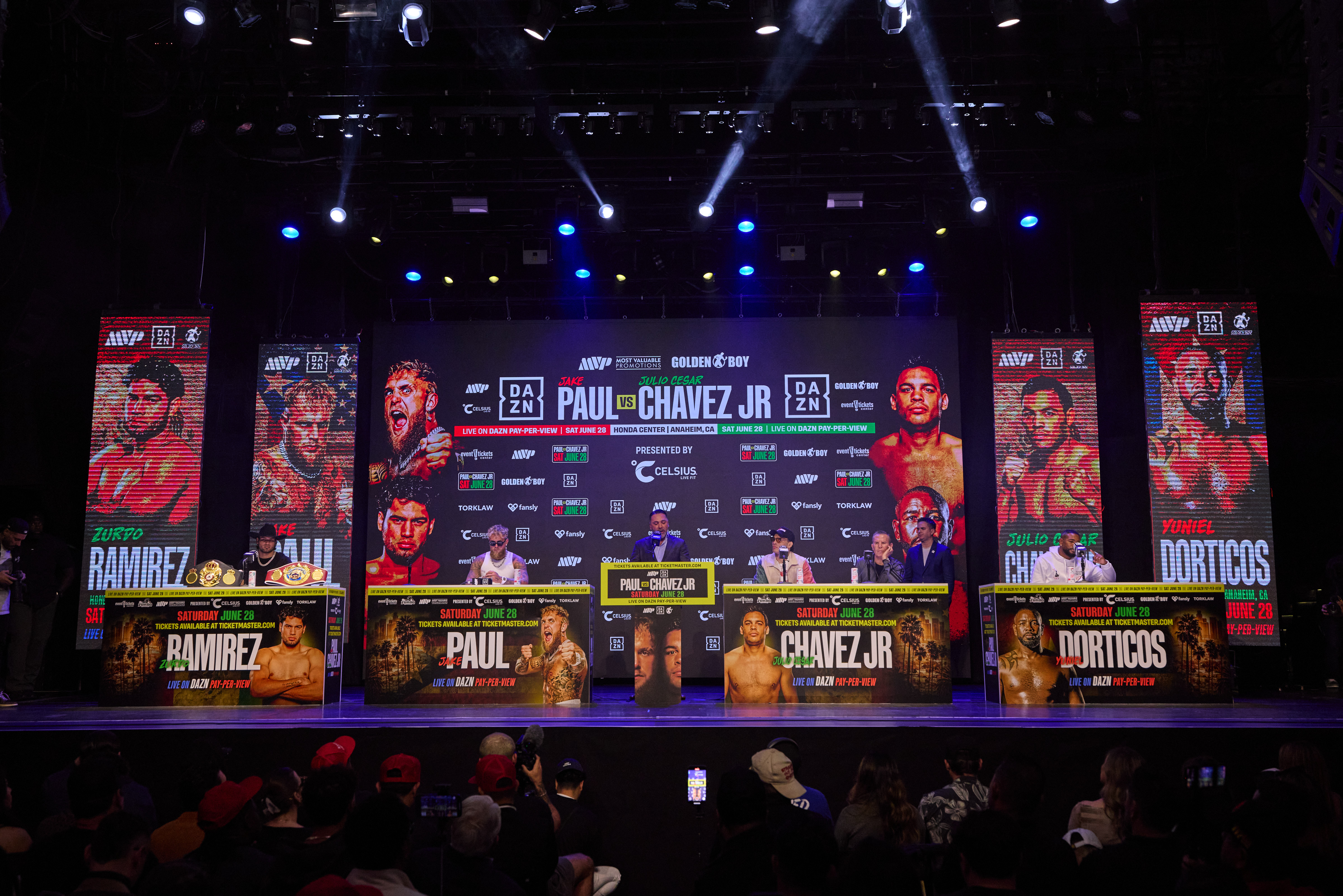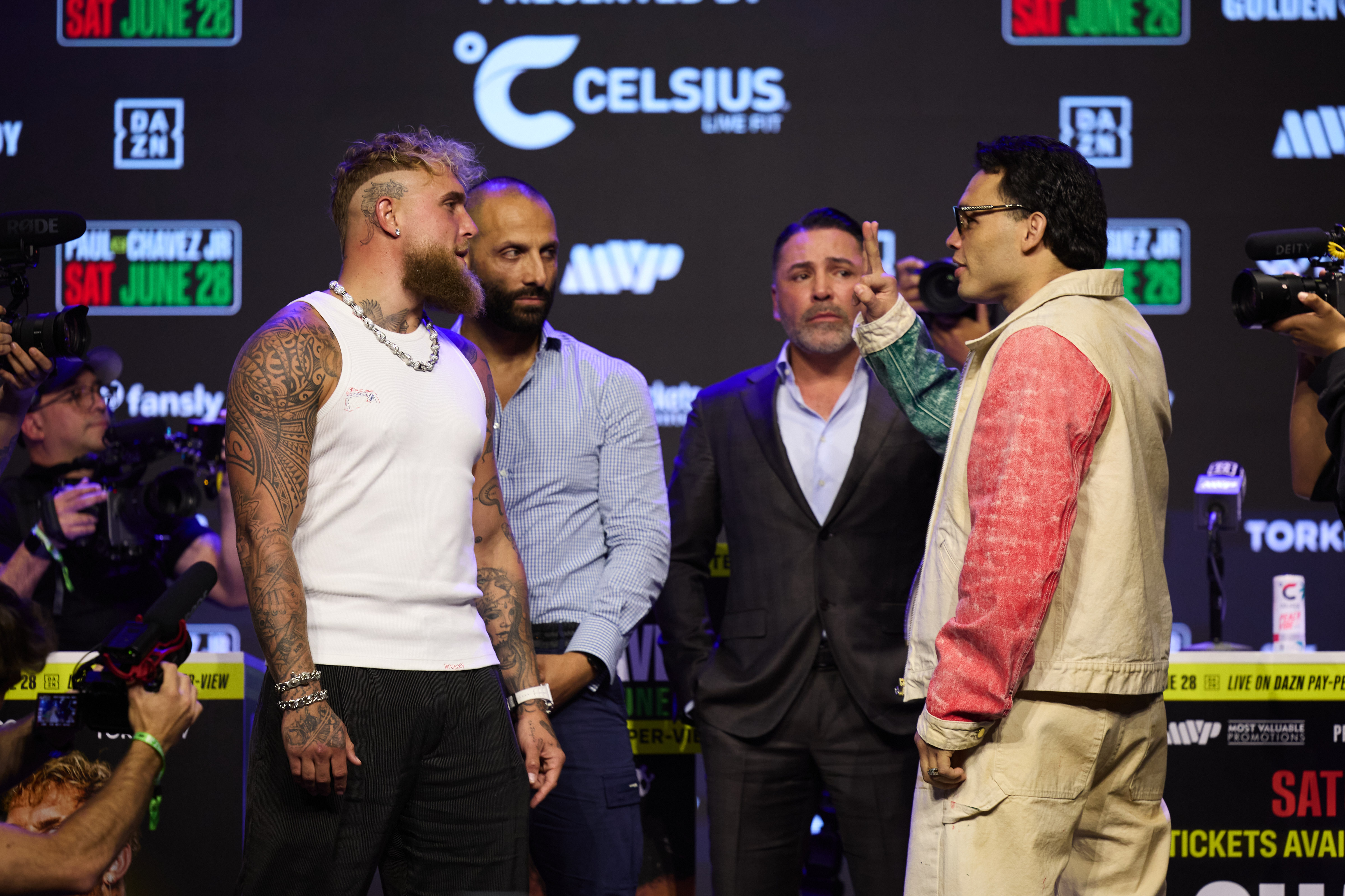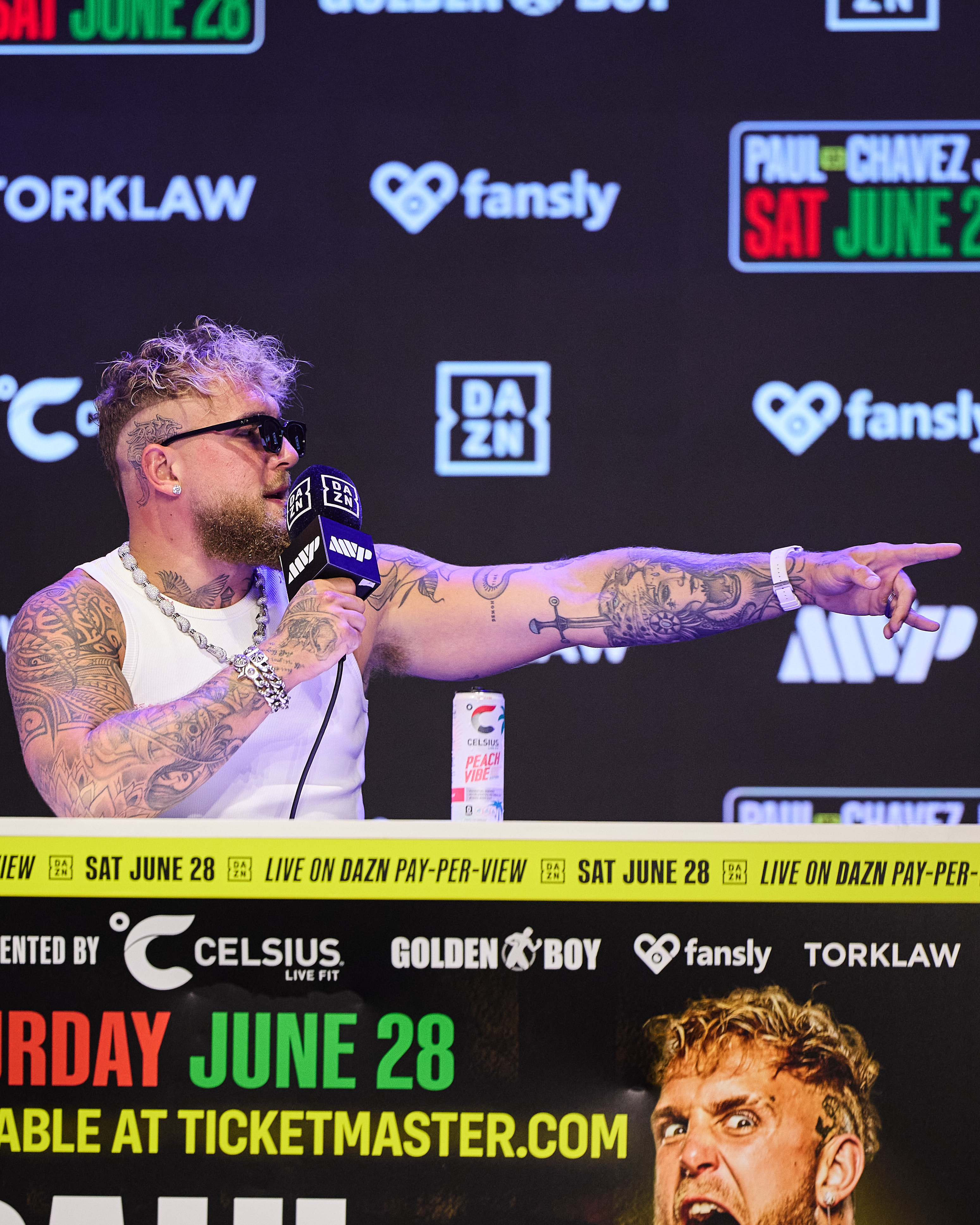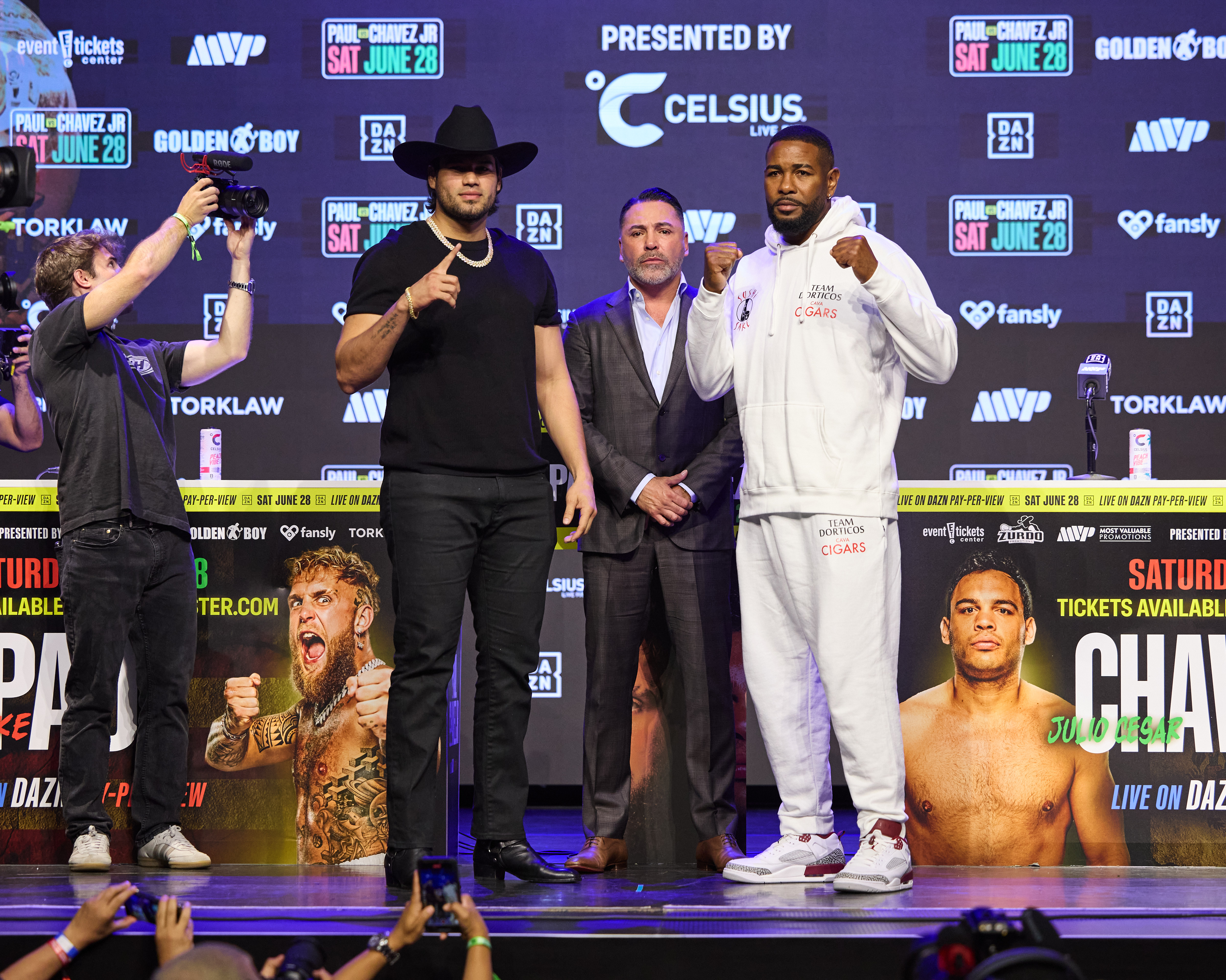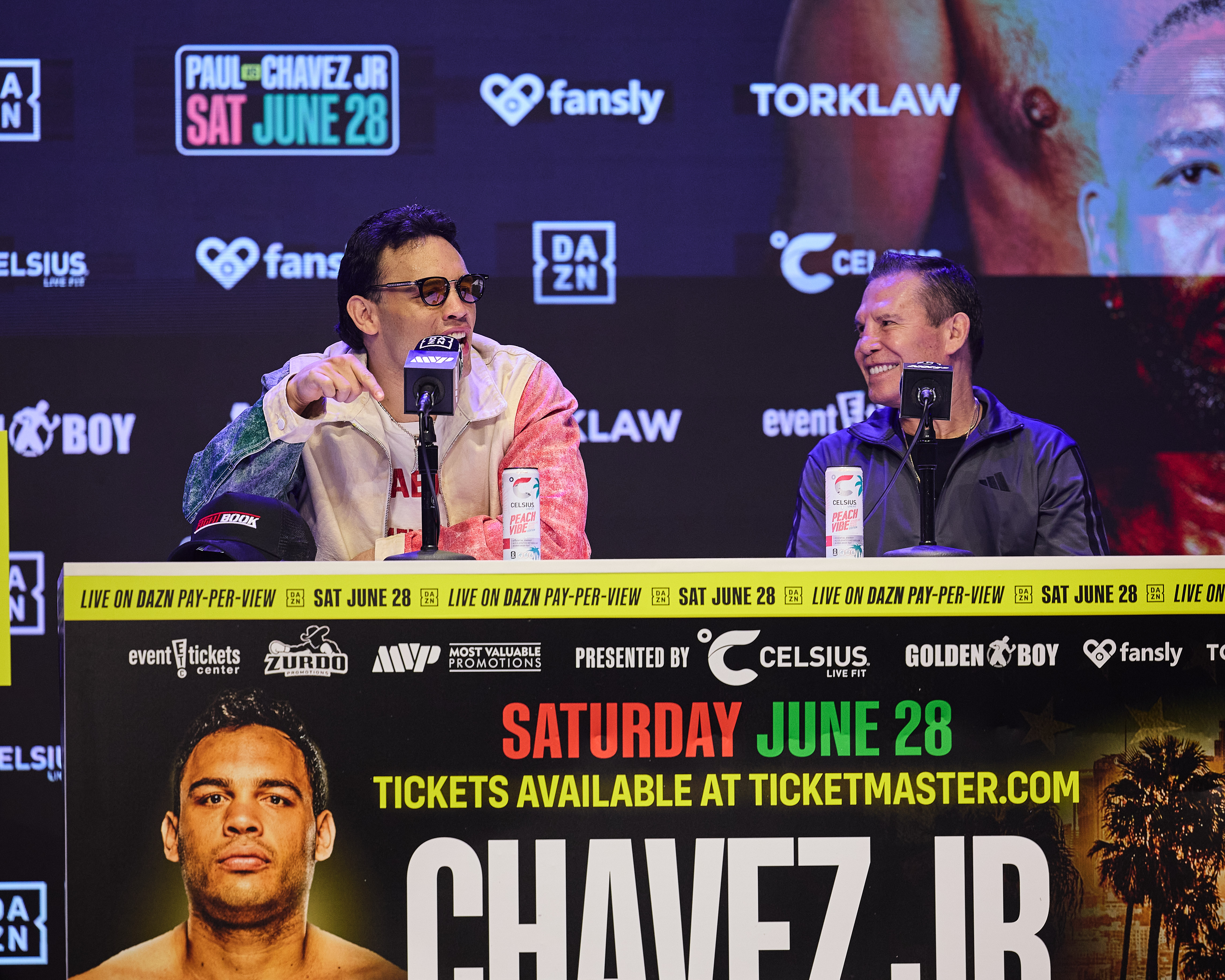 LOS ANGELES, CA – Today at the Avalon Hollywood Theater in Los Angeles, CA, The Problem Child, Jake “El Gallo de Dorado” Paul (11-1, 7 KOs) and Mexico’s former champion Julio Cesar Chavez Jr. (54-6-1, 34 KOs) met face-to-face to preview their highly anticipated Most Valuable Promotions (MVP) bout. This event will air live globally on DAZN pay-per-view on Saturday, June 28, from Honda Center in Anaheim, California, and is presented by CELSIUS Live Fit Essential Energy with Golden Boy Promotions serving as an official licensed promoter. Paul vs. Chavez is also sponsored by Event Ticket Center and Fansly. All tickets are on sale now via Ticketmaster